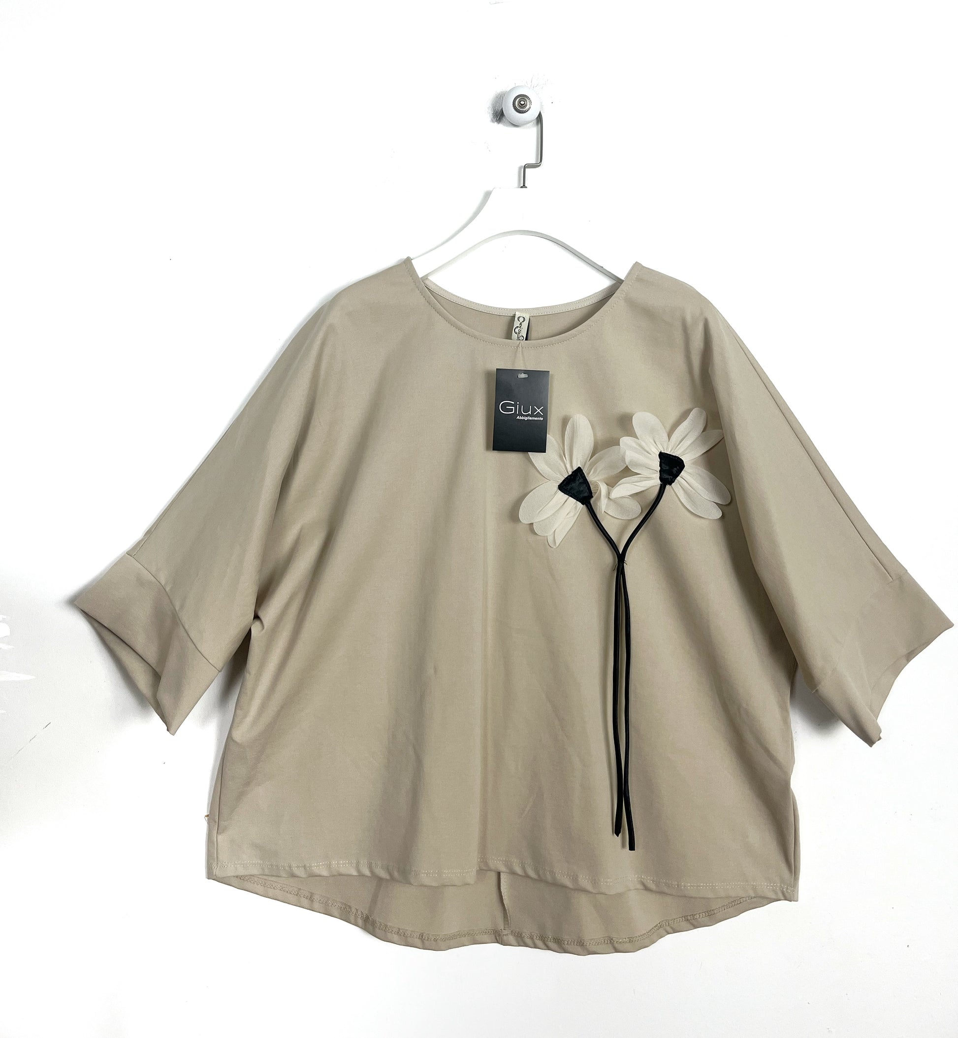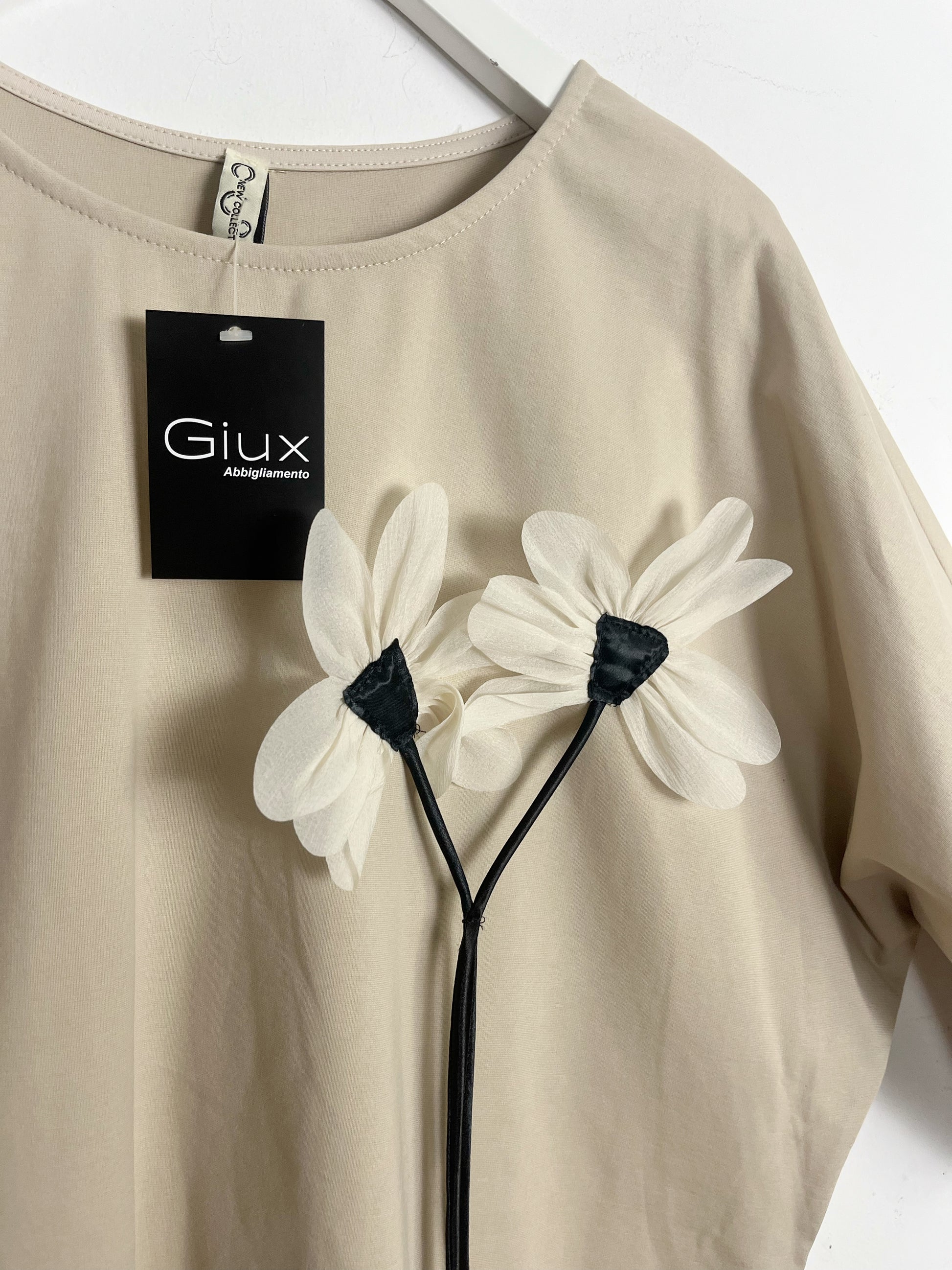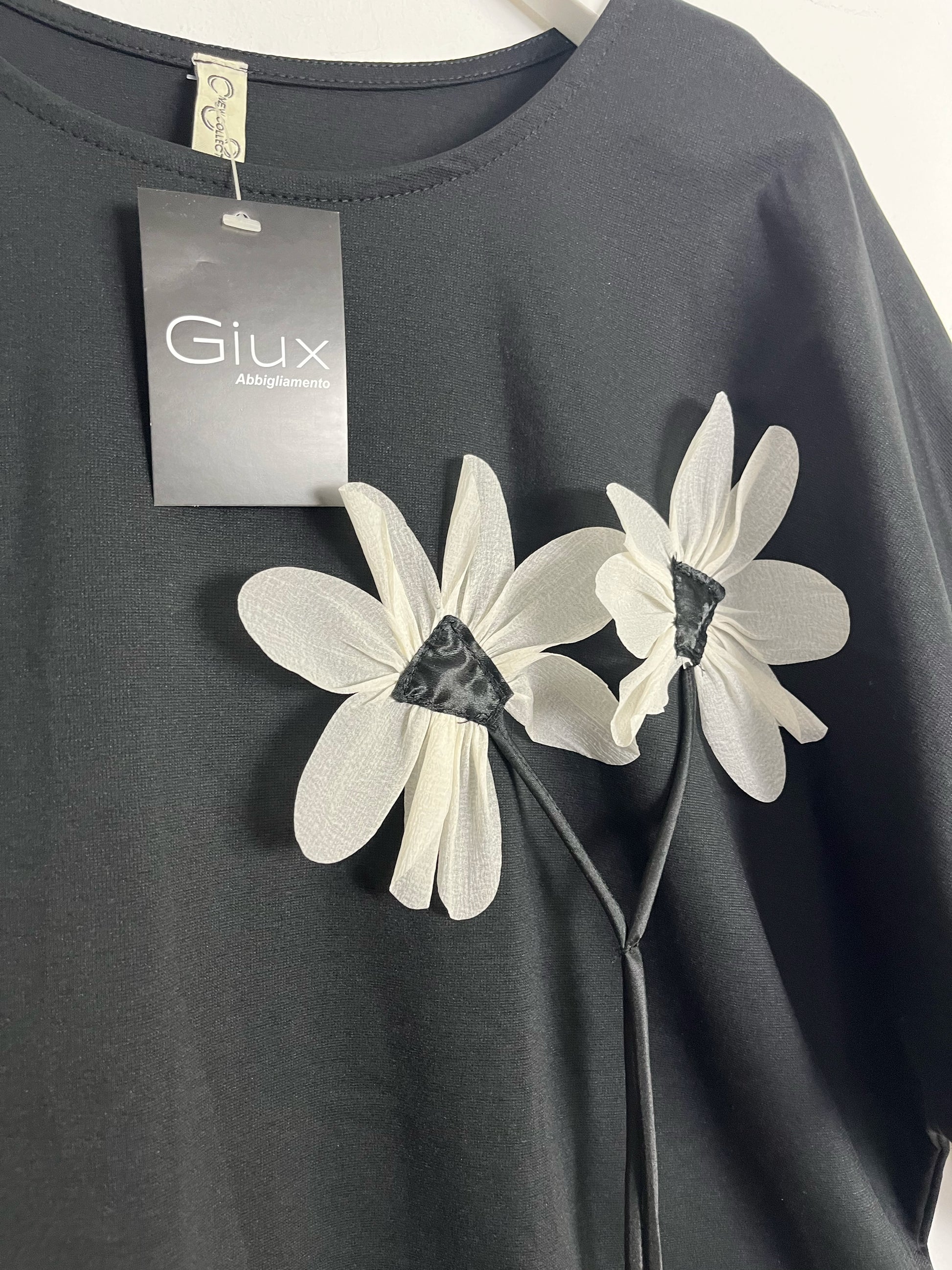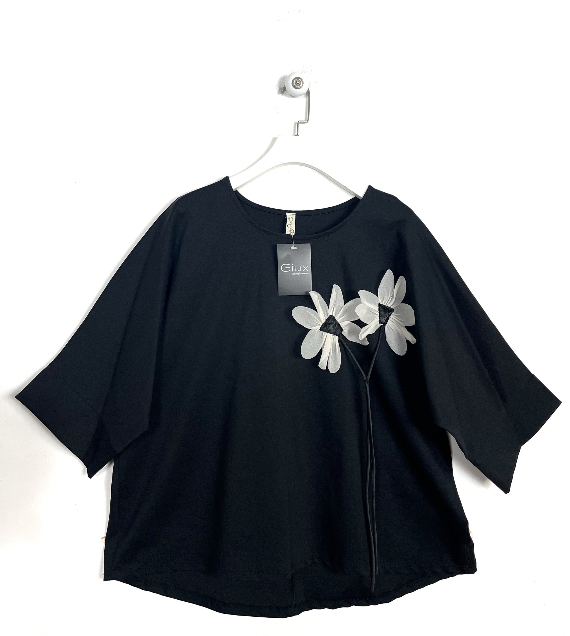 Blusa girocollo in punto milano di cotone. Spalla ribassata, morbida sul seno, manica tre quarti. Fiore applicato sul davanti