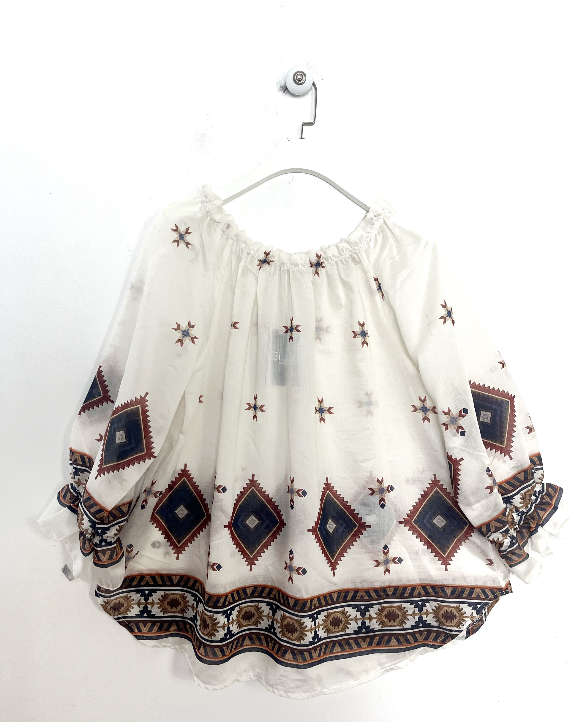 Blusa in leggerissimo Tencel. Arricciatura con elastico nella scollatura, spalle di fuori.