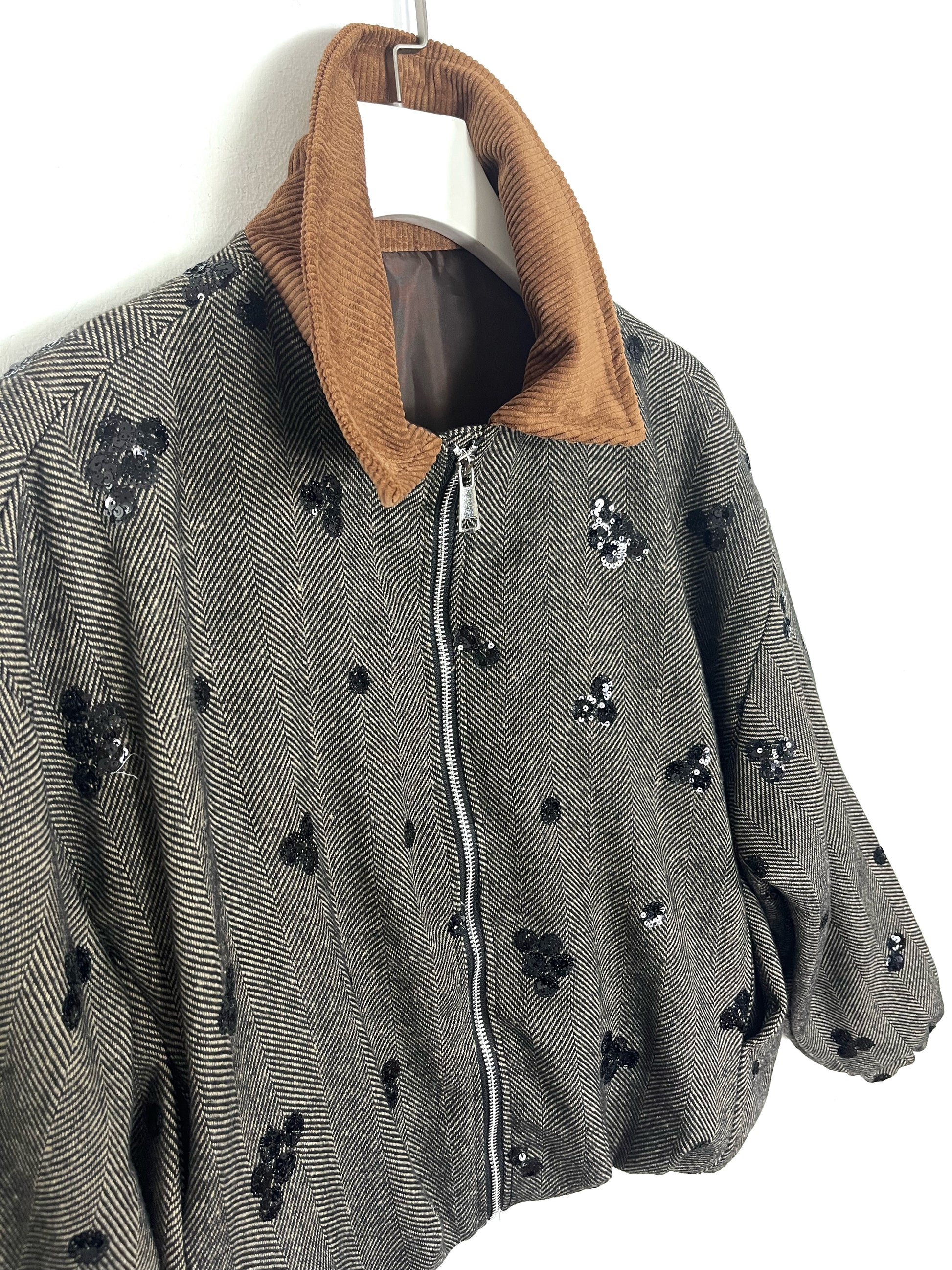 Bomberino in tessuto spigato, con paillettes applicate. Spalla ribassata. Fondo arricciato E maniche lunghe chiuse con elastico. Tasche a scomparsa sul davanti. Foderato. Colletto in tessuto in contrasto, in velluto a costine. Cropped