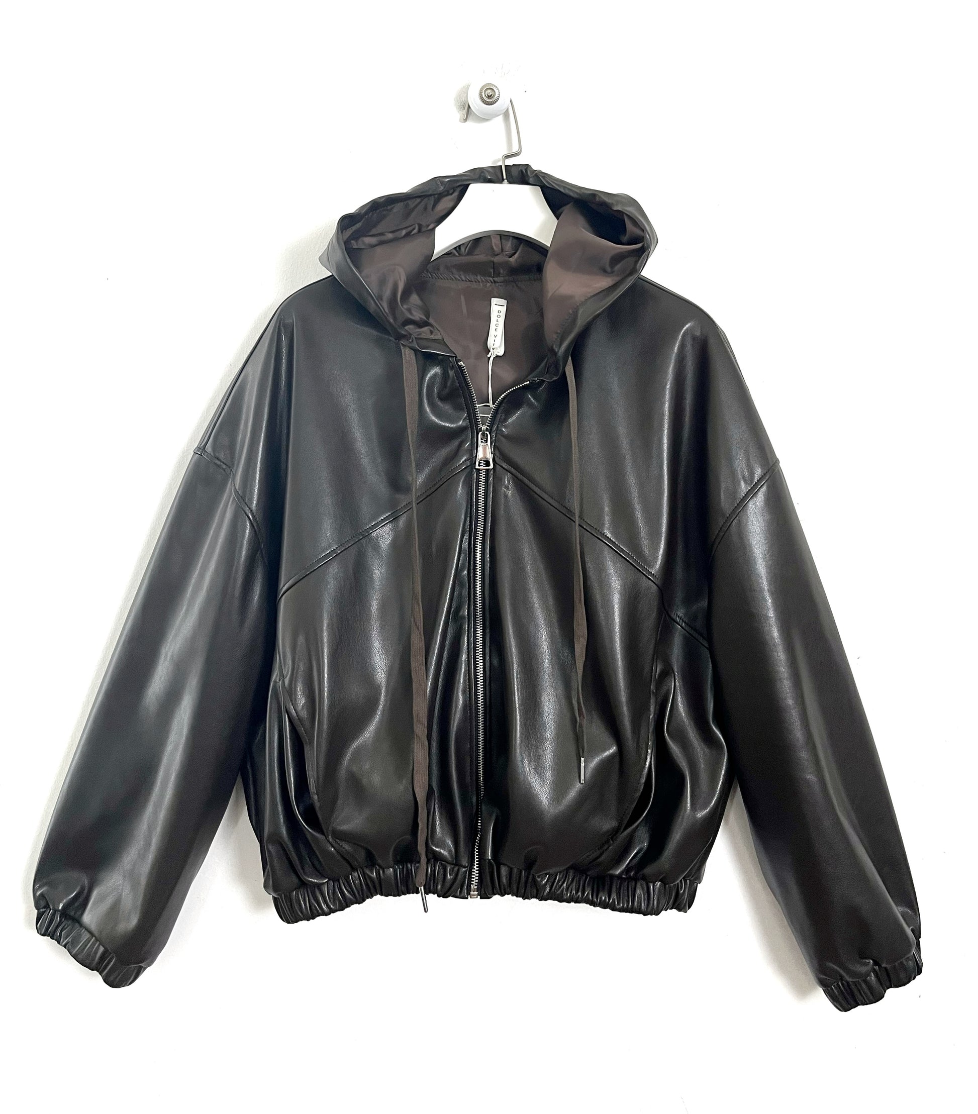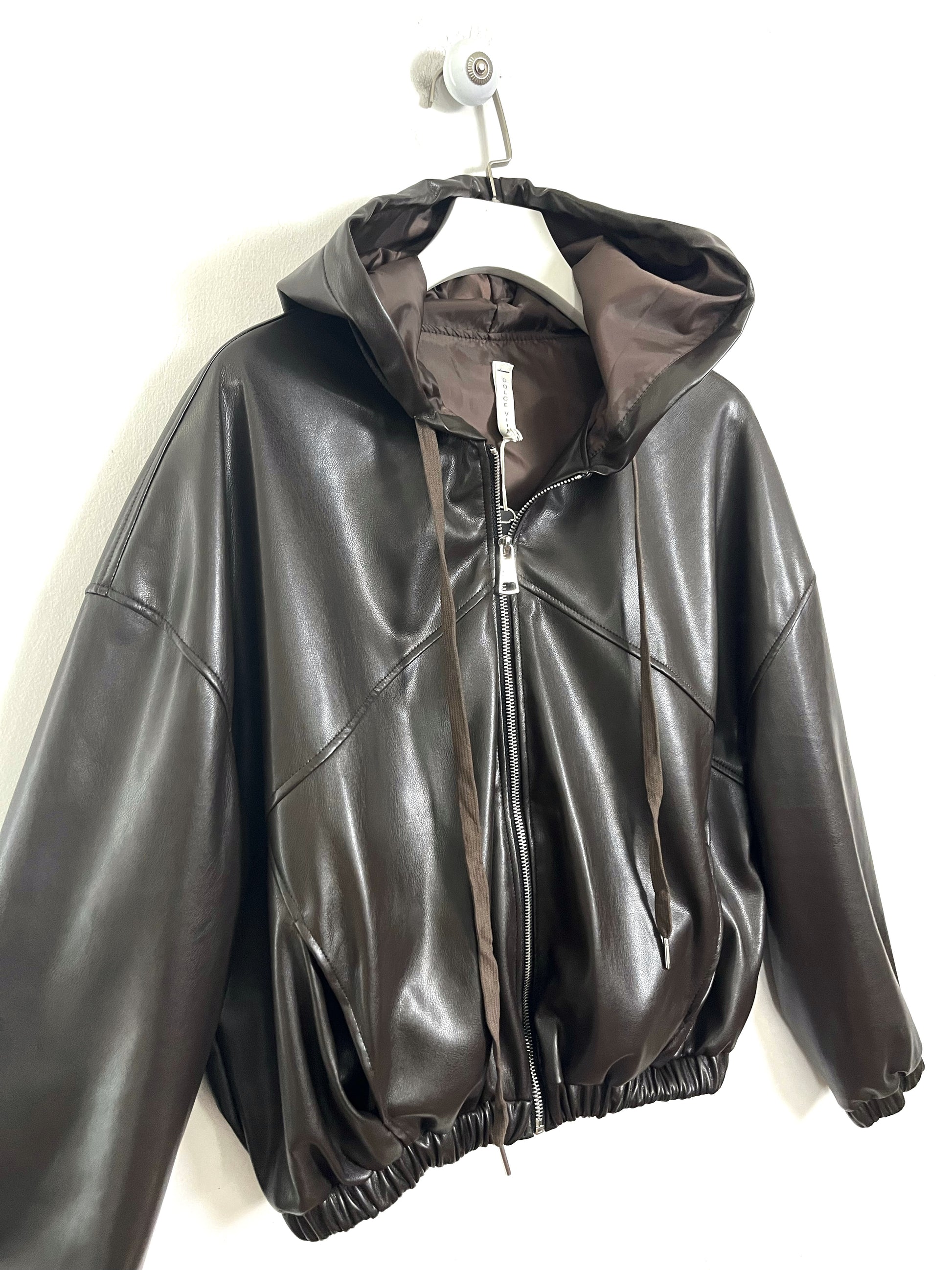 Bomber in ecopelle con cappuccio. Spalla ribassata. Fondo arricciato E maniche a sbuffo. Foderato. Cropped