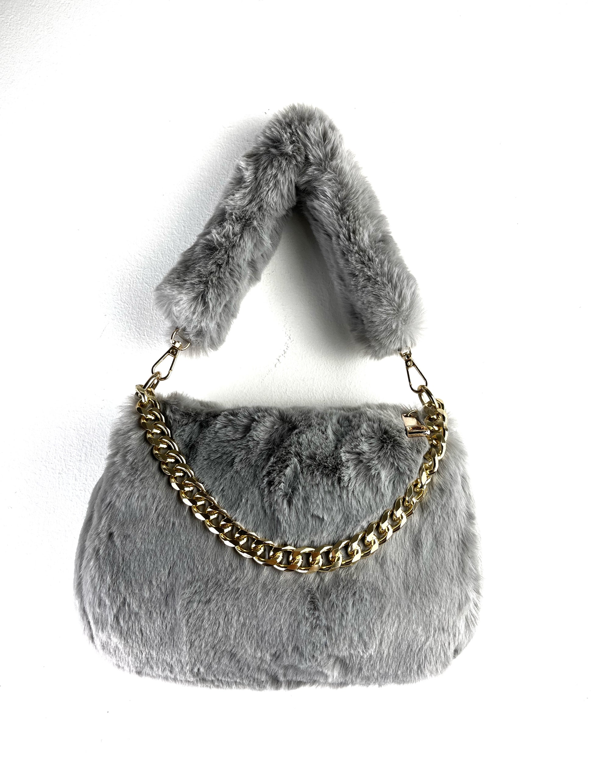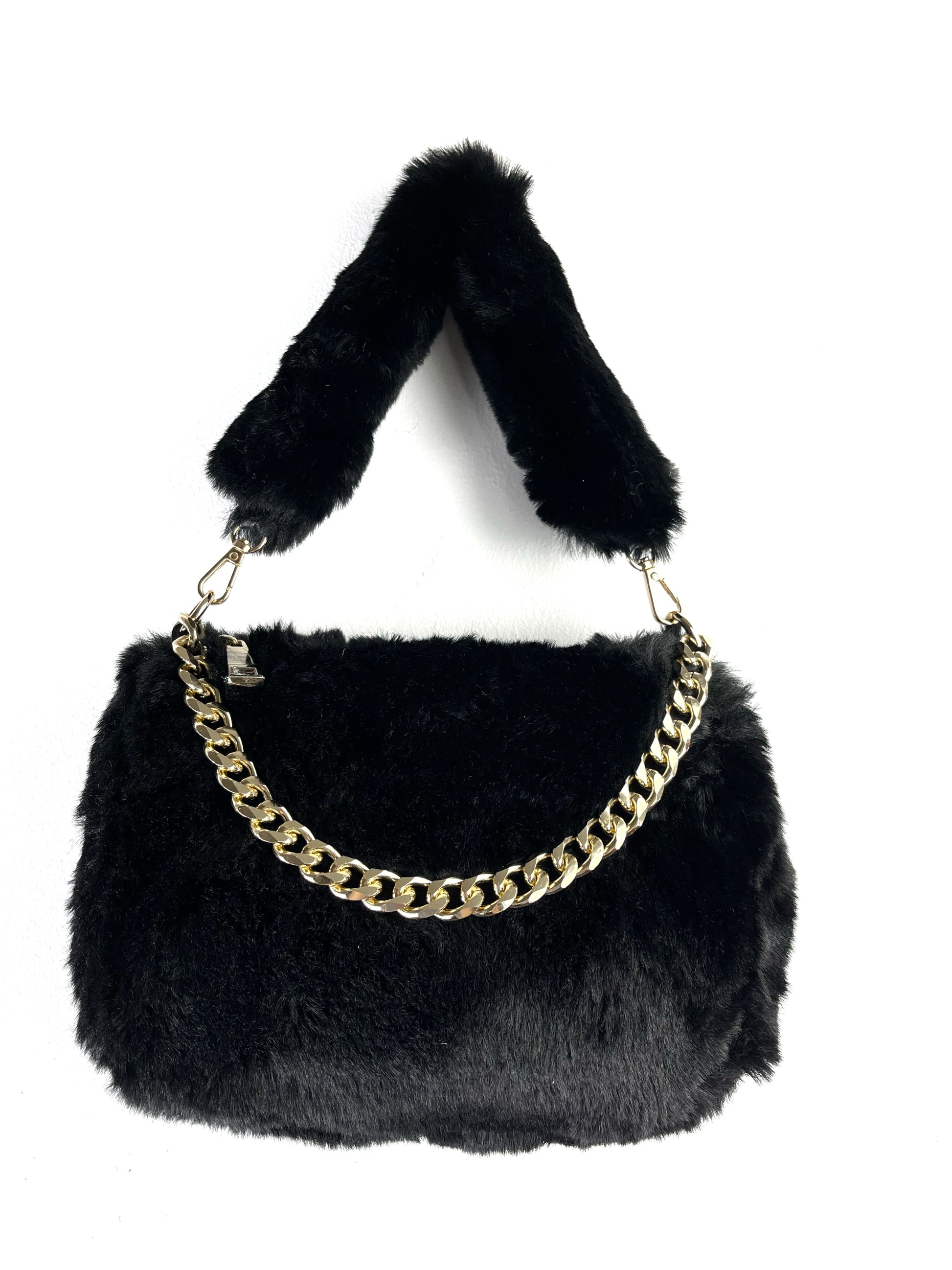 Borsa in ecopelliccia. Chiusura con cerniera. Catena dorata applicata. Manico in ecopelliccia. Tracolla fantasia inclusa. Taschina a scomparsa all’interno.