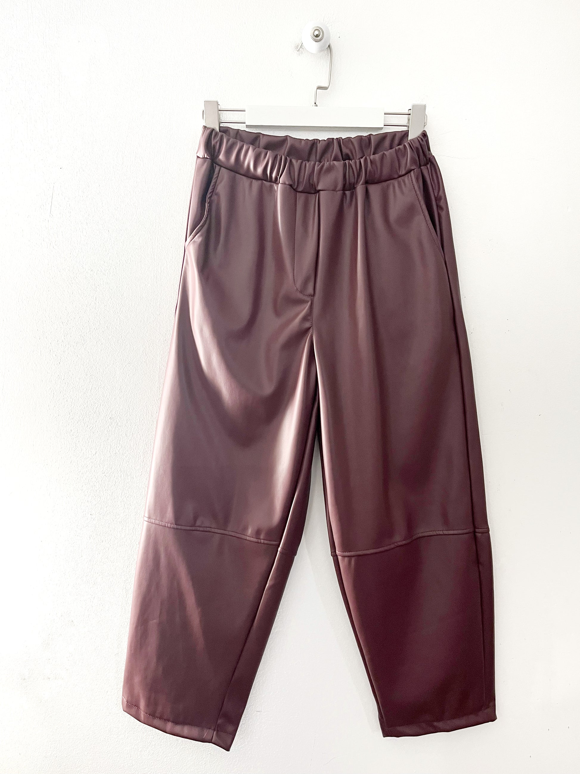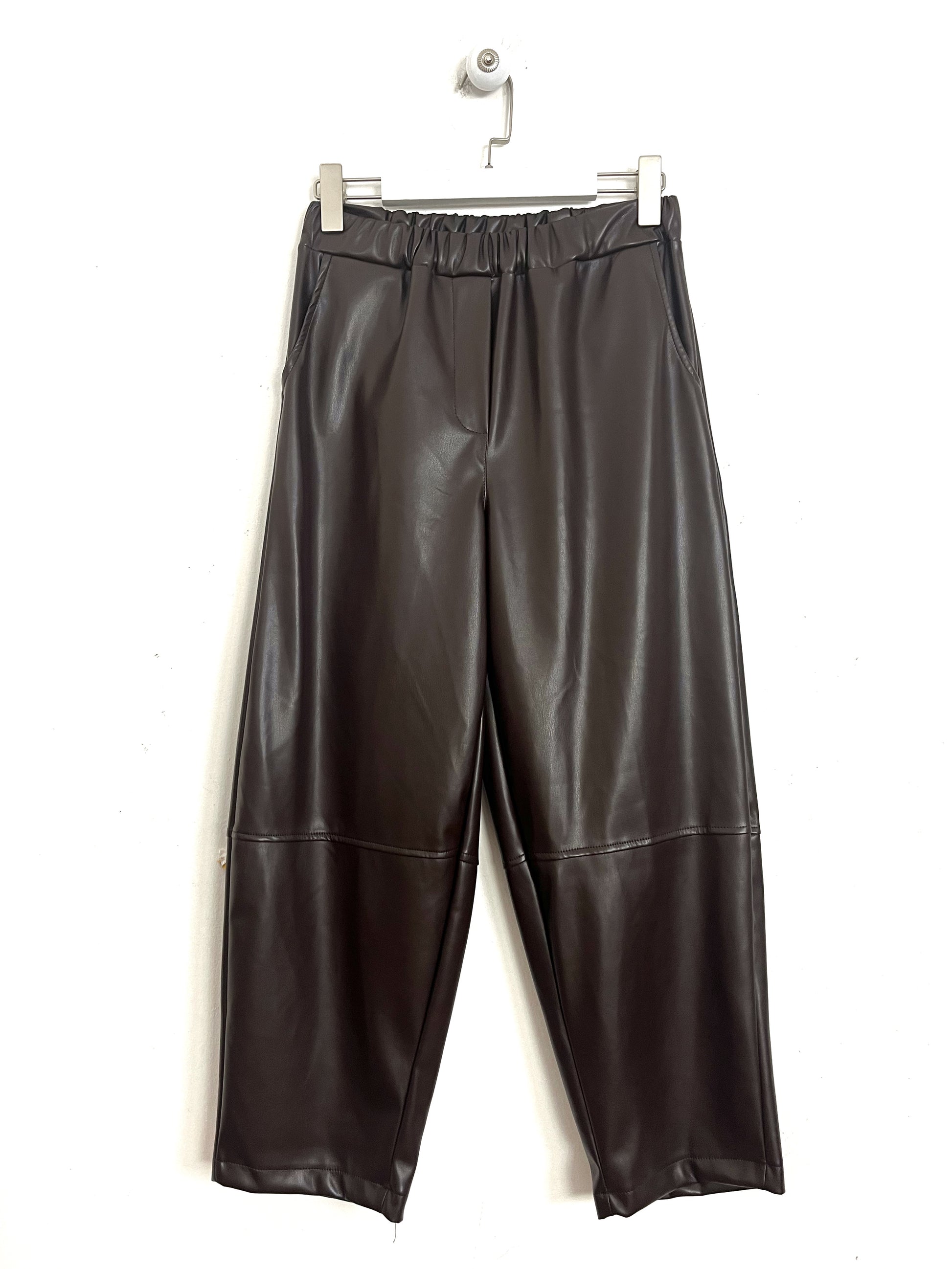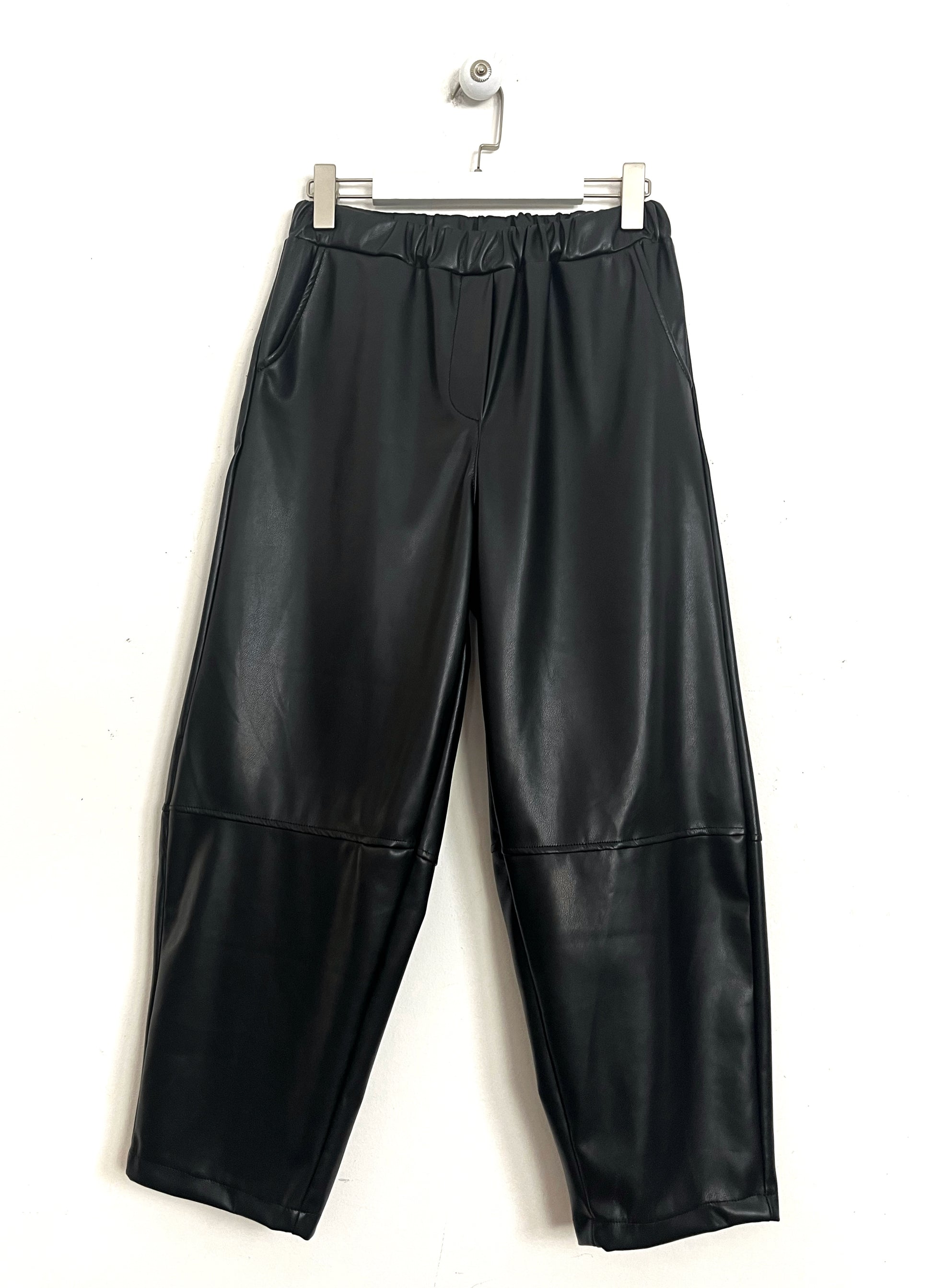 Pantalone boyfriend in ecopelle. Vita alta con elastico in vita. 2 tasche davanti oblique.