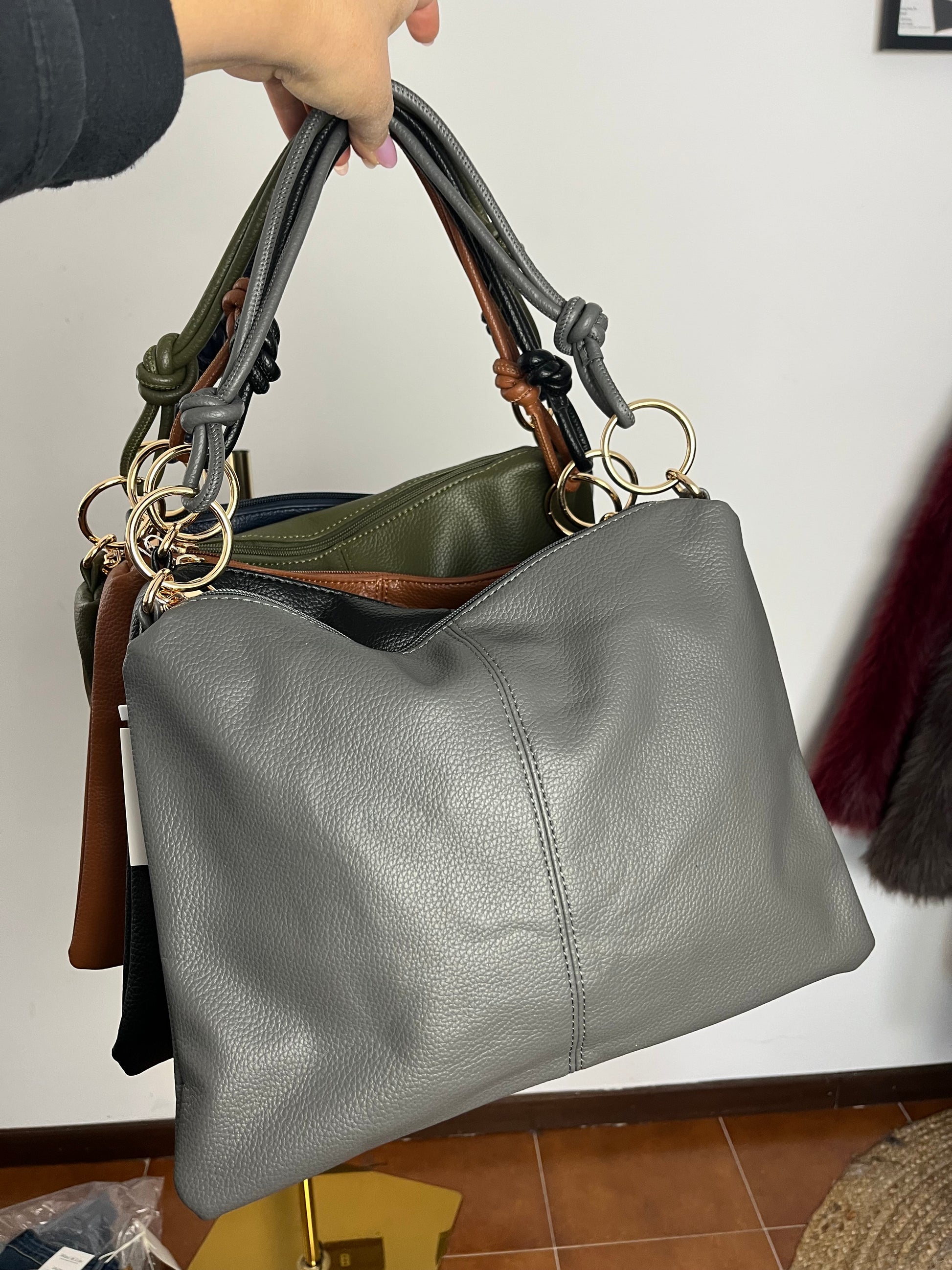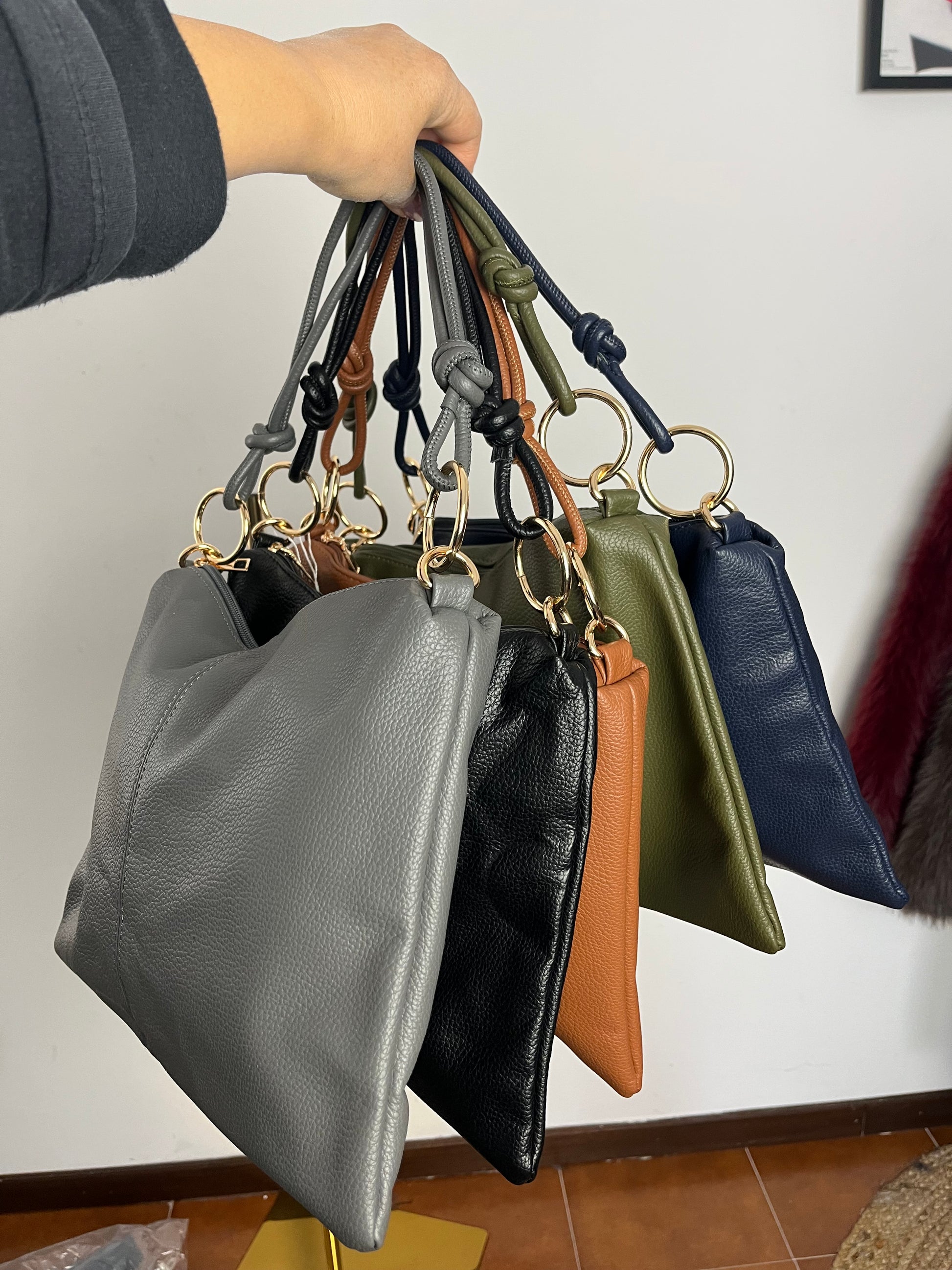 Bustina in ecopelle con manico e anelli in oro. Tracollina in dotazione