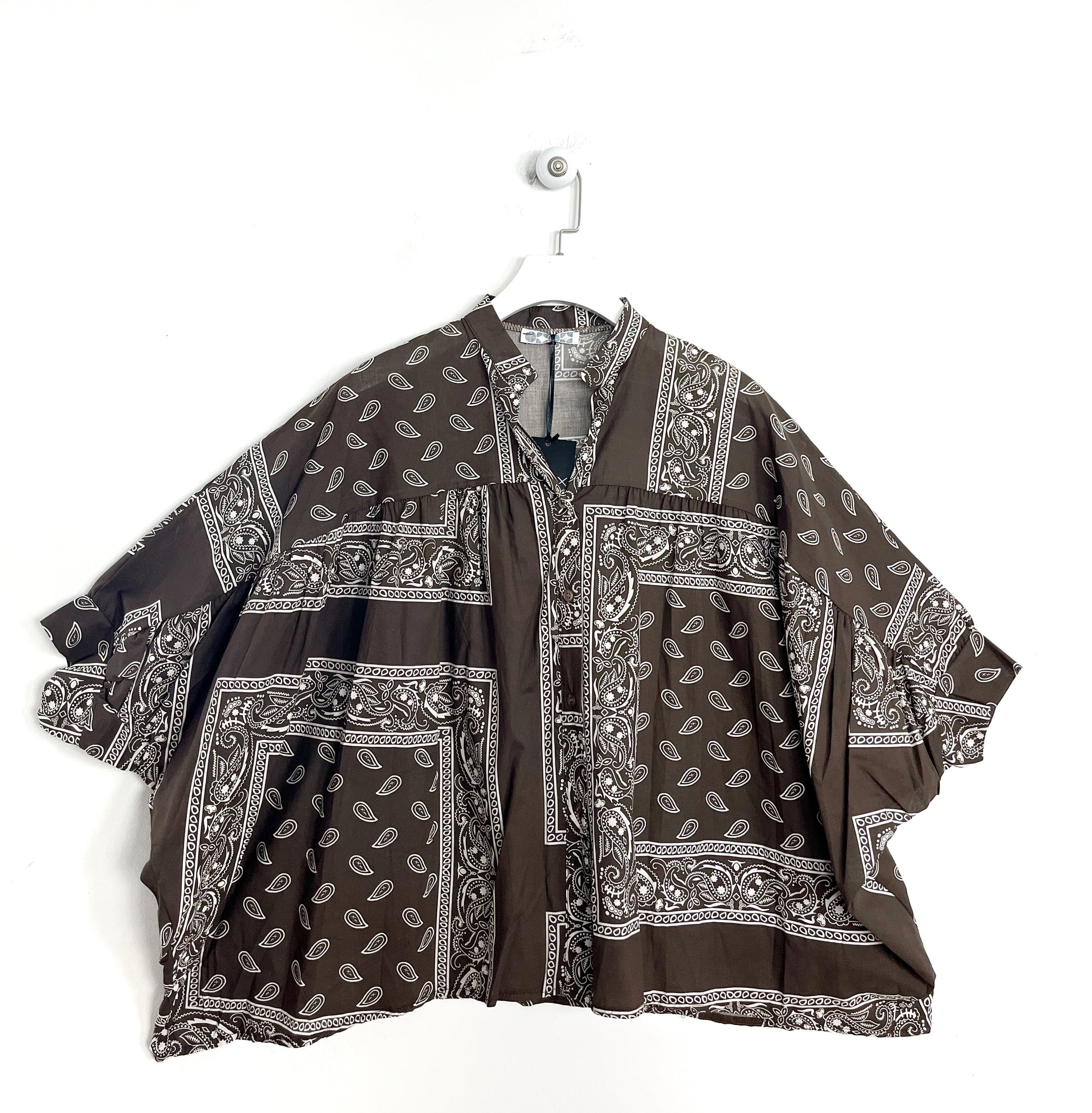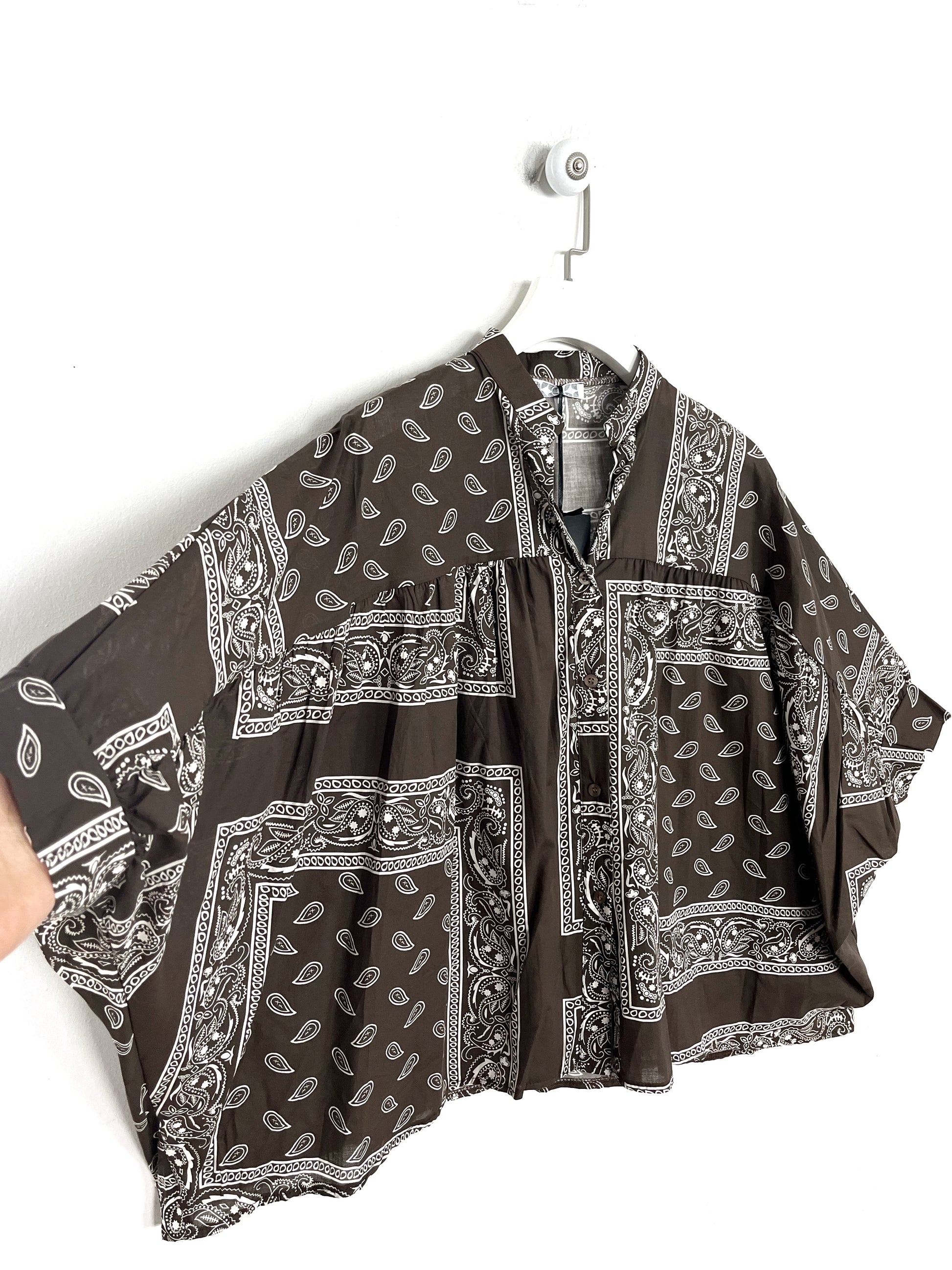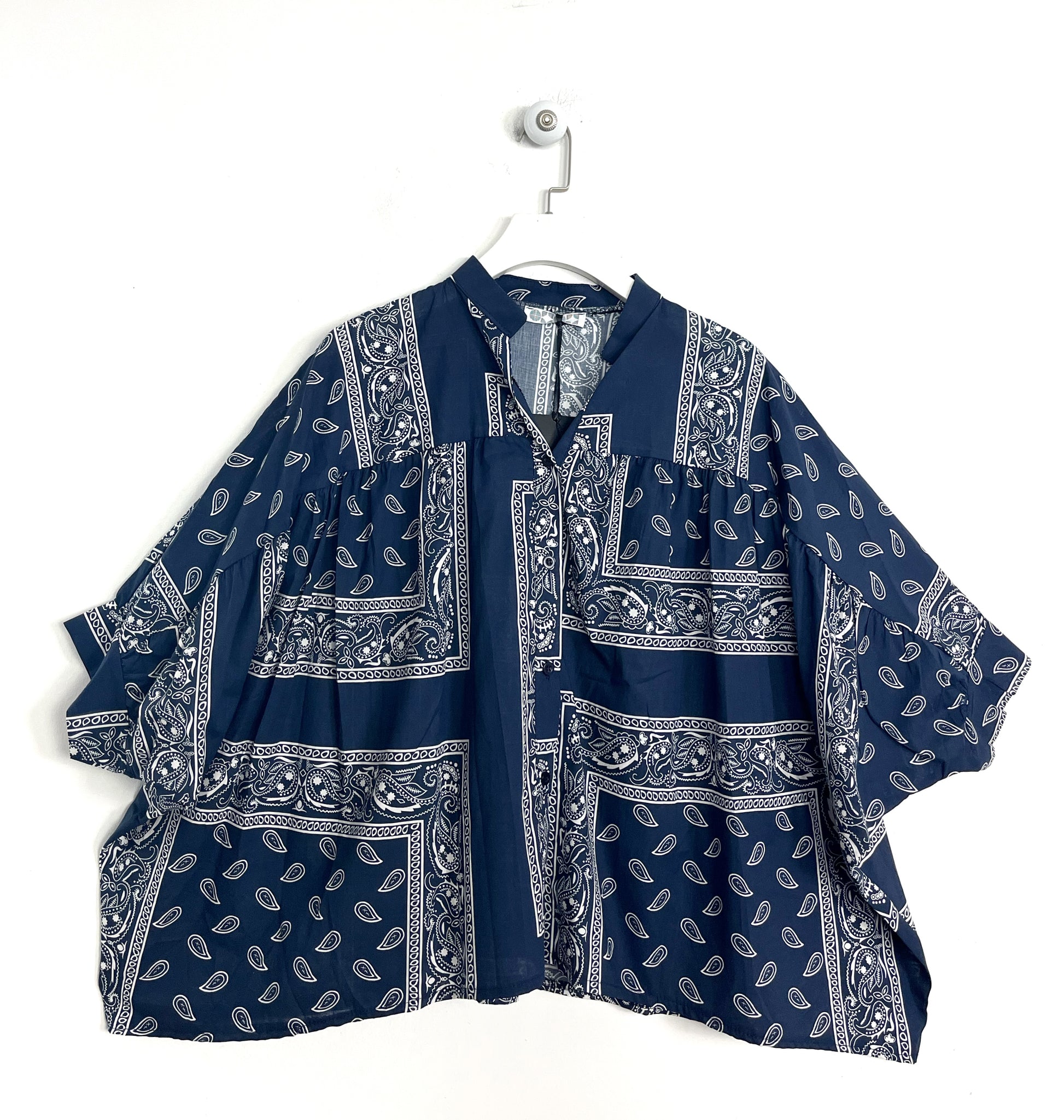 Camicia in cotone cropped in fantasia bandana. Mezza manica, abbottonata sul davanti.