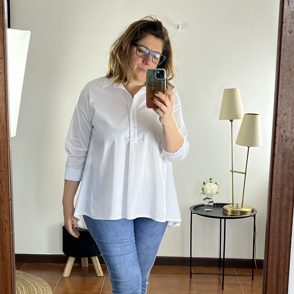 Camicia blusa di cotone oversize, con colletto e apertura con tre bottoni. Manica lunga risvoltata. Spalla ribassata. Svasata sotto, più lunga dietro.