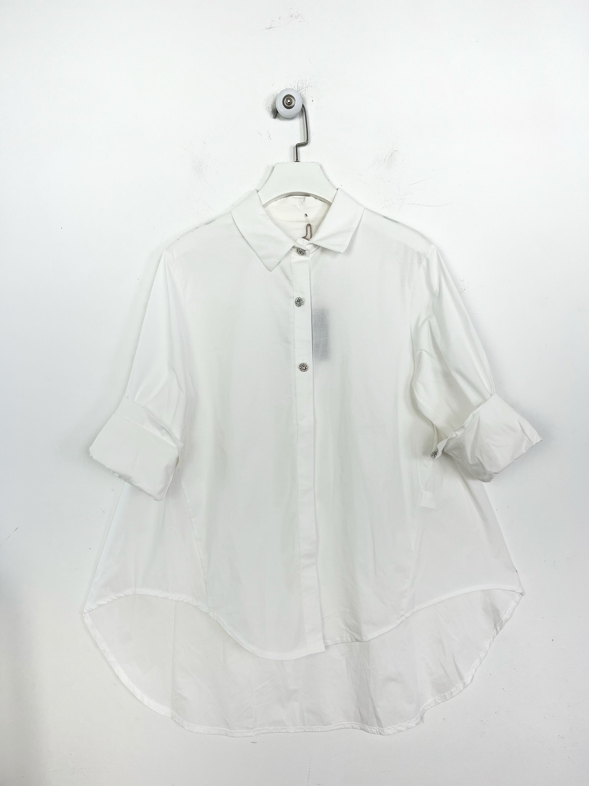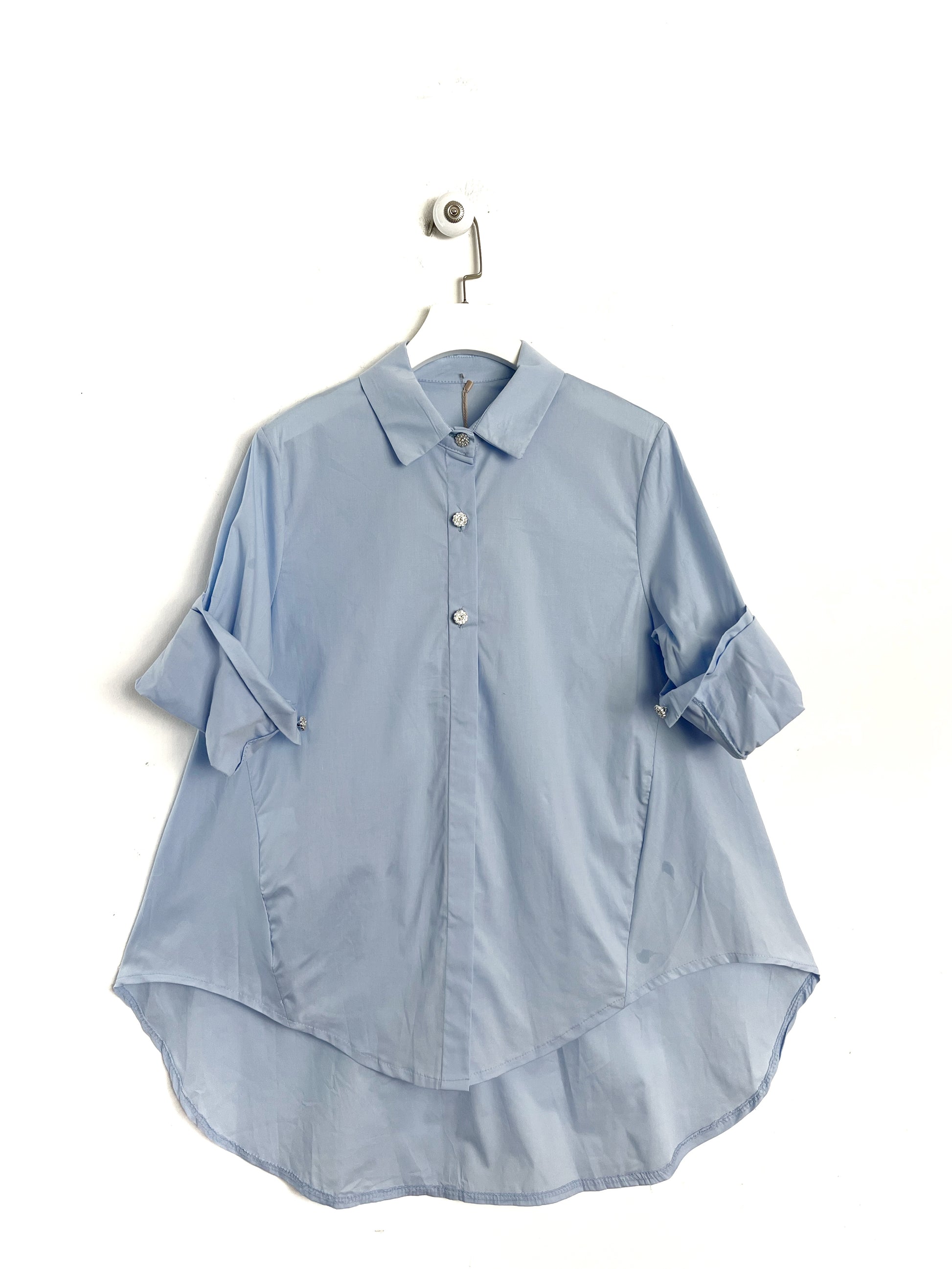 Camicia in puro cotone, con colletto tutta abbottonata sul davanti. Manica lunga, stondata sul fondo, corta davanti più lunga dietro. Bottoni gioiello