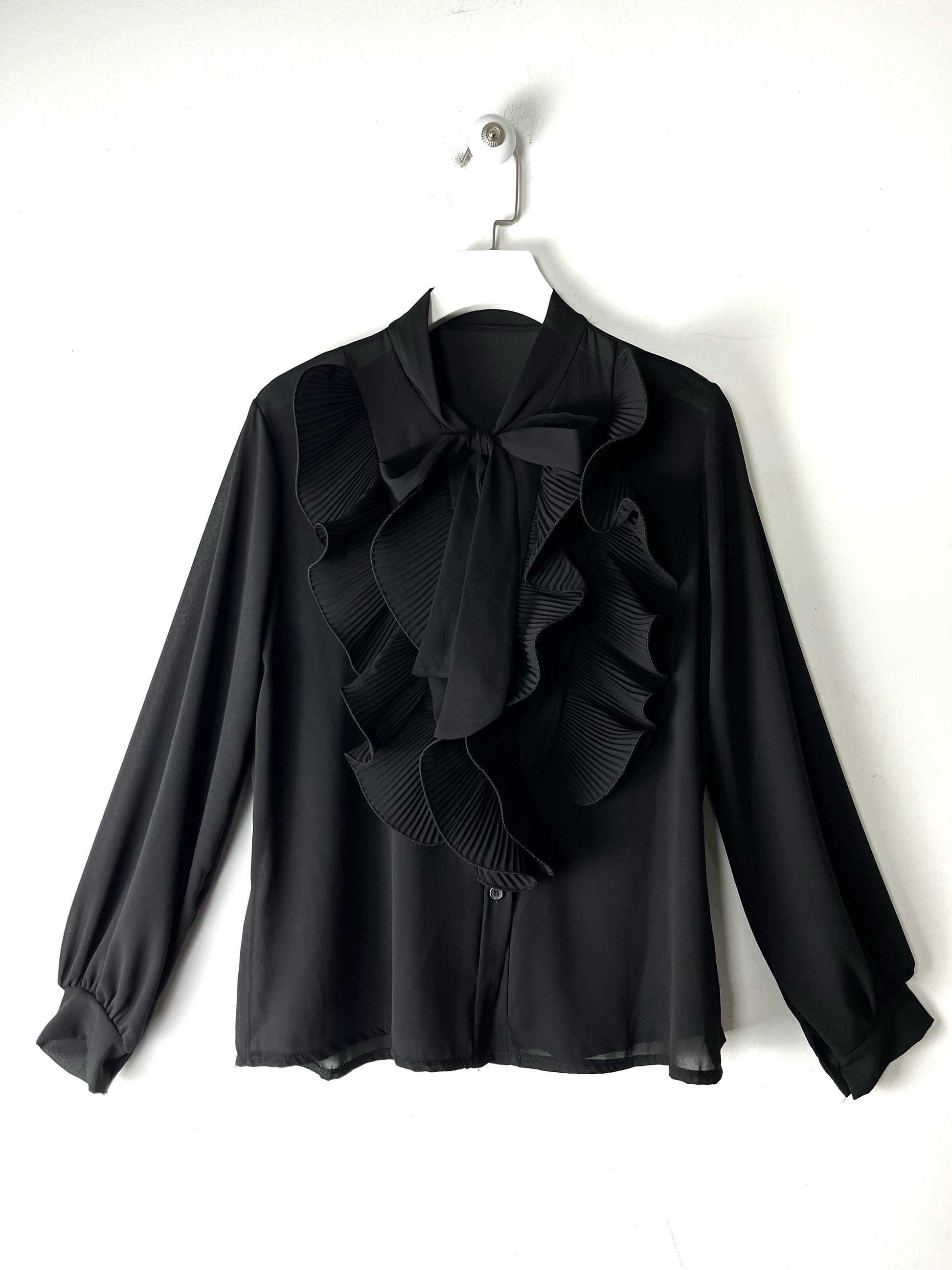 Camicia con maniche lunghe, polsino con bottone. Tutta abbottonata sul davanti. Colletto con nastro a formare un fiocco e volant.