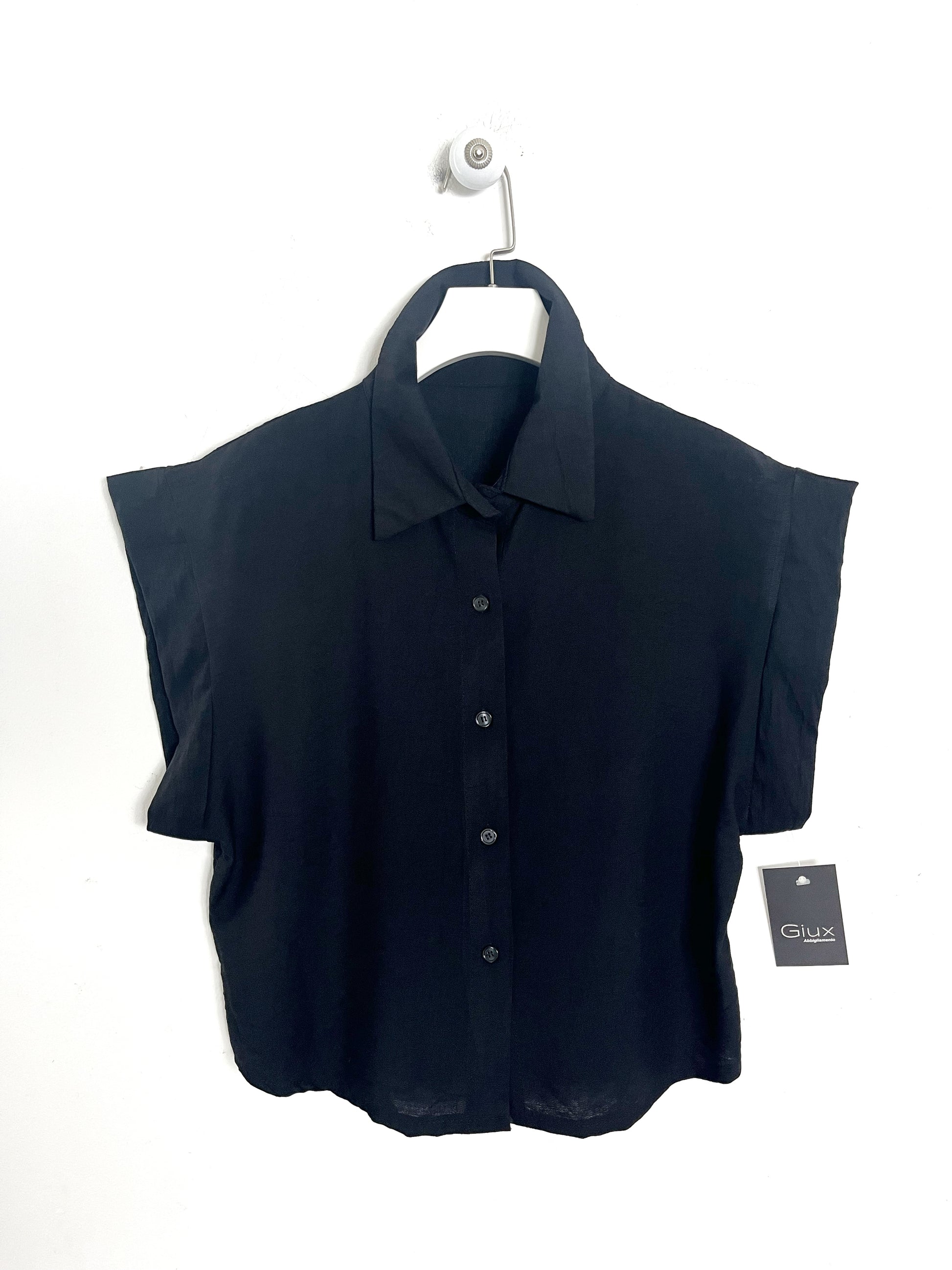 Camicia in cotone, scollo alla coreana. Smanicata con rouge, abbottonata sul davanti con taschino applicata.