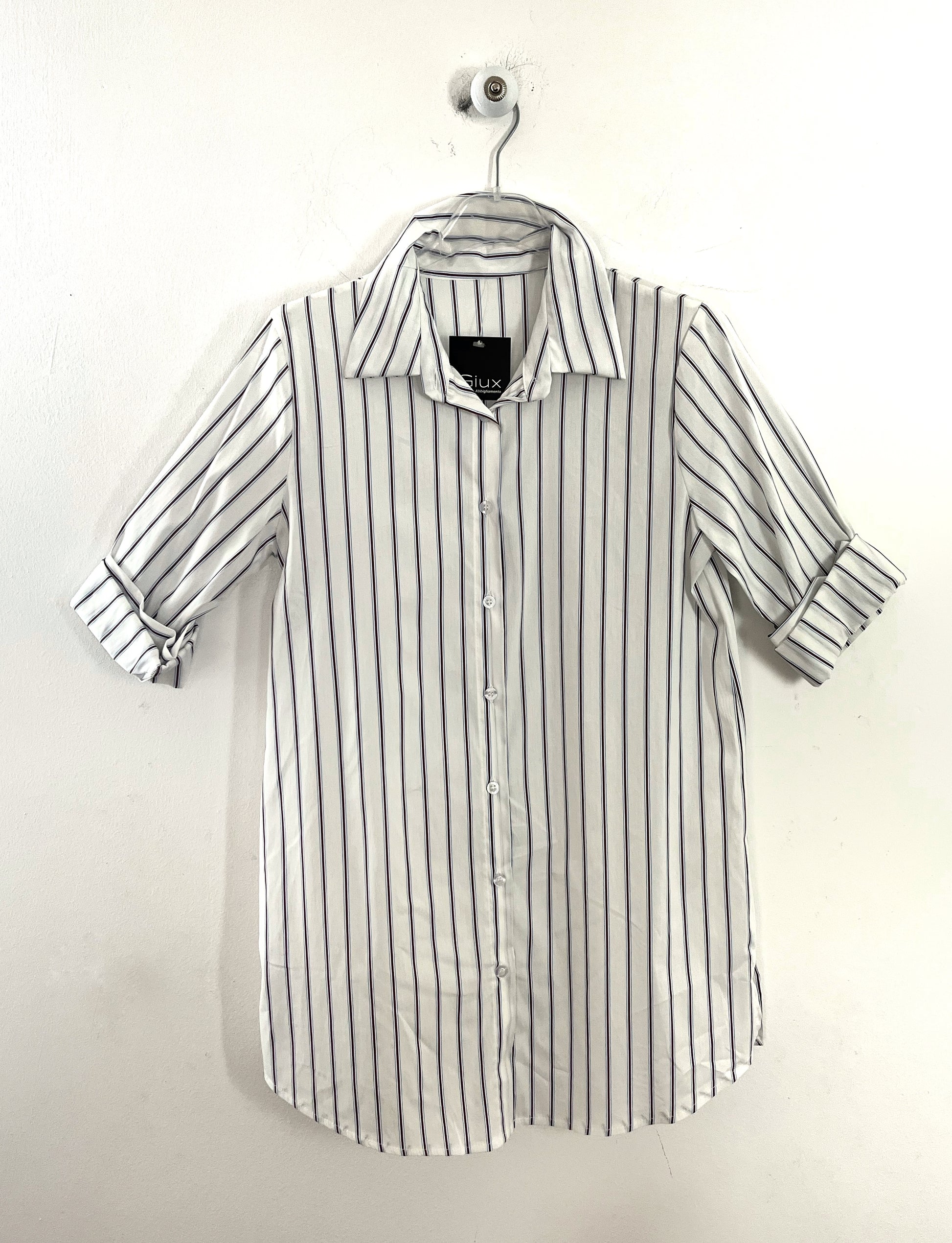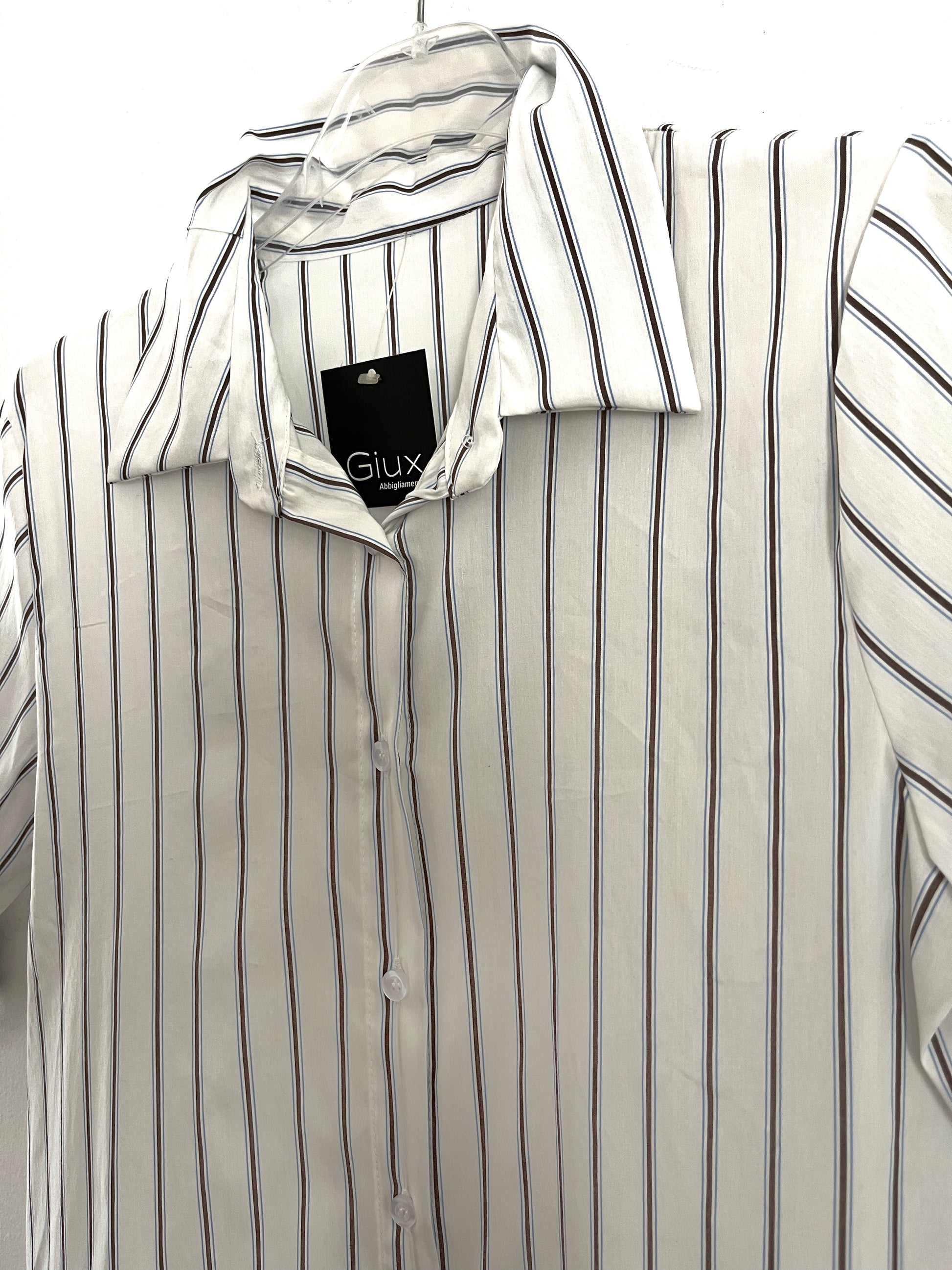 Camicia in cotone rigata. Con colletto e bottoni. Manica lunga con polsino e bottone. Spacchetti laterali.