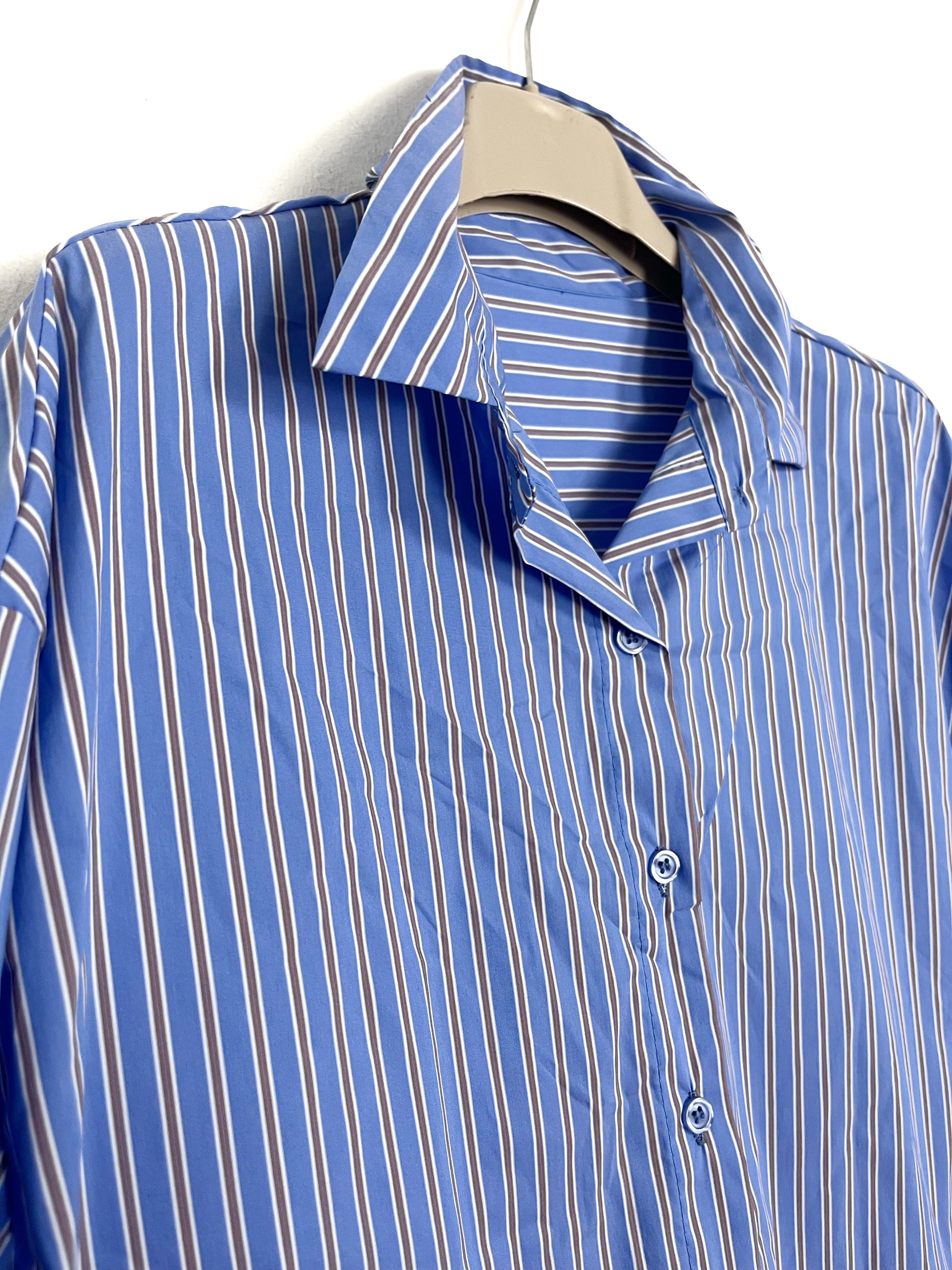 Camicia in misto cotone gessata, con colletto tutta abbottonata sul davanti. Manica lunga risvoltata, stondata sul fondo, corta davanti più lunga dietro.