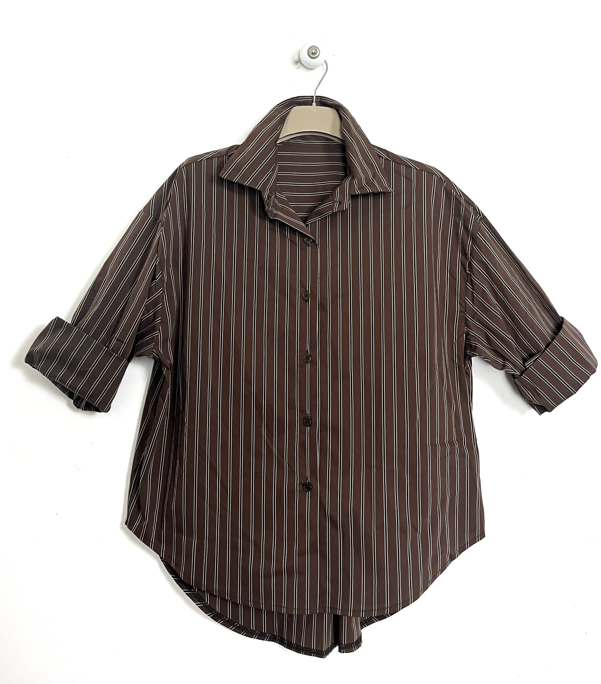 Camicia in misto cotone gessata, con colletto tutta abbottonata sul davanti. Manica lunga risvoltata, stondata sul fondo, corta davanti più lunga dietro.