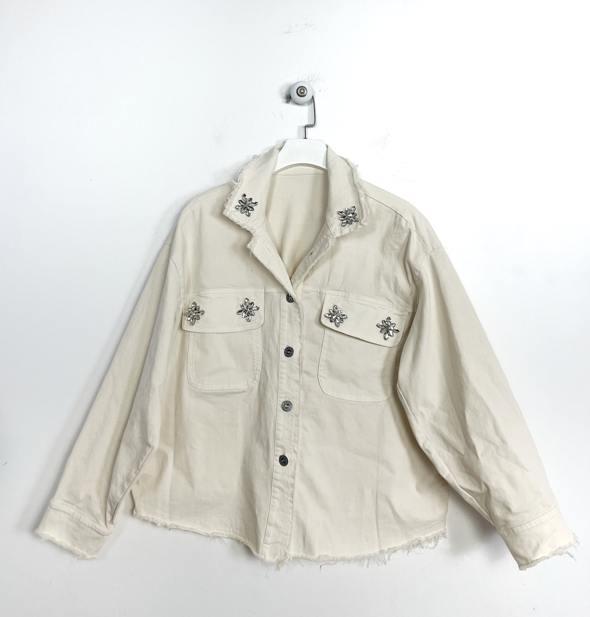 Giacca Camicia in cotone. Spalla ribassata, manica lunga con polsino e bottone. Due tasche applicate sul davanti, con patta e applicazioni. Profili sfrangiati. Cropped