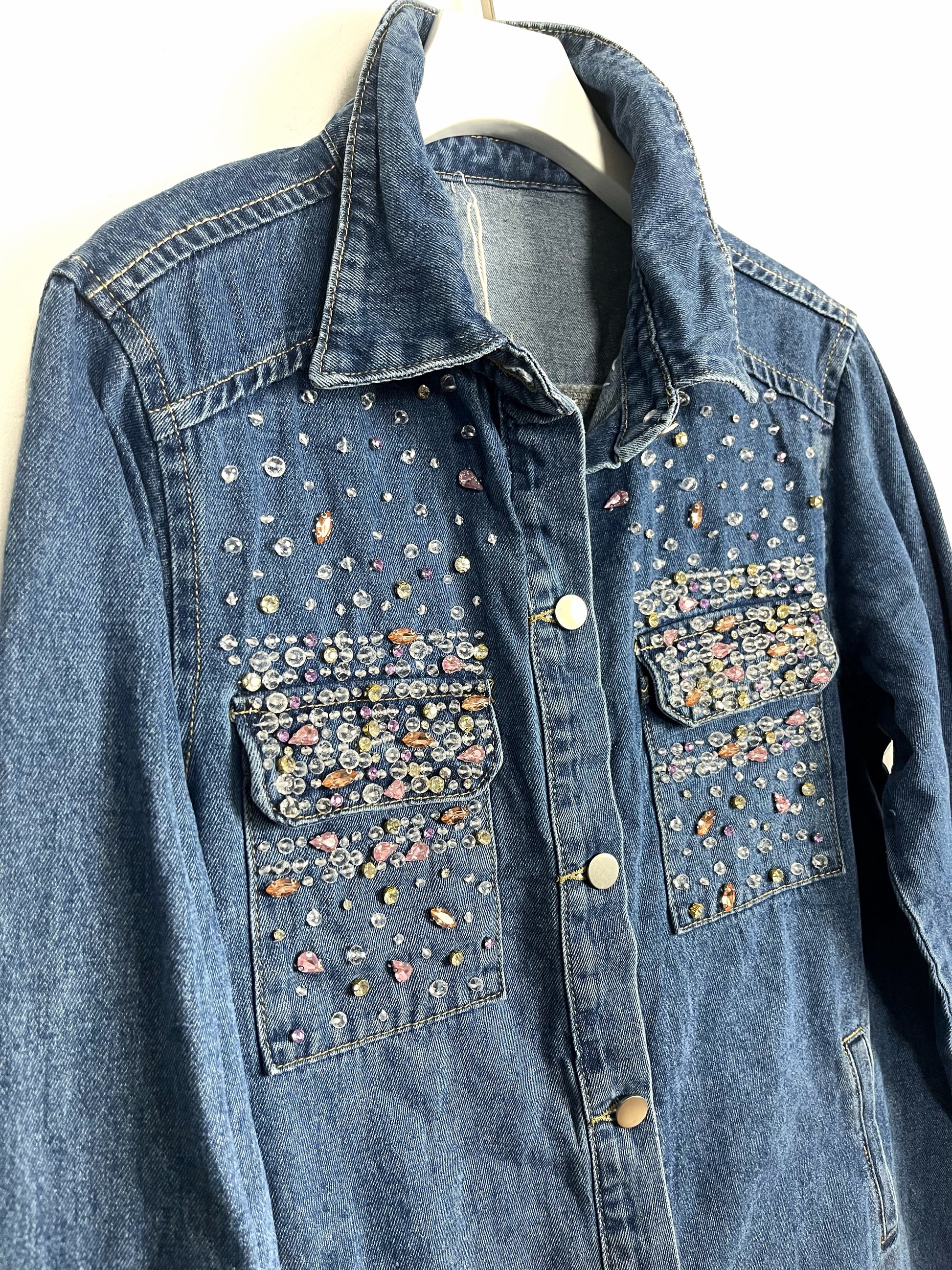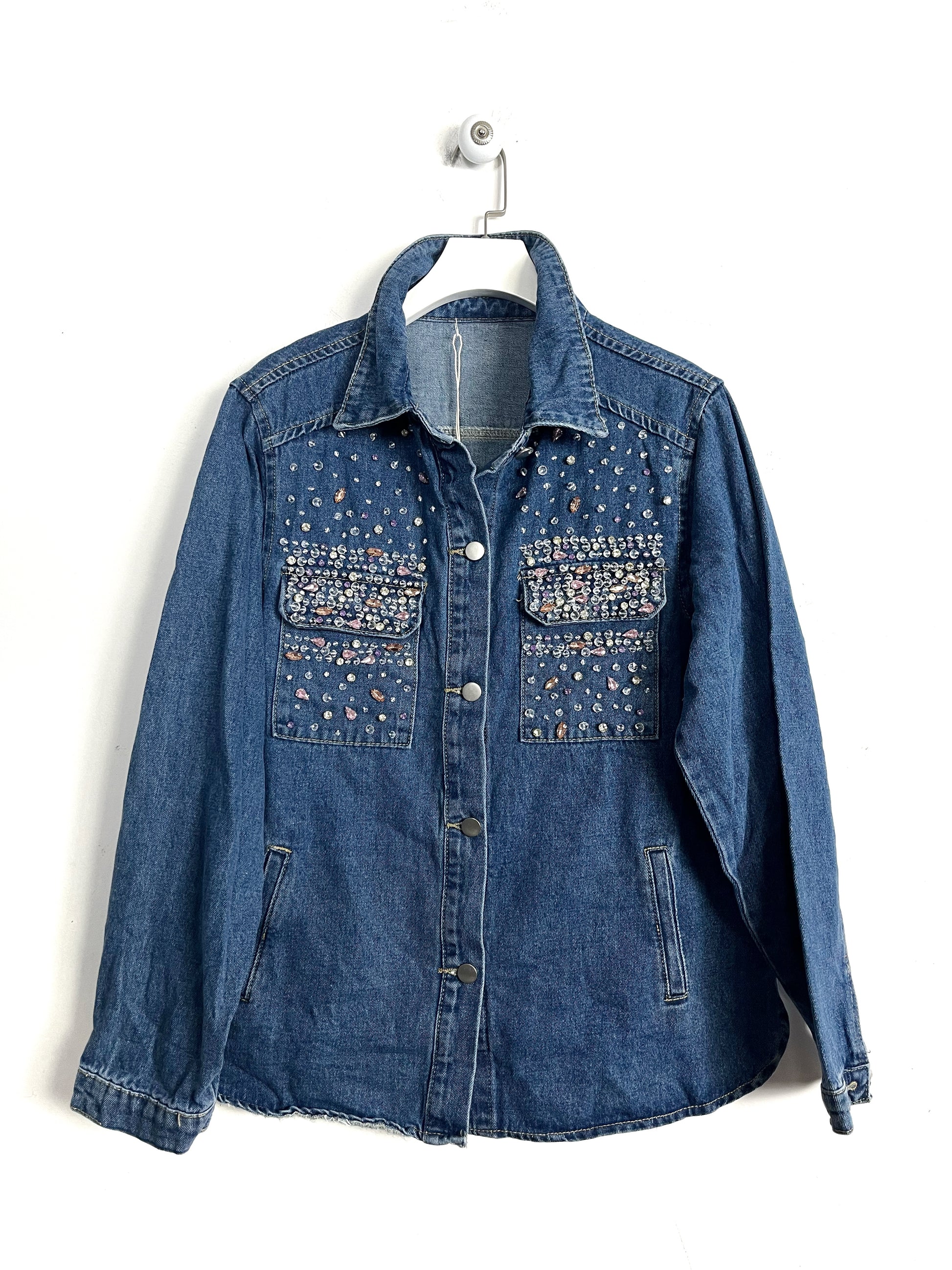 Camicione in denim consistente. Manica lunga con polsino e bottone. Due tasche applicate sul davanti, patta impreziosita da perline e pietre. Due tasche a soffietti laterali.