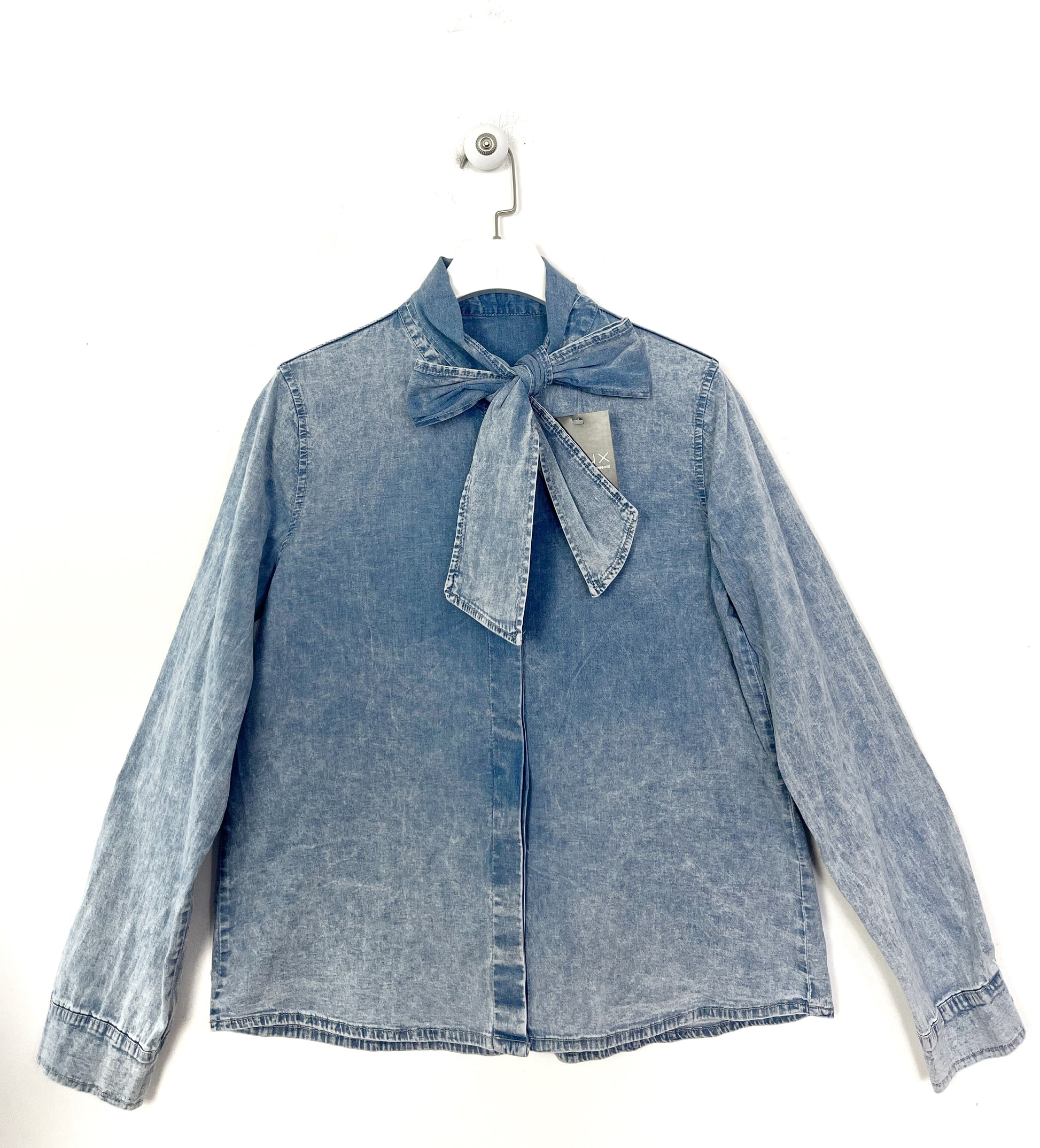 Camicia in cotone di jeans leggero. Manica lunga con polsino, tutta abbottonata sul davanti. Colletto alla coreana con fiocco. Lavaggio Stone Wash