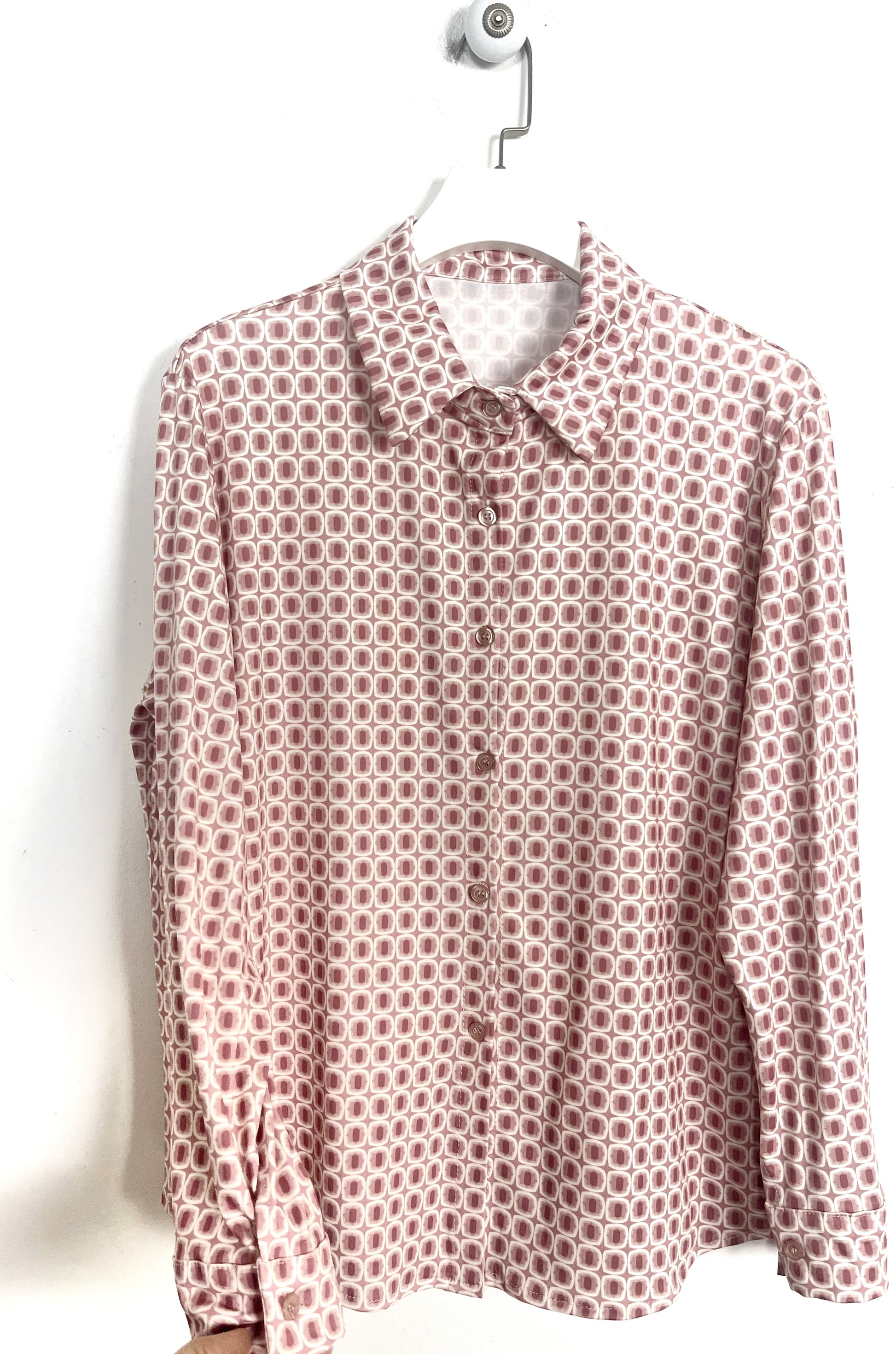 Camicia con maniche lunghe, polsino con bottone. Tutta abbottonata sul davanti.