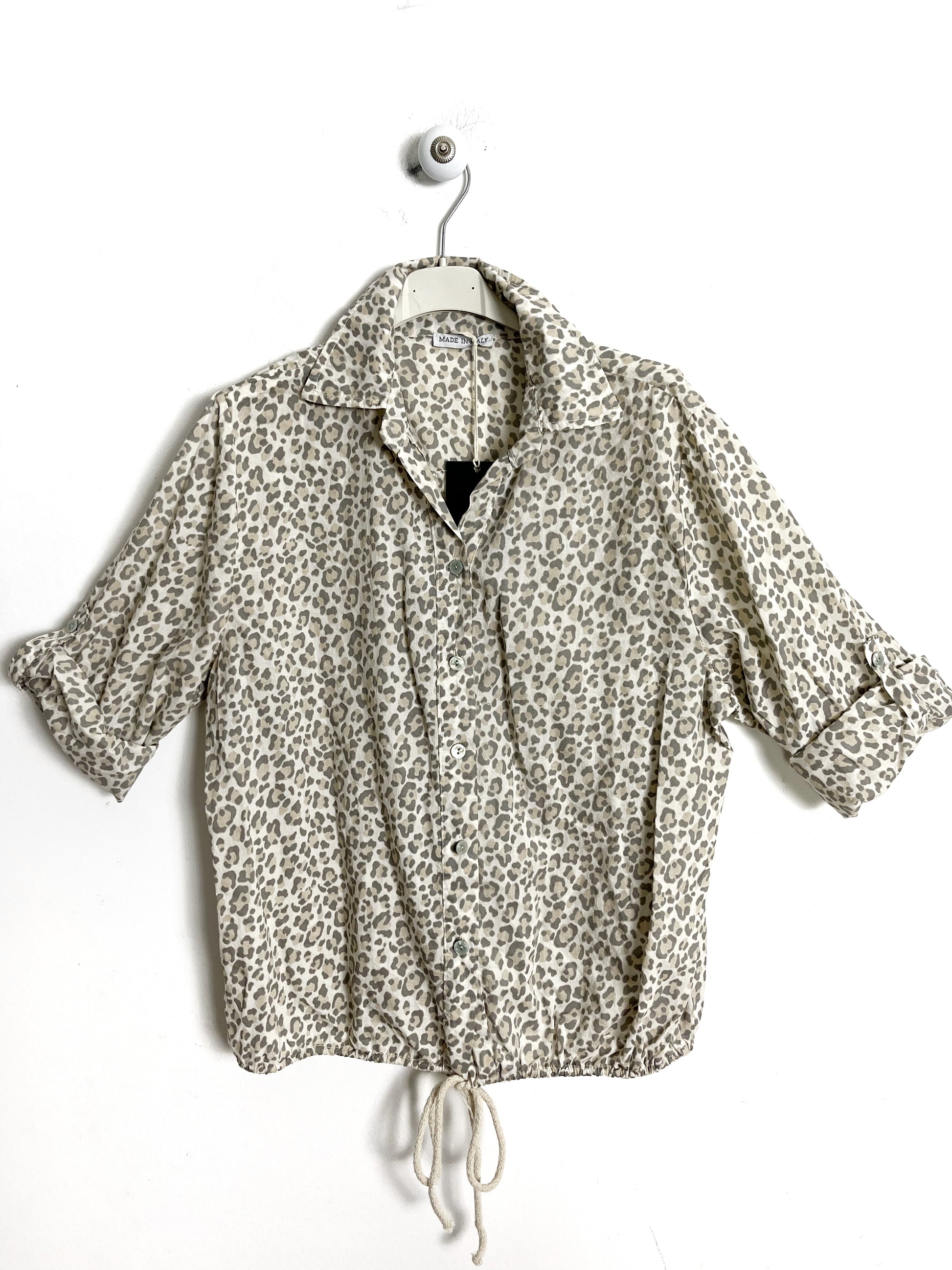 Camicia in viscosa con colletto, tutta abbottonata sul danti. Arricciatura con coulisse sul fondo. Manica 3/4 risvoltata.