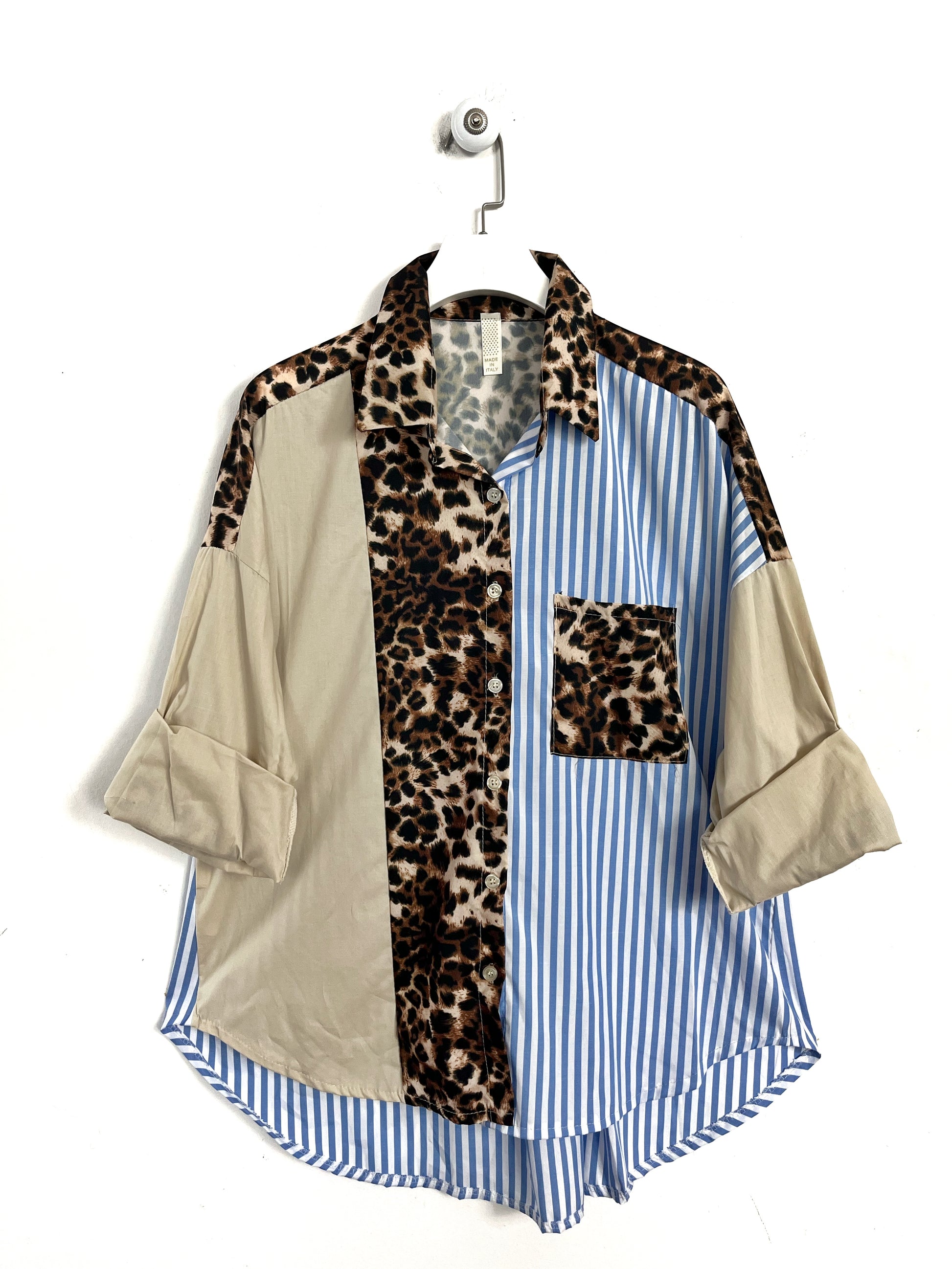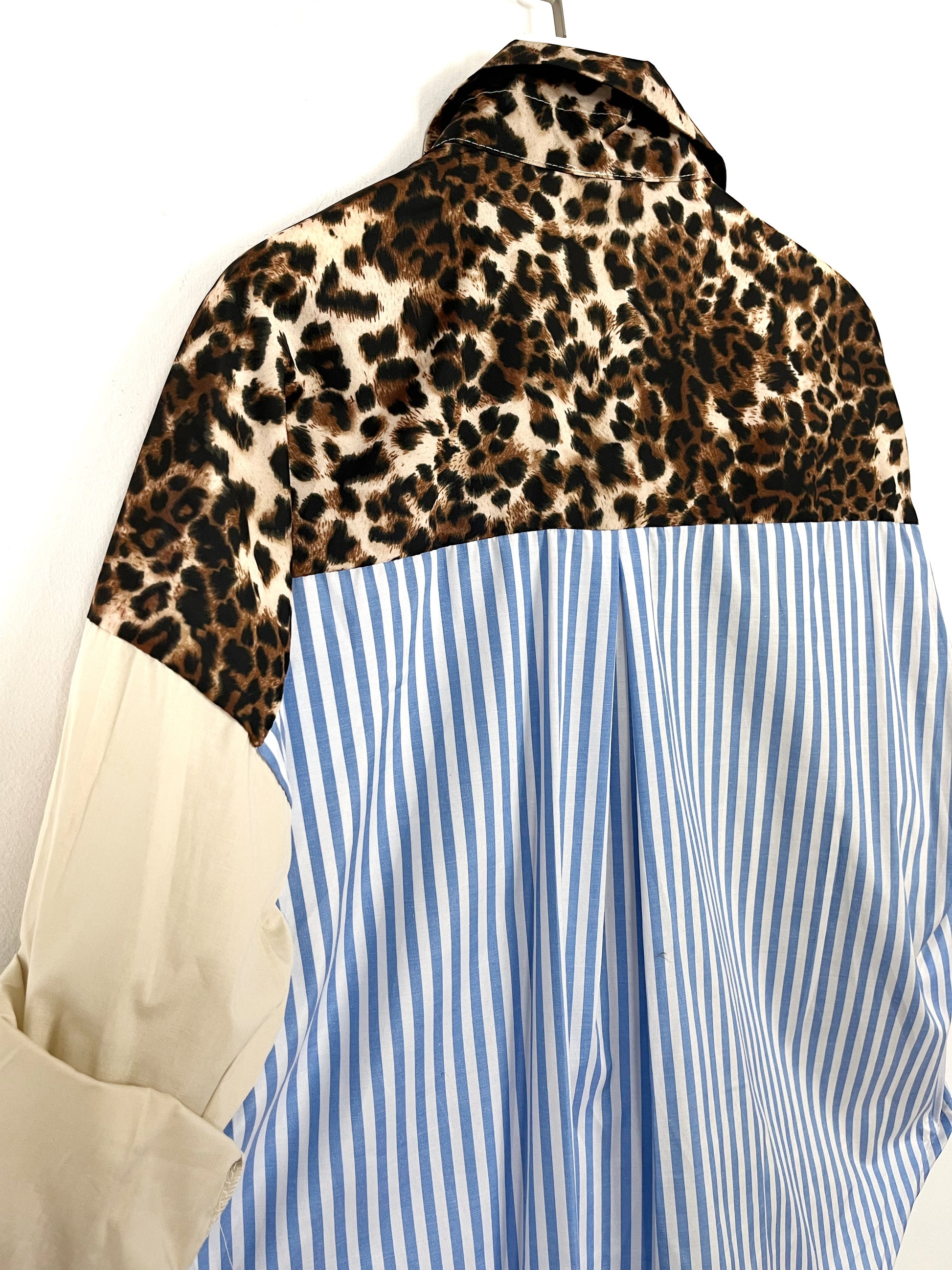 Camicia in misto cotone con colletto, tutta abbottonata. Manica lunga risvoltata. Svasata sotto, più lunga dietro.