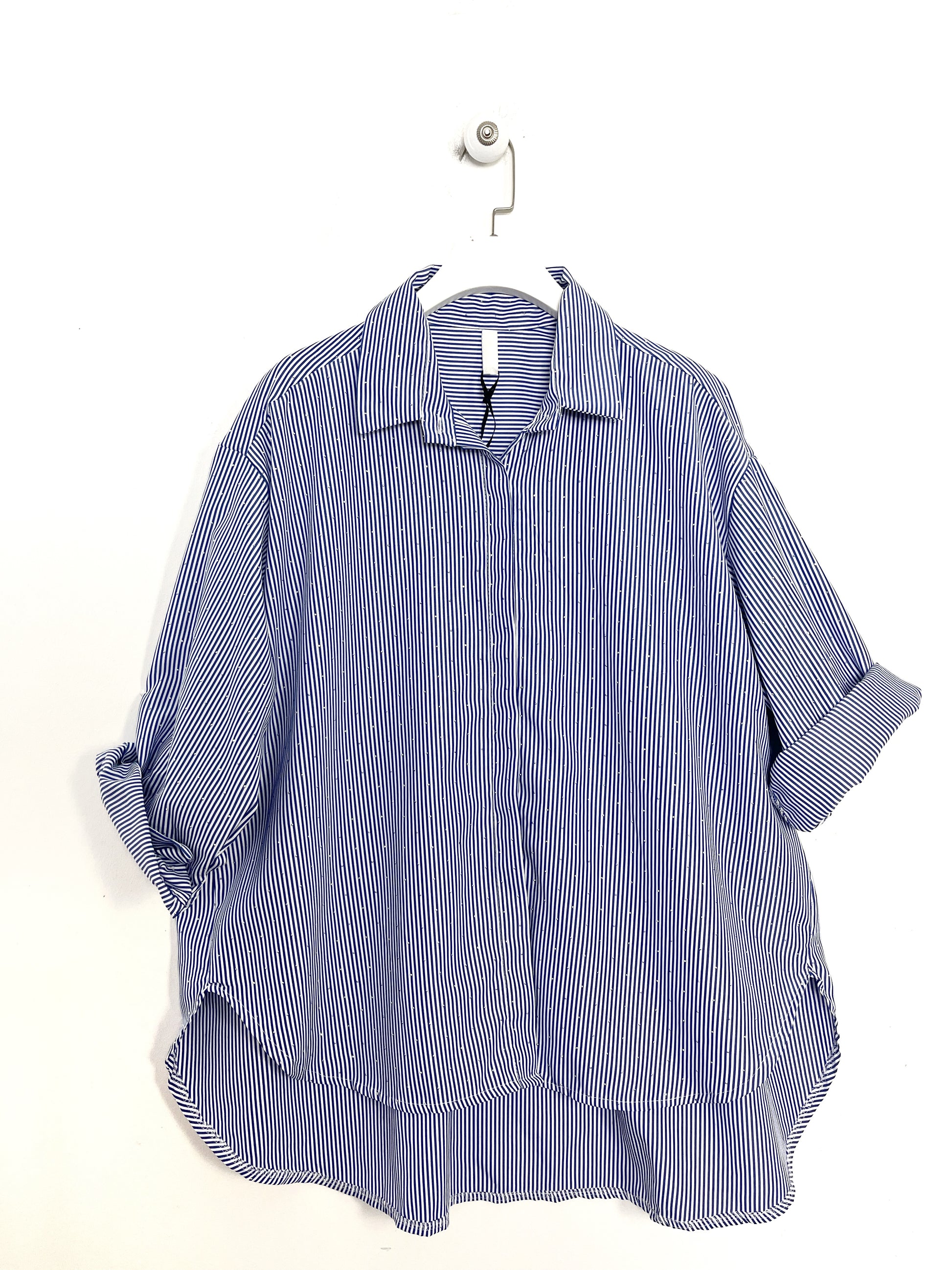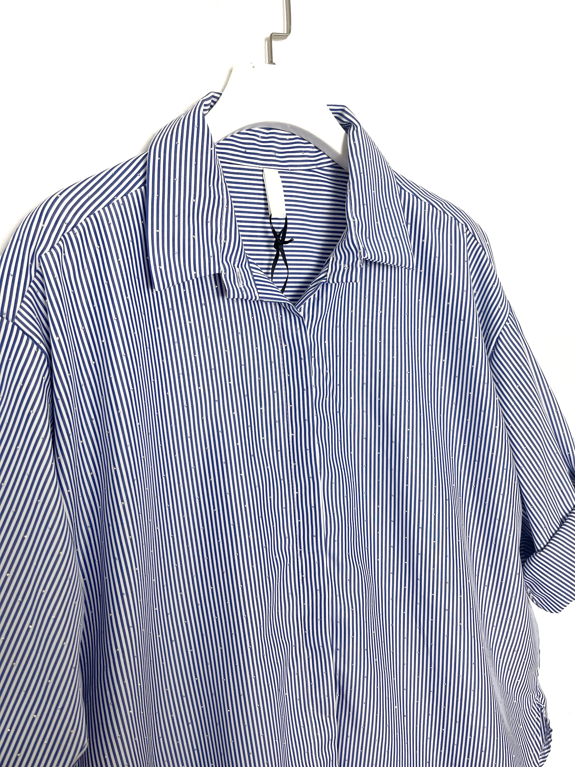 Camicia Over  in misto cotone, con colletto tutta abbottonata sul davanti. Corta davanti, più lunga dietro Manica lunga. Piccolissimi strass applicati.