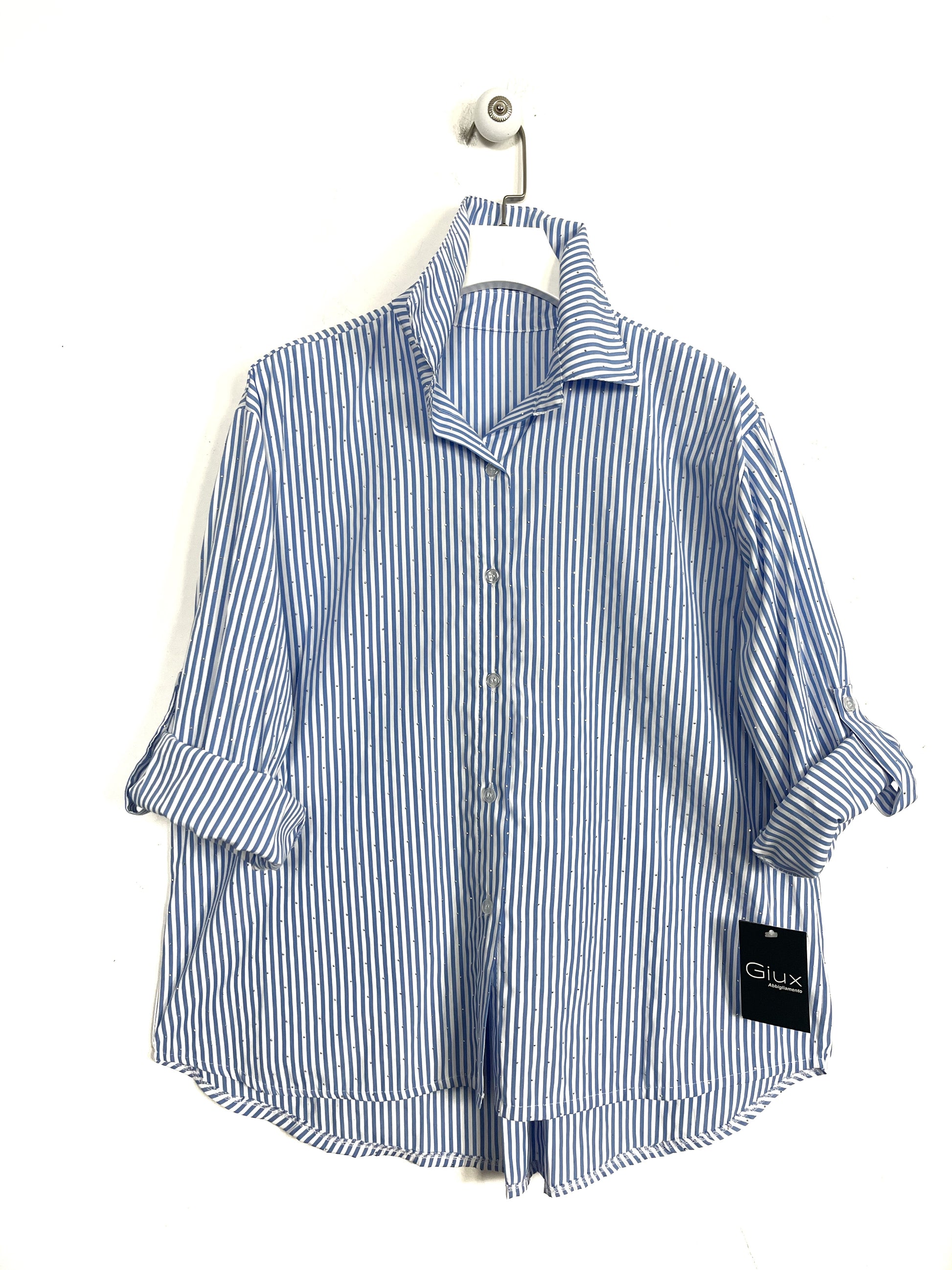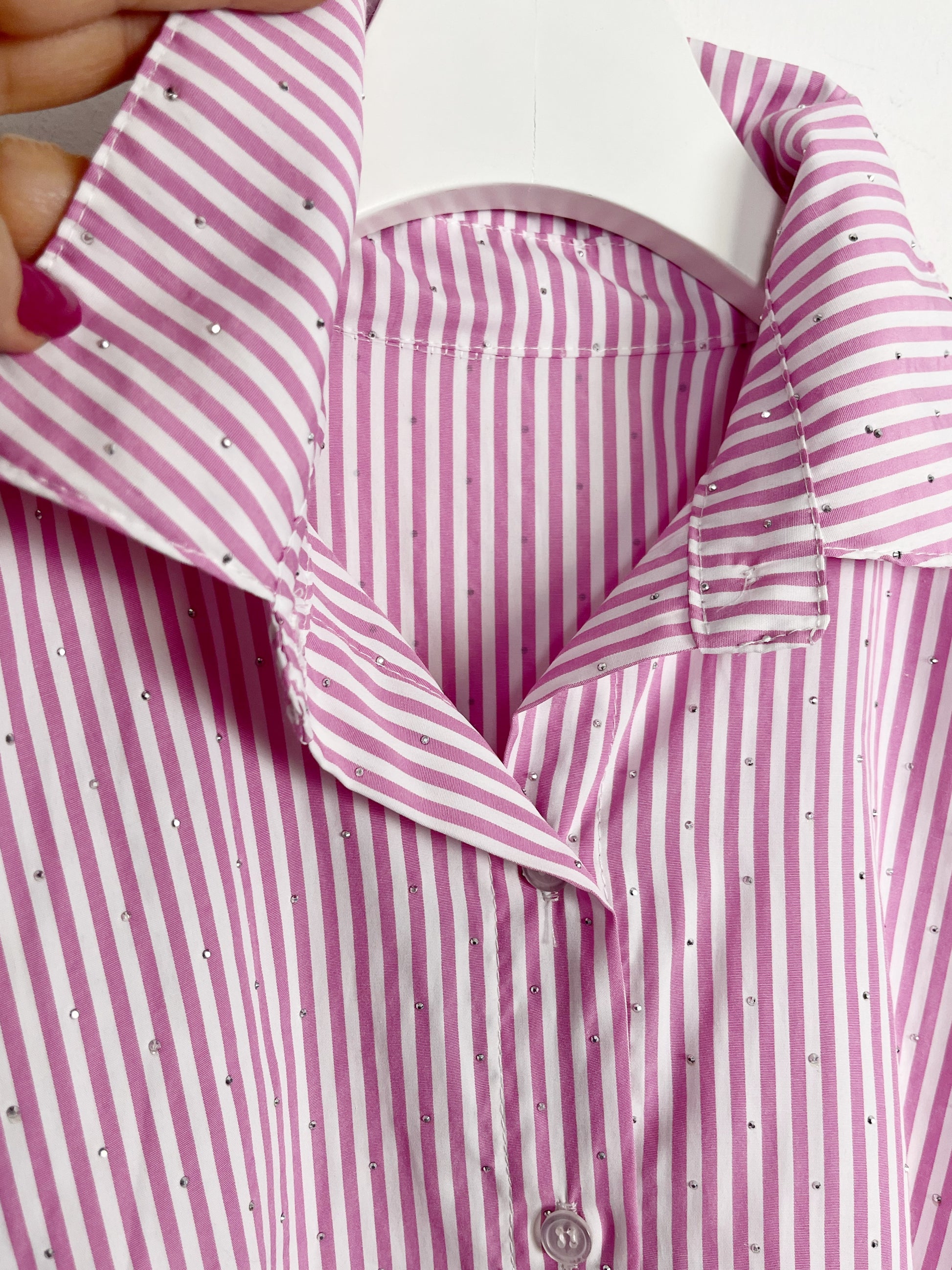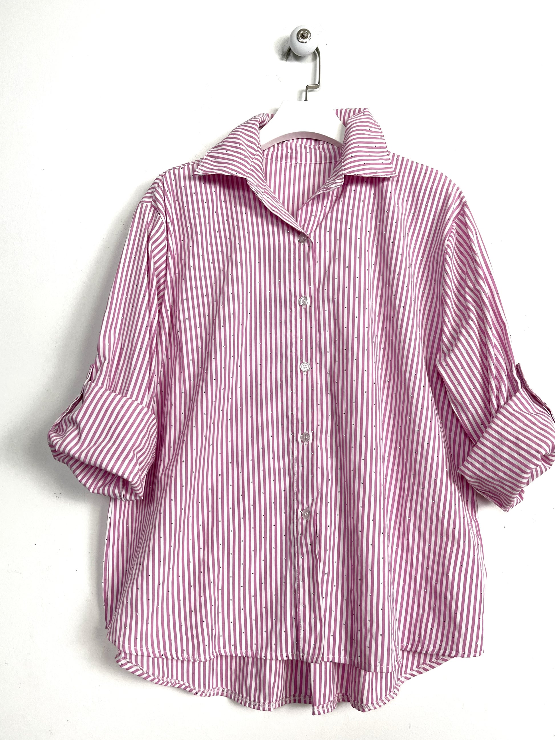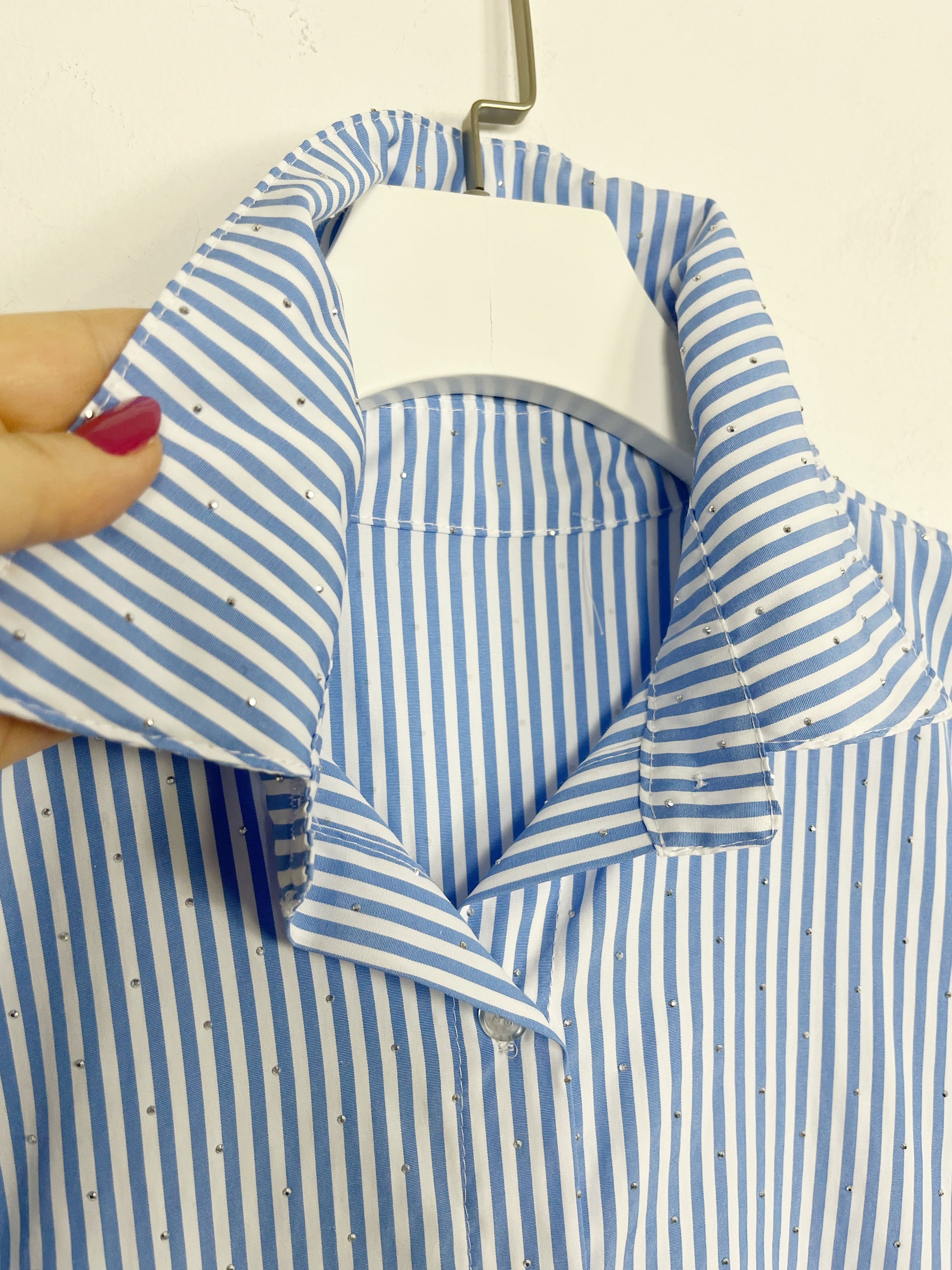 Camicia Over in misto cotone, con colletto tutta abbottonata sul davanti. Corta davanti, più lunga dietro Manica lunga con listo X risvolto. Piccolissimi strass applicati.