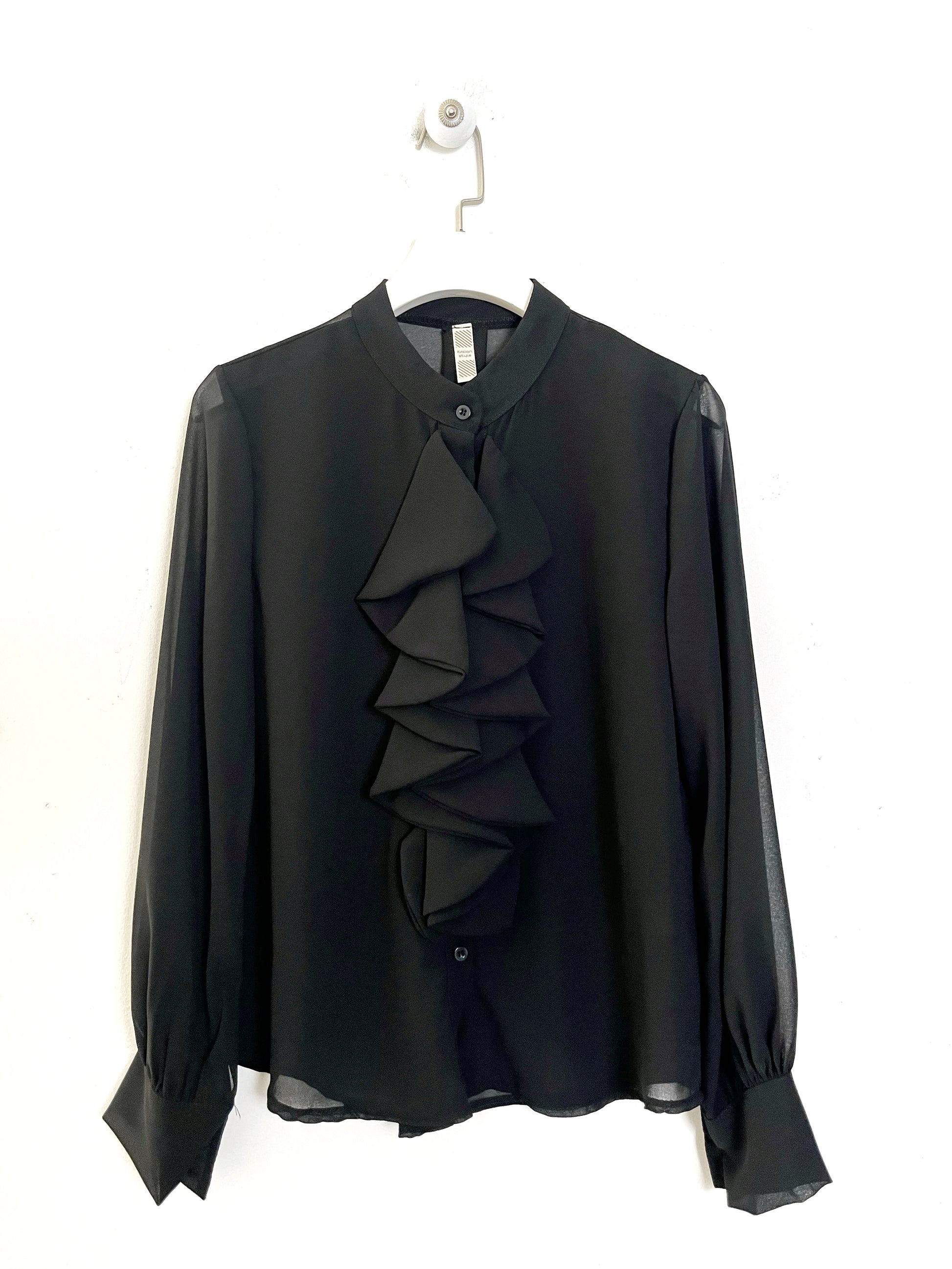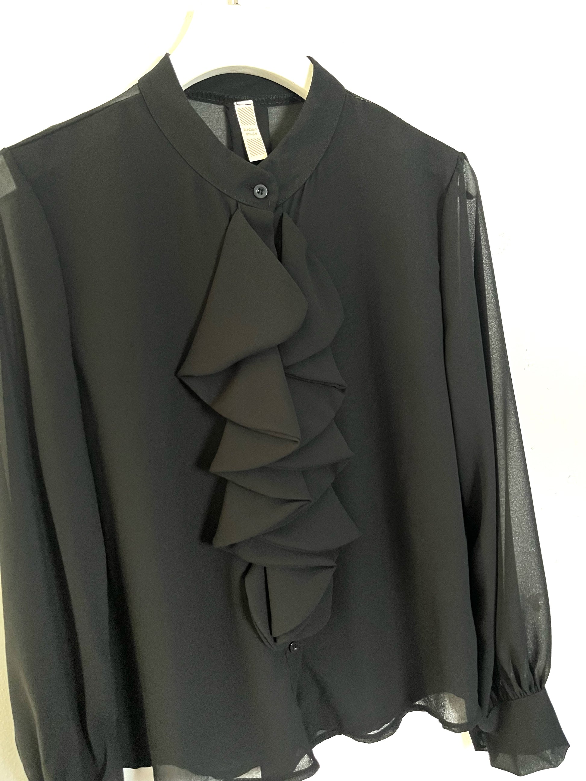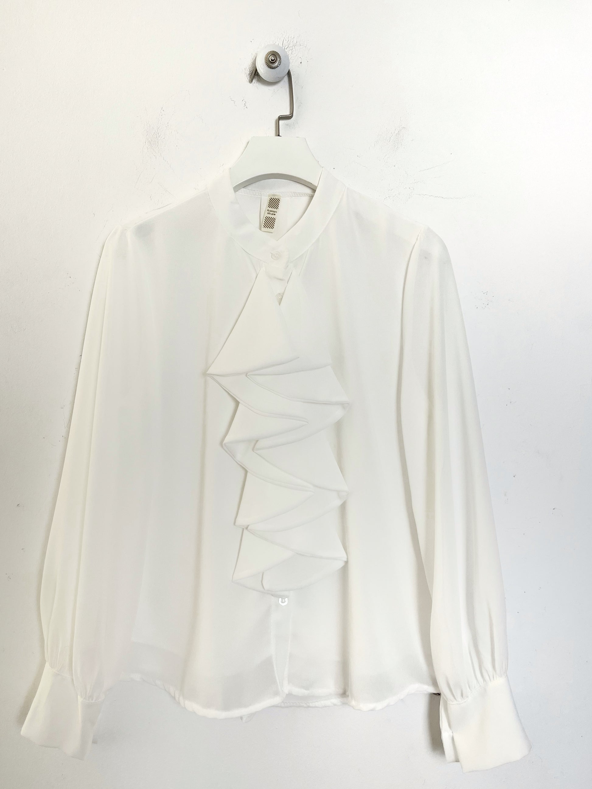 Camicia con maniche lunghe, polsino con bottone. Tutta abbottonata sul davanti. Colletto a coreana con rouge sul davanti
