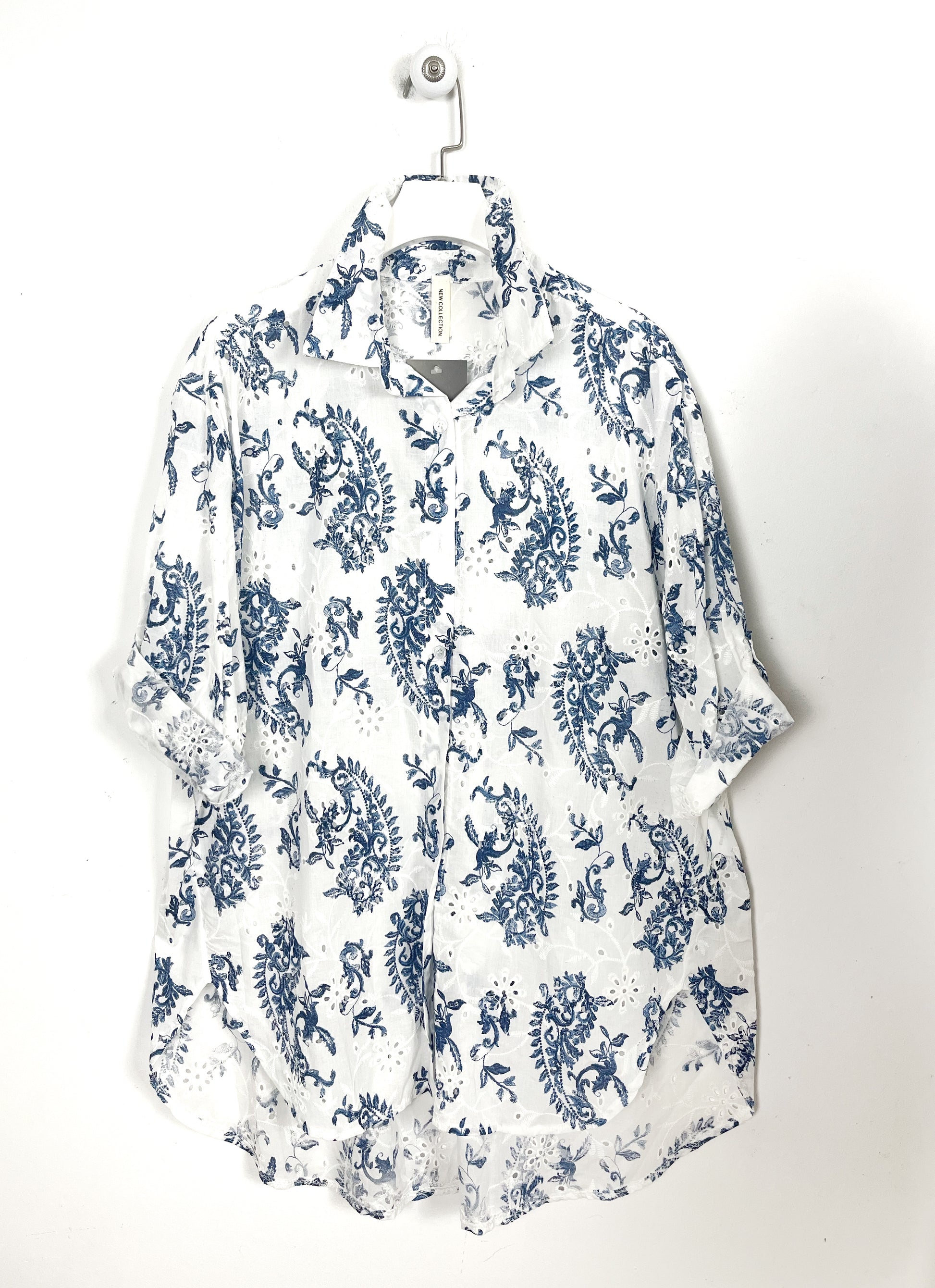Camicia di cotone sangallo in fantasia . Bottoni sul davanti. Manica corta risvoltata. Corte davanti più lunga dietro