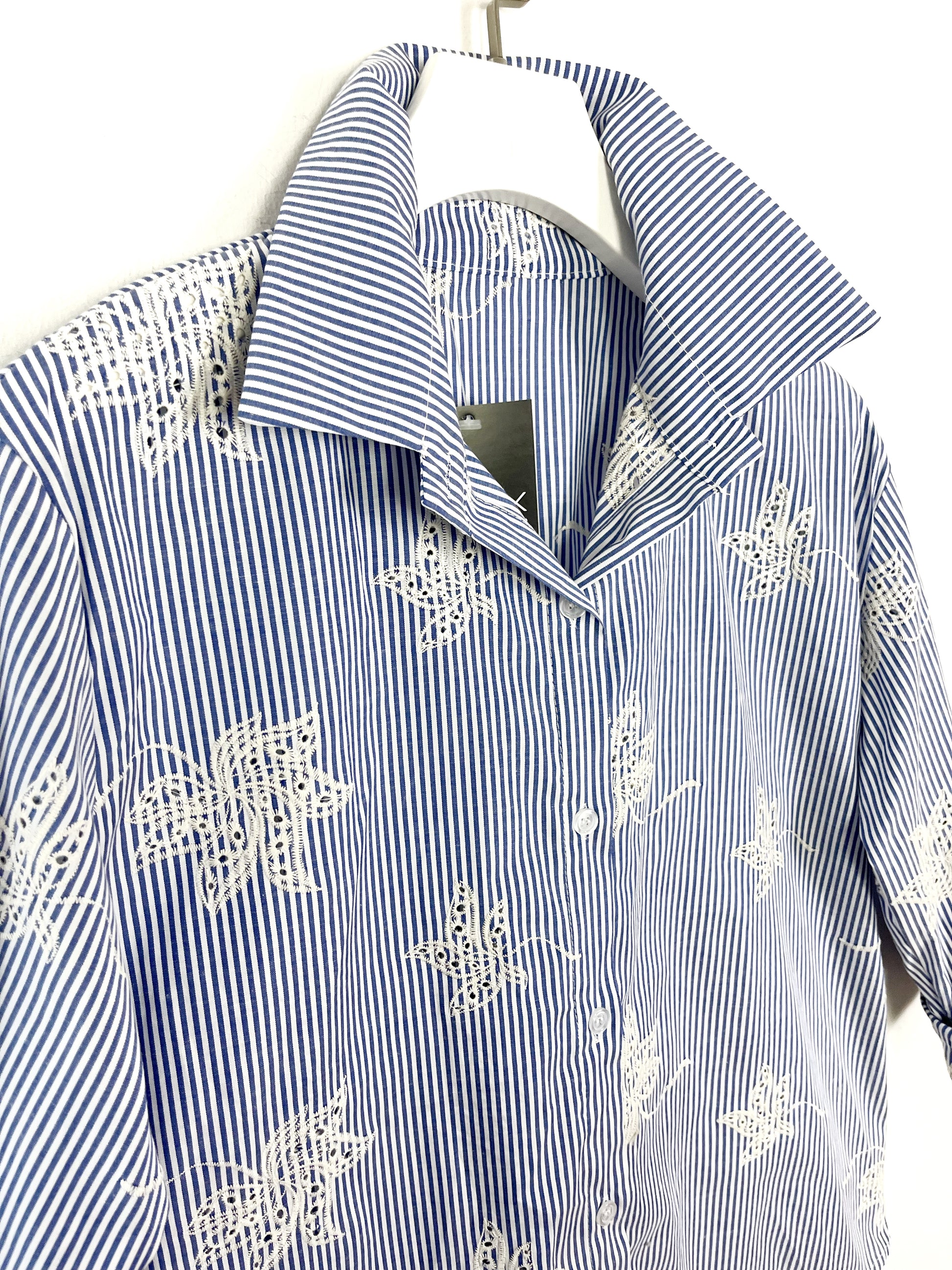 Camicia rigata in pizzo sangallo, colletto e bottoni davanti. Manica lunga con polsino e bottone. Più lunga dietro.