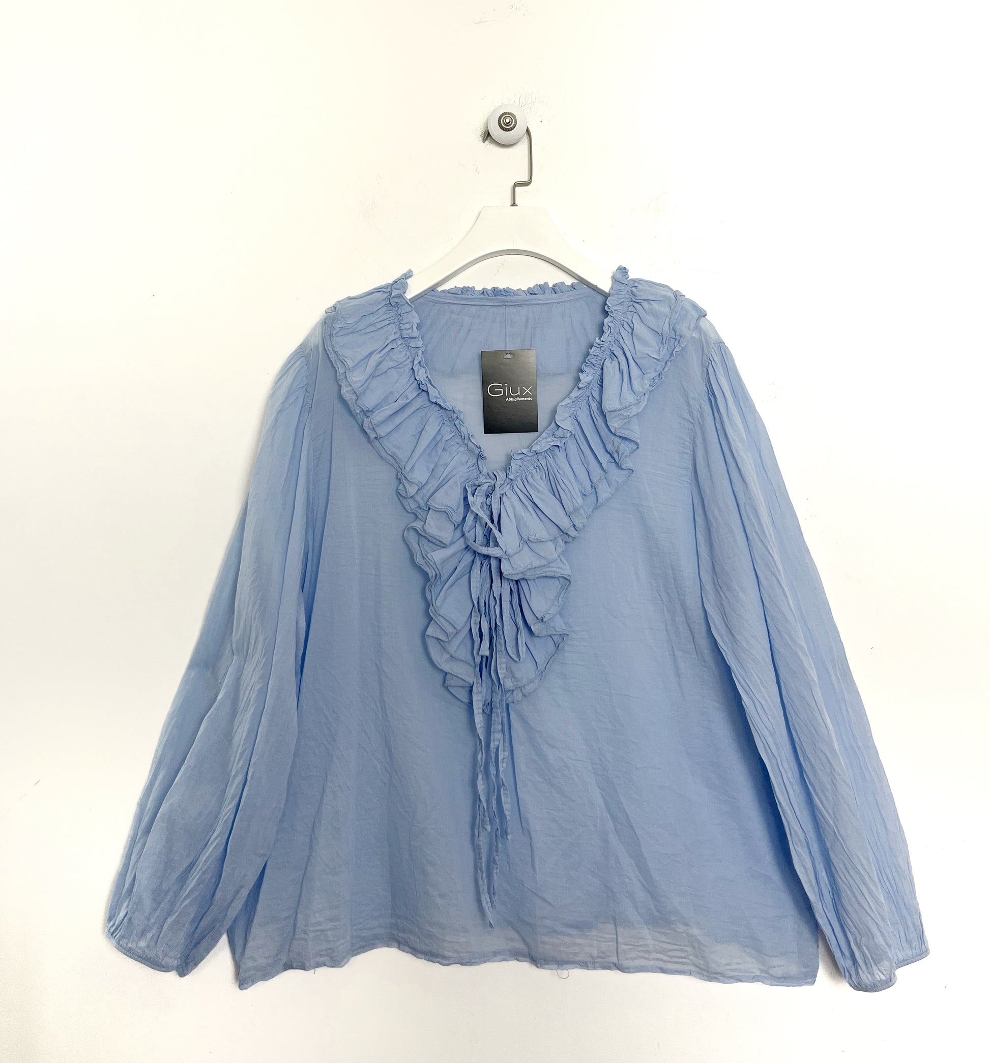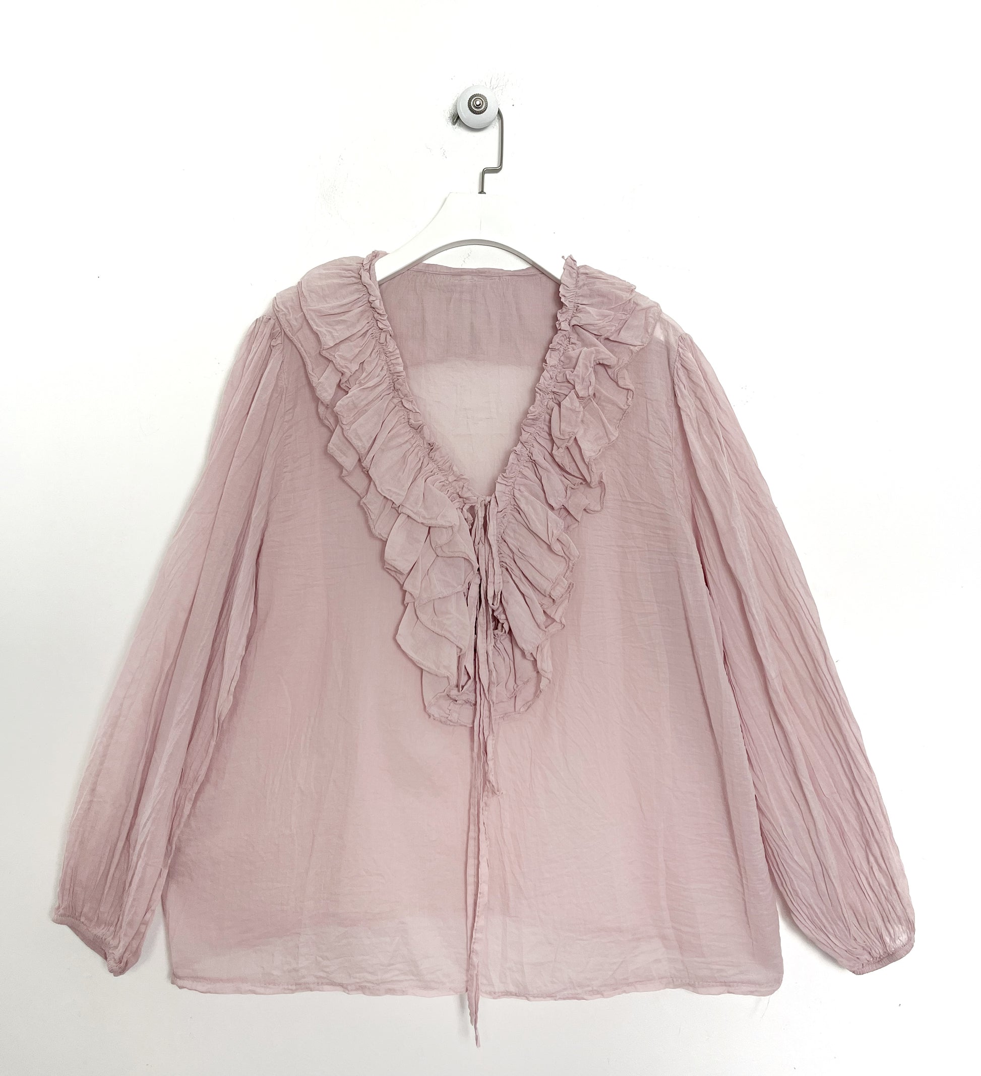 Camicia in leggerissima tela di cotone con maniche lunghe, polsino con elastico. Scollatura a V con volant.