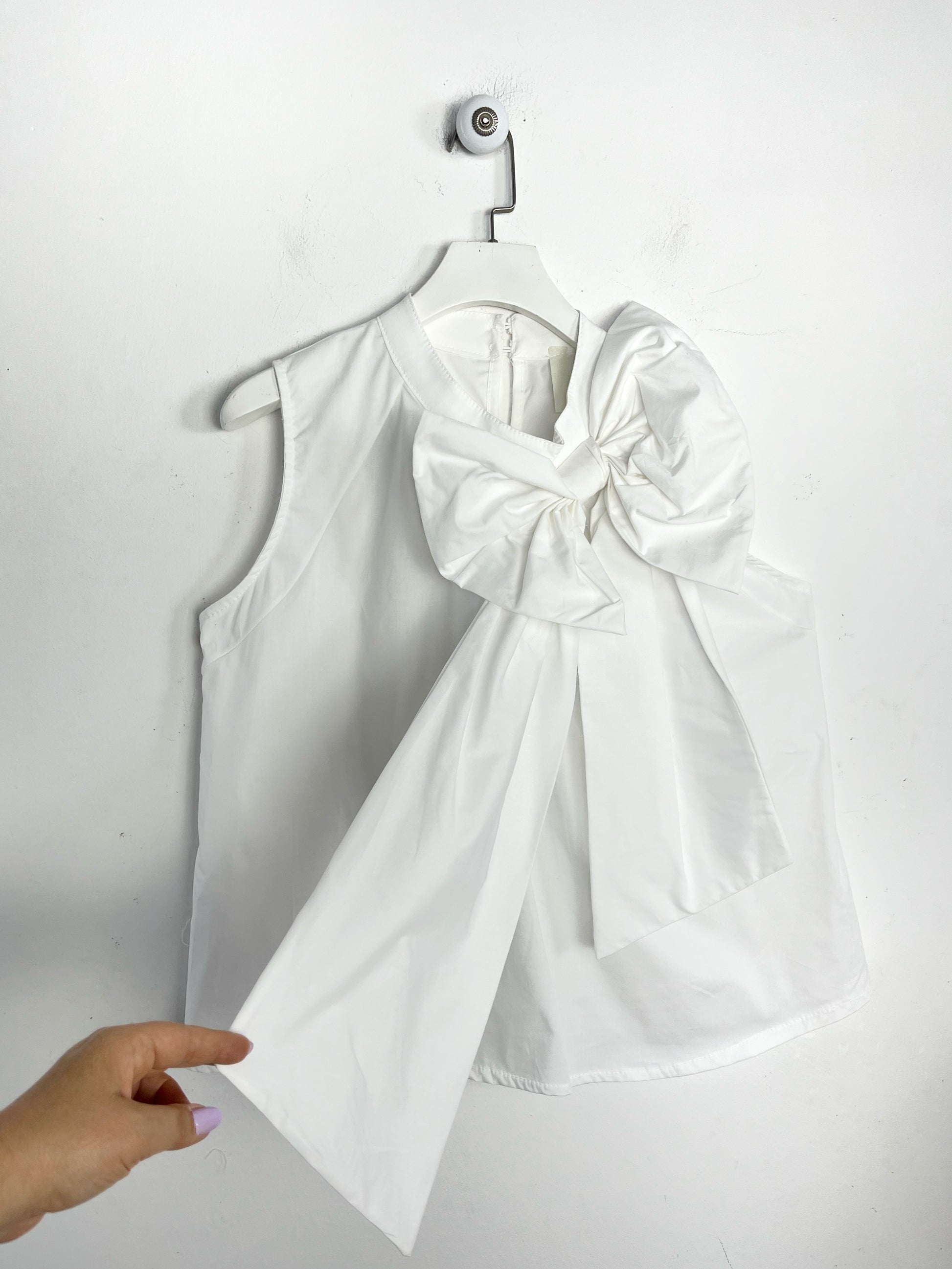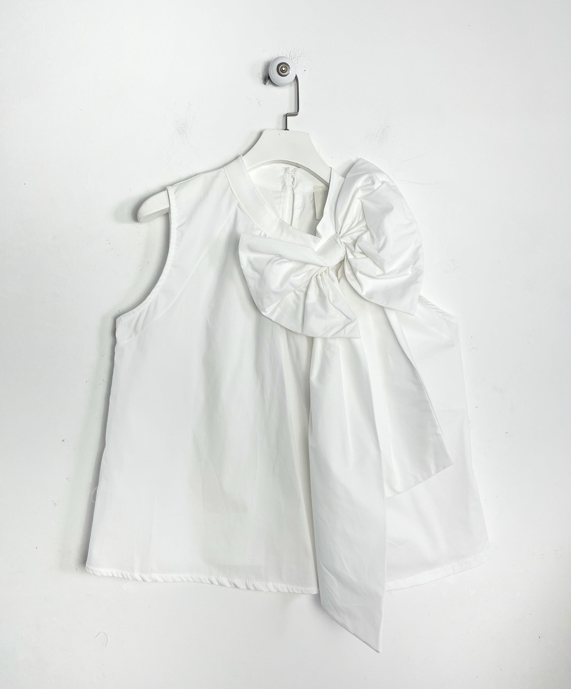 Canotta con scollatura all’americana. Fiocco applicato sul colletto. Svasata