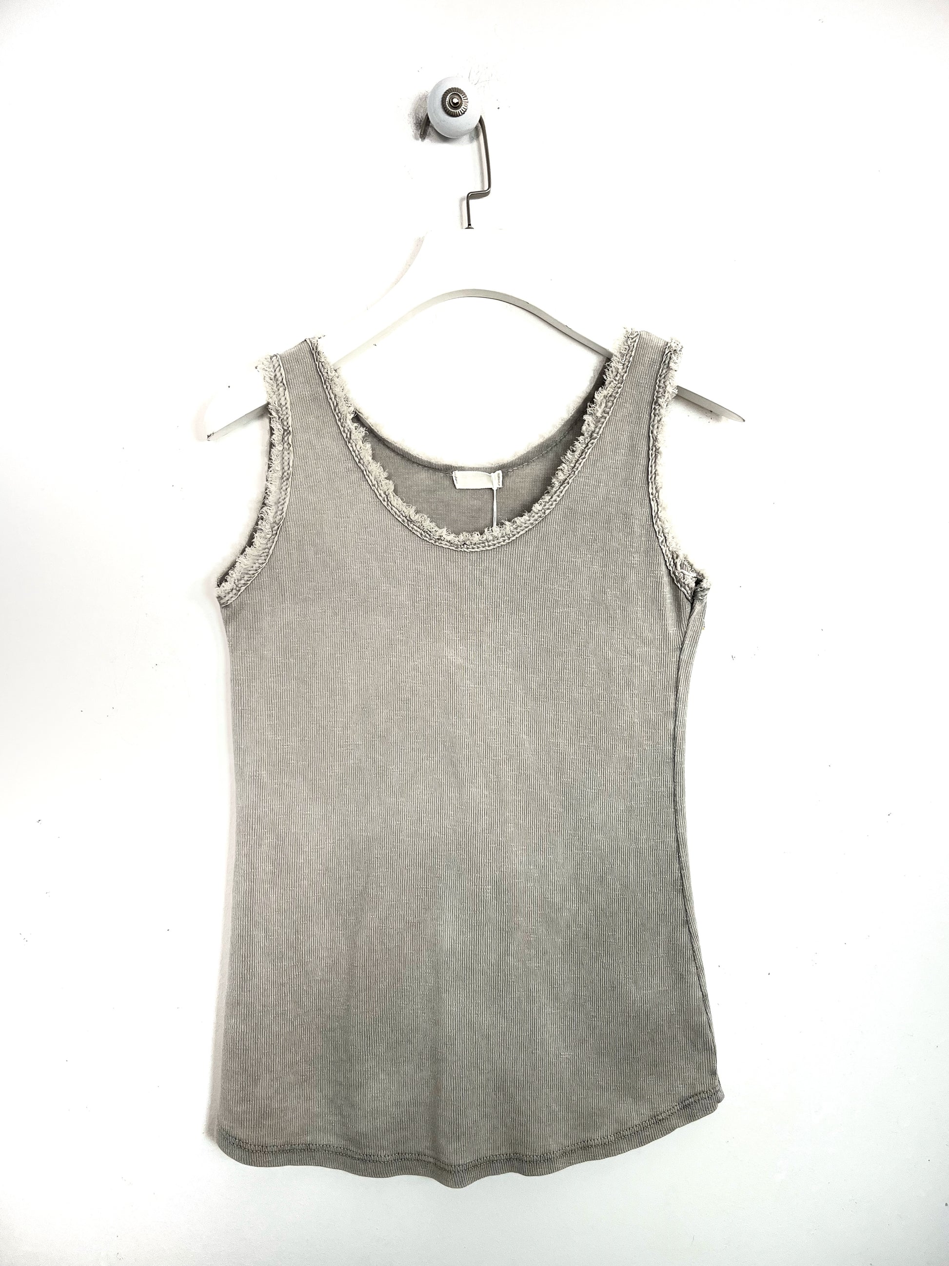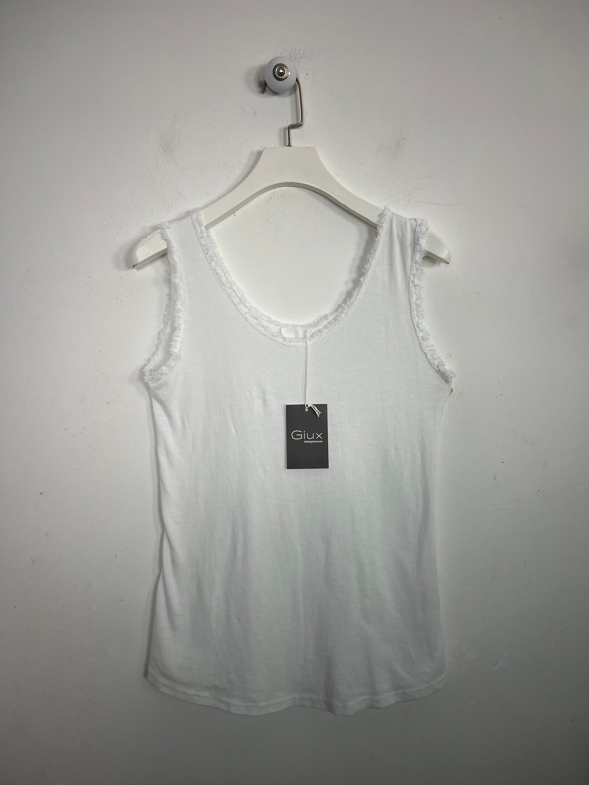 Canotta in maglina di cotone elasticizzata a costine. Srangiato lungo la scollatura girocollo e nel giromanica