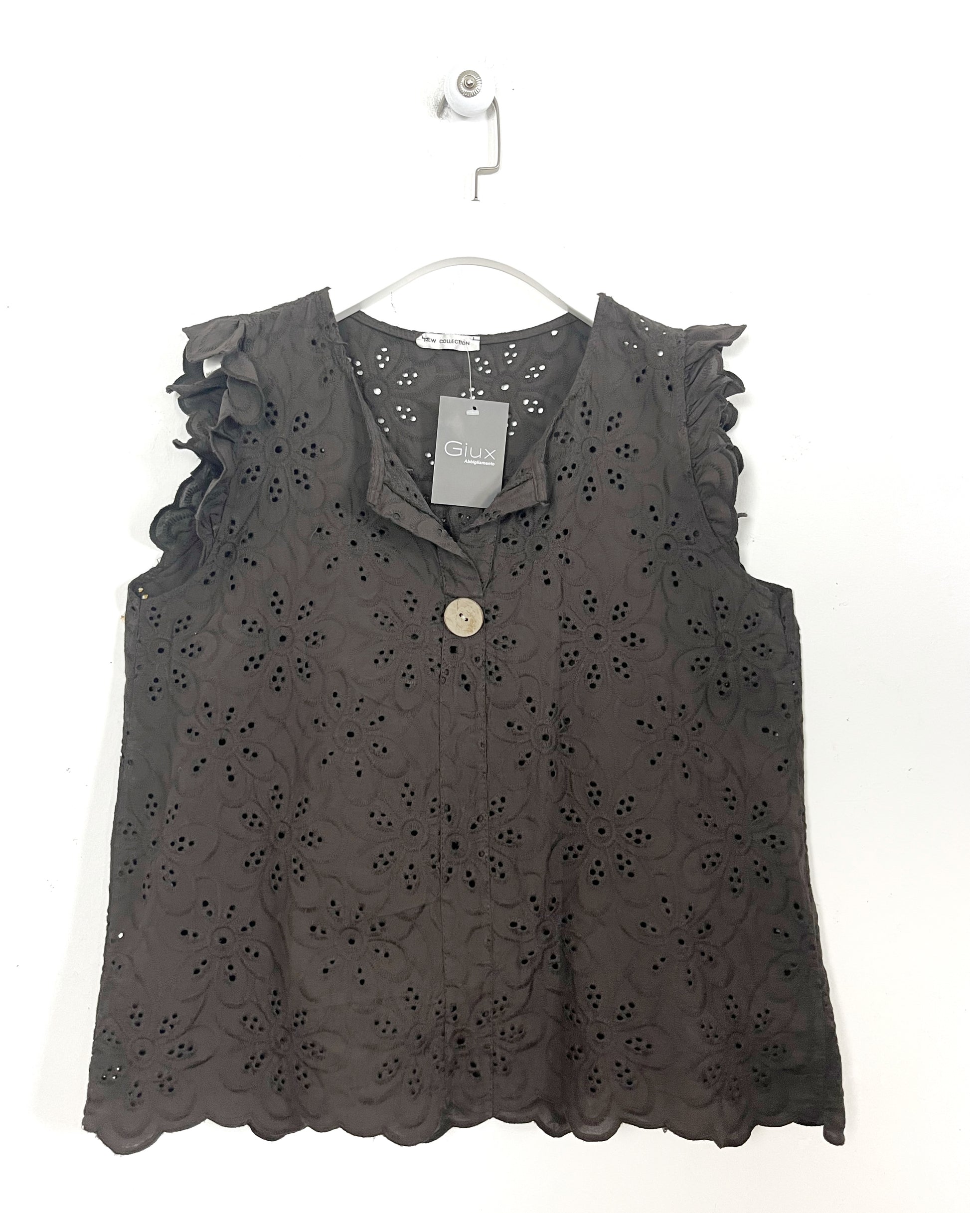 Canotta in cotone sangallo, rouge nel Giromanica. Scollatura a V con bottone in legno