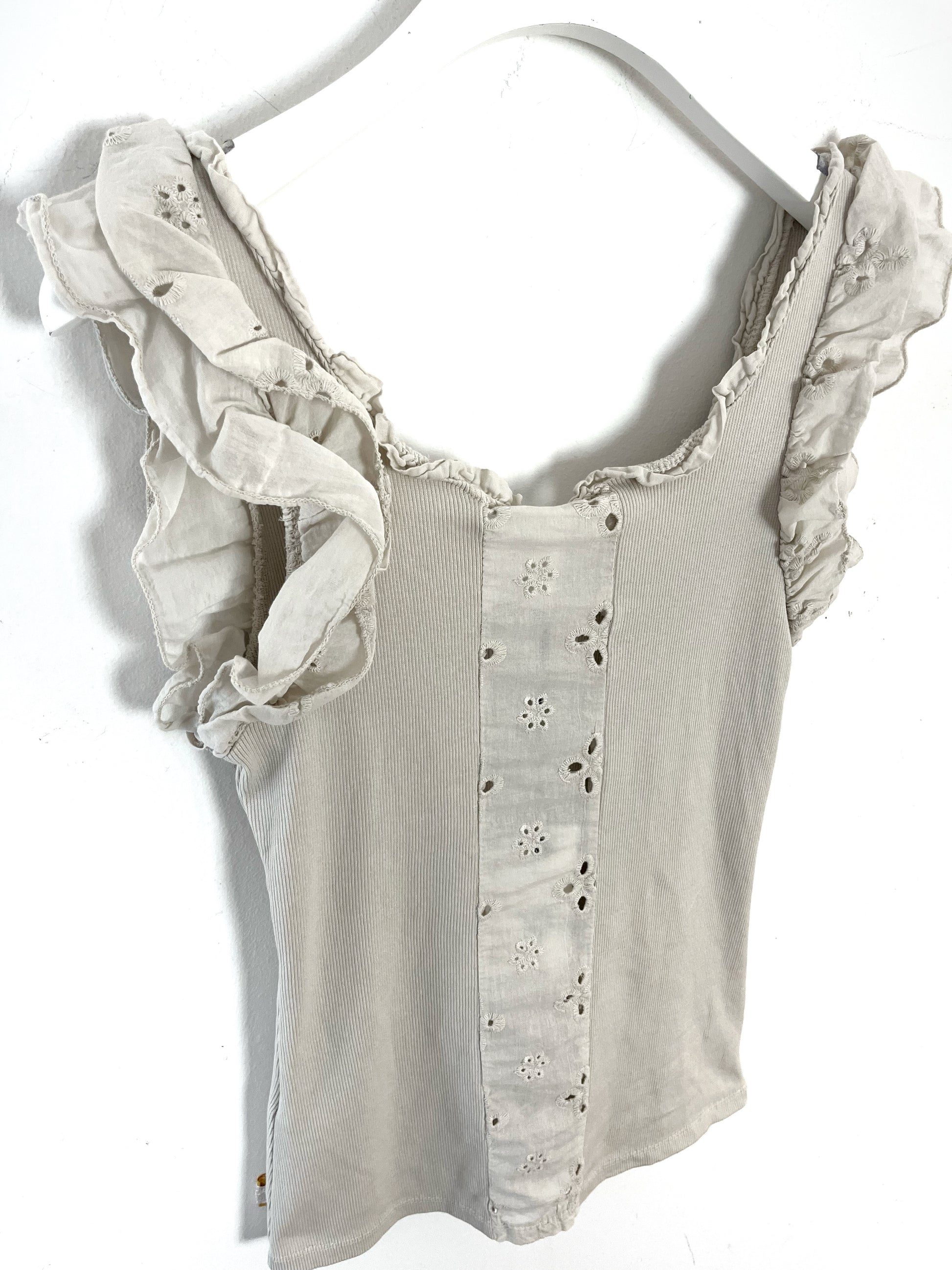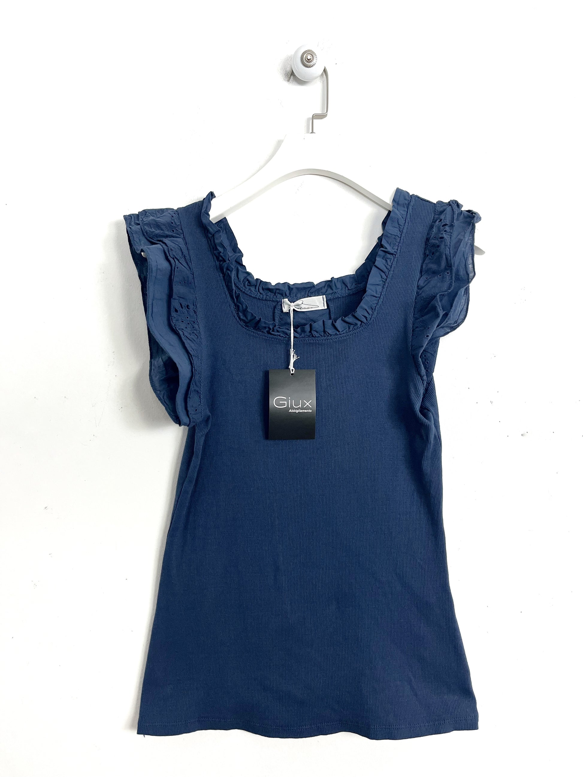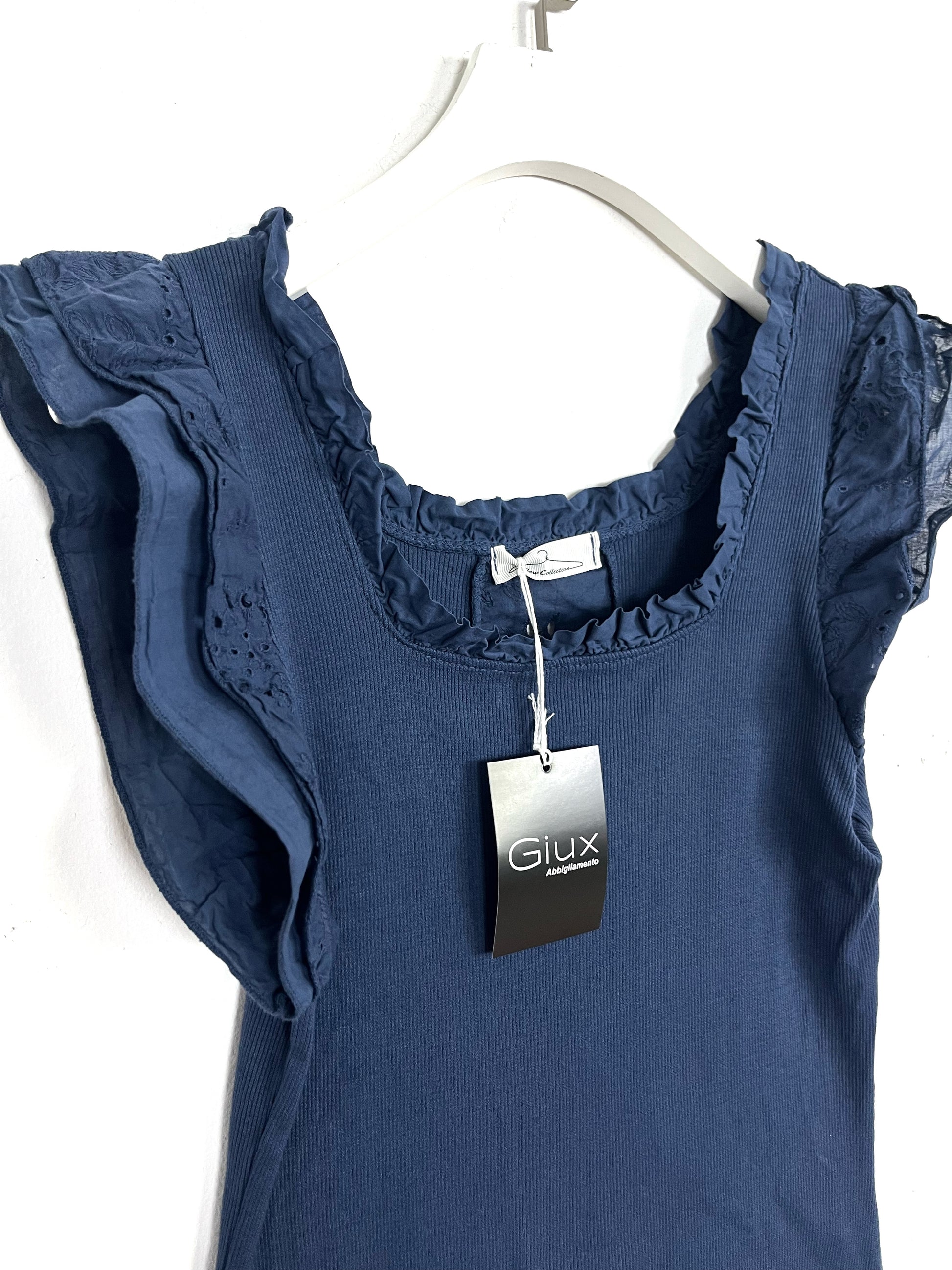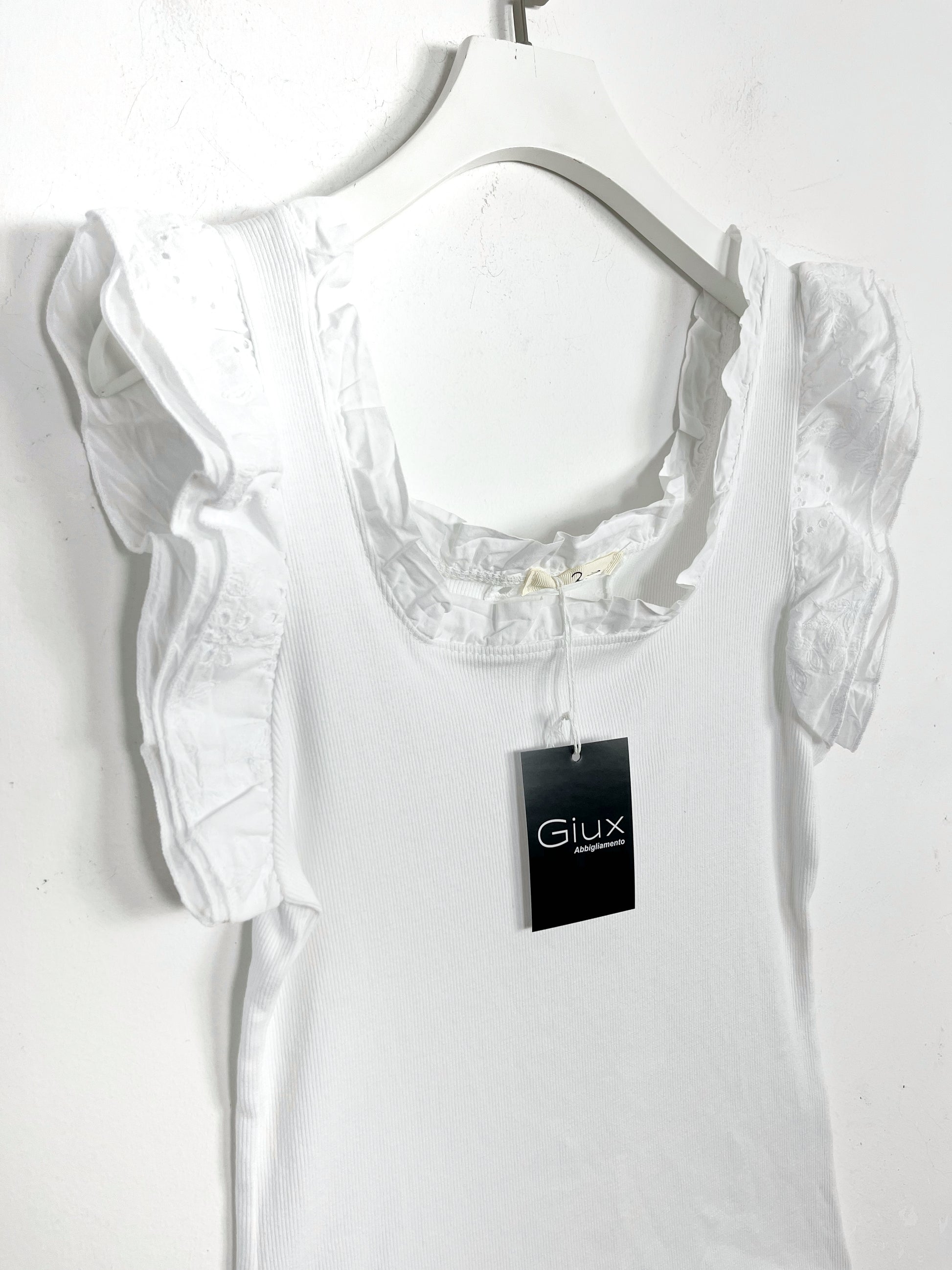 Canotta in cotone a costine. Alette in tela e sangallo in tinta. Inserto in cotone sangallo lungo la schiena