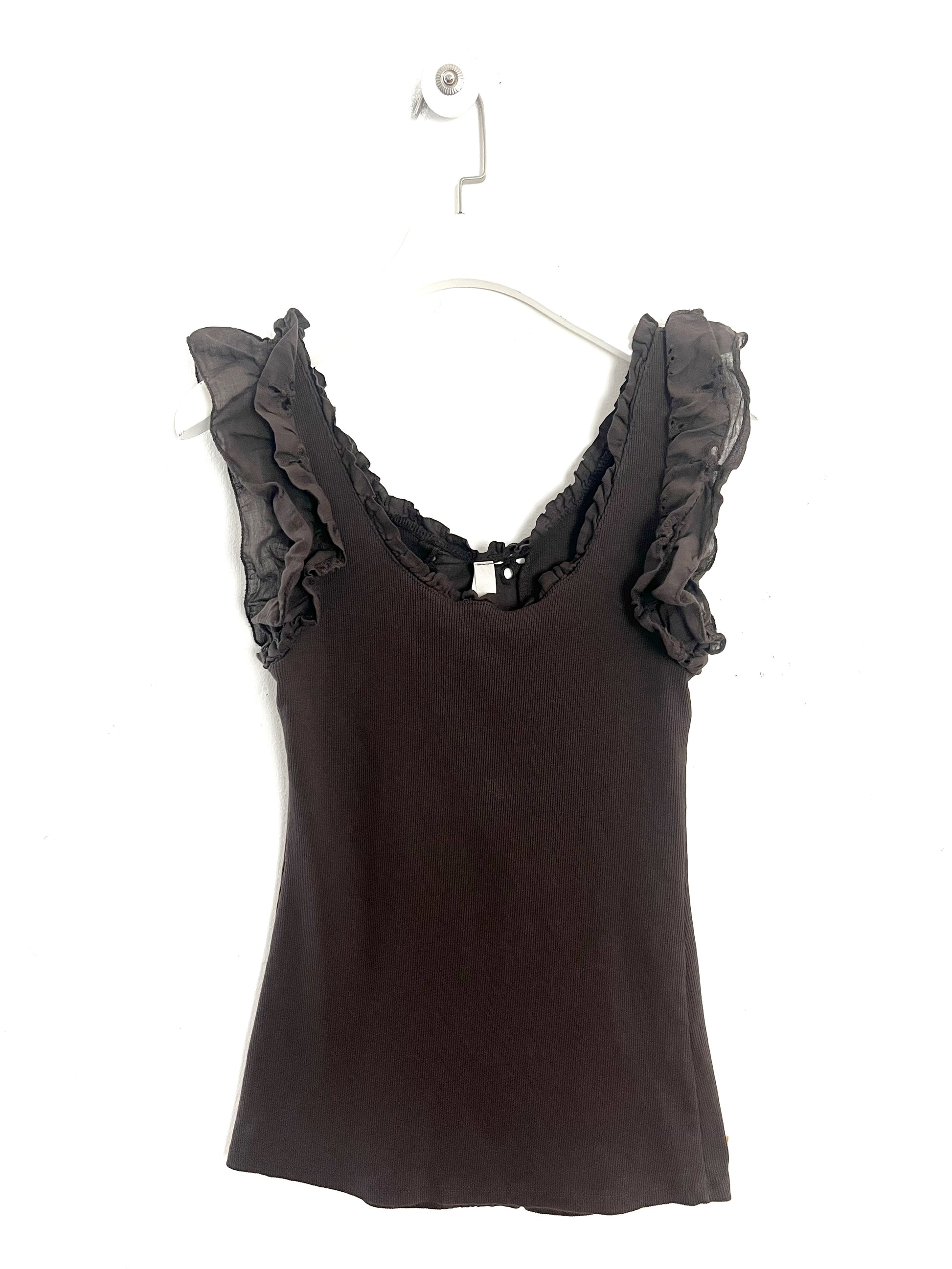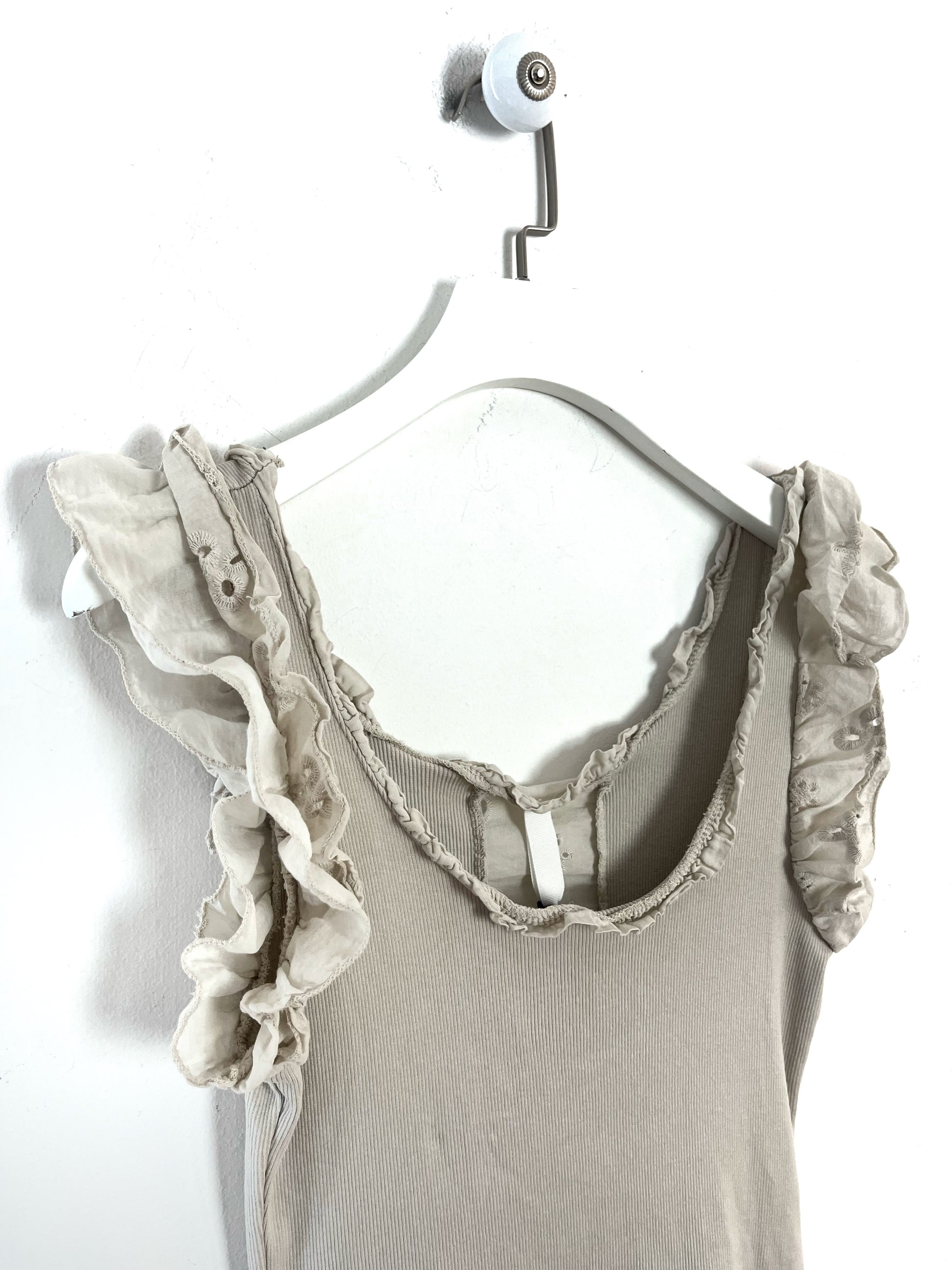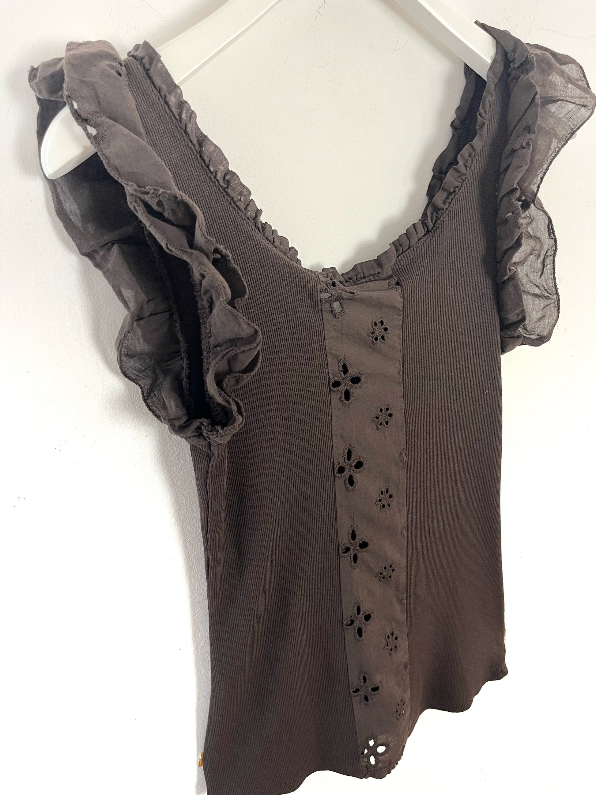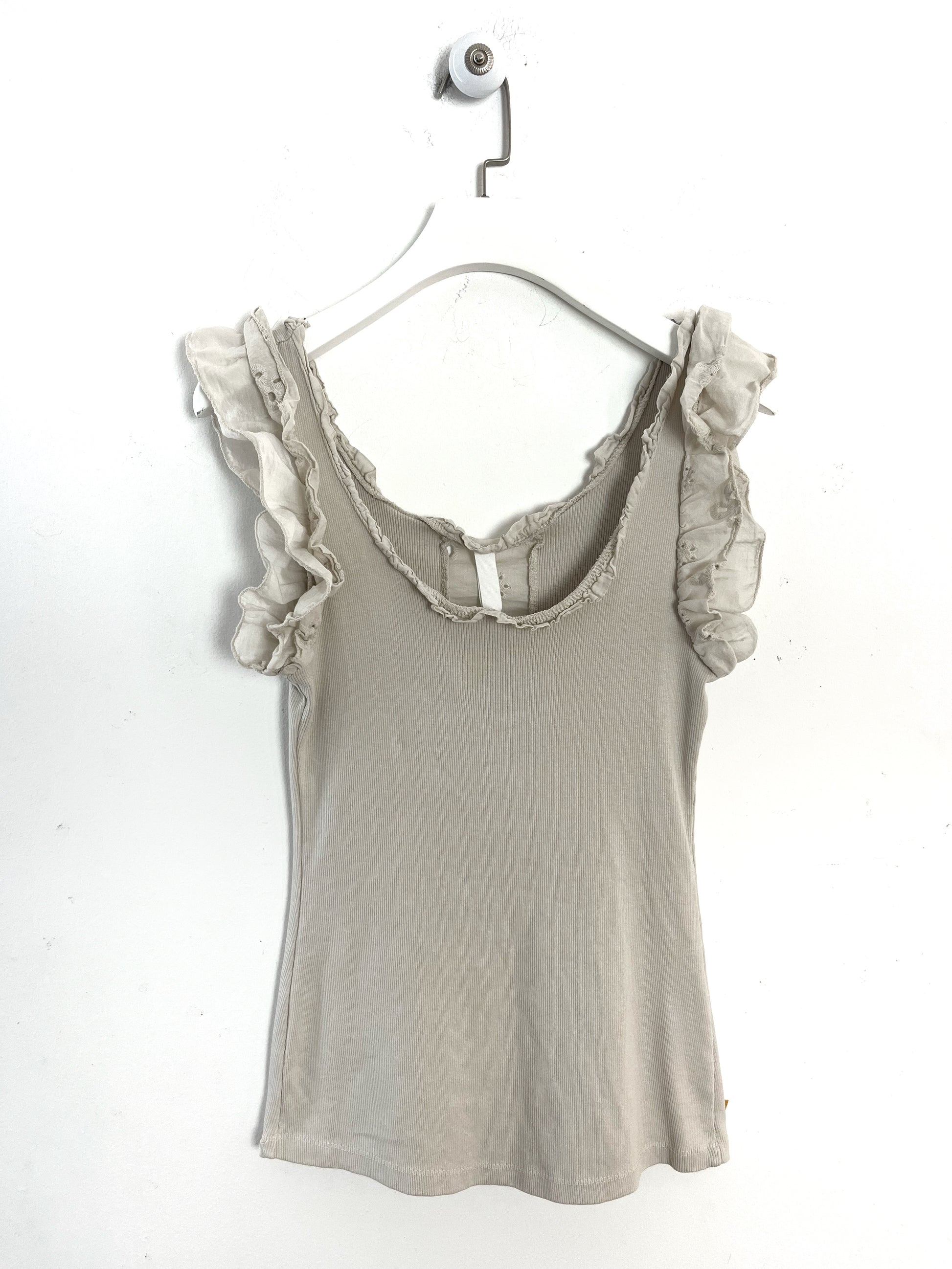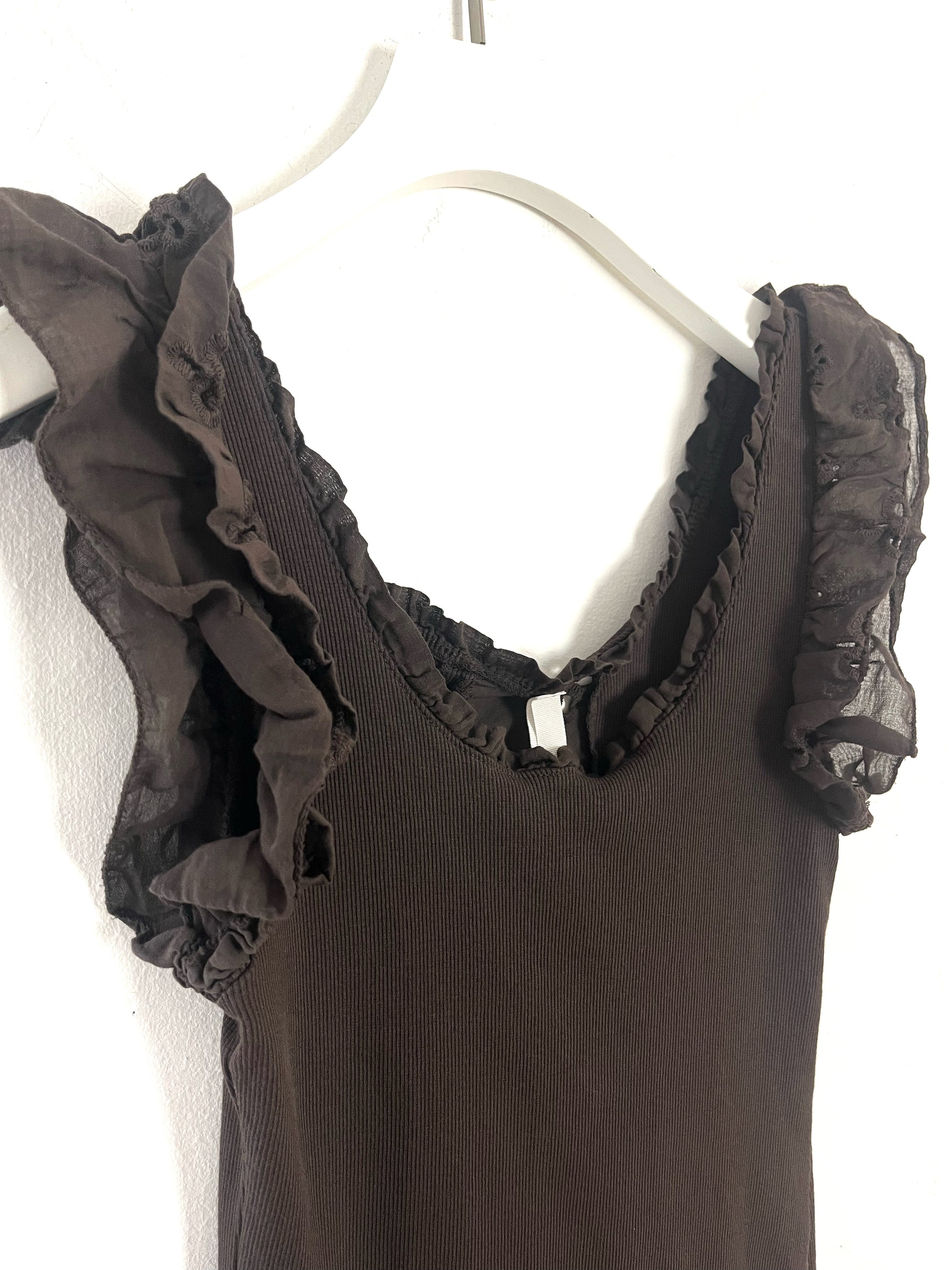 Canotta in cotone a costine. Alette in tela e sangallo in tinta. Inserto in cotone sangallo lungo la schiena