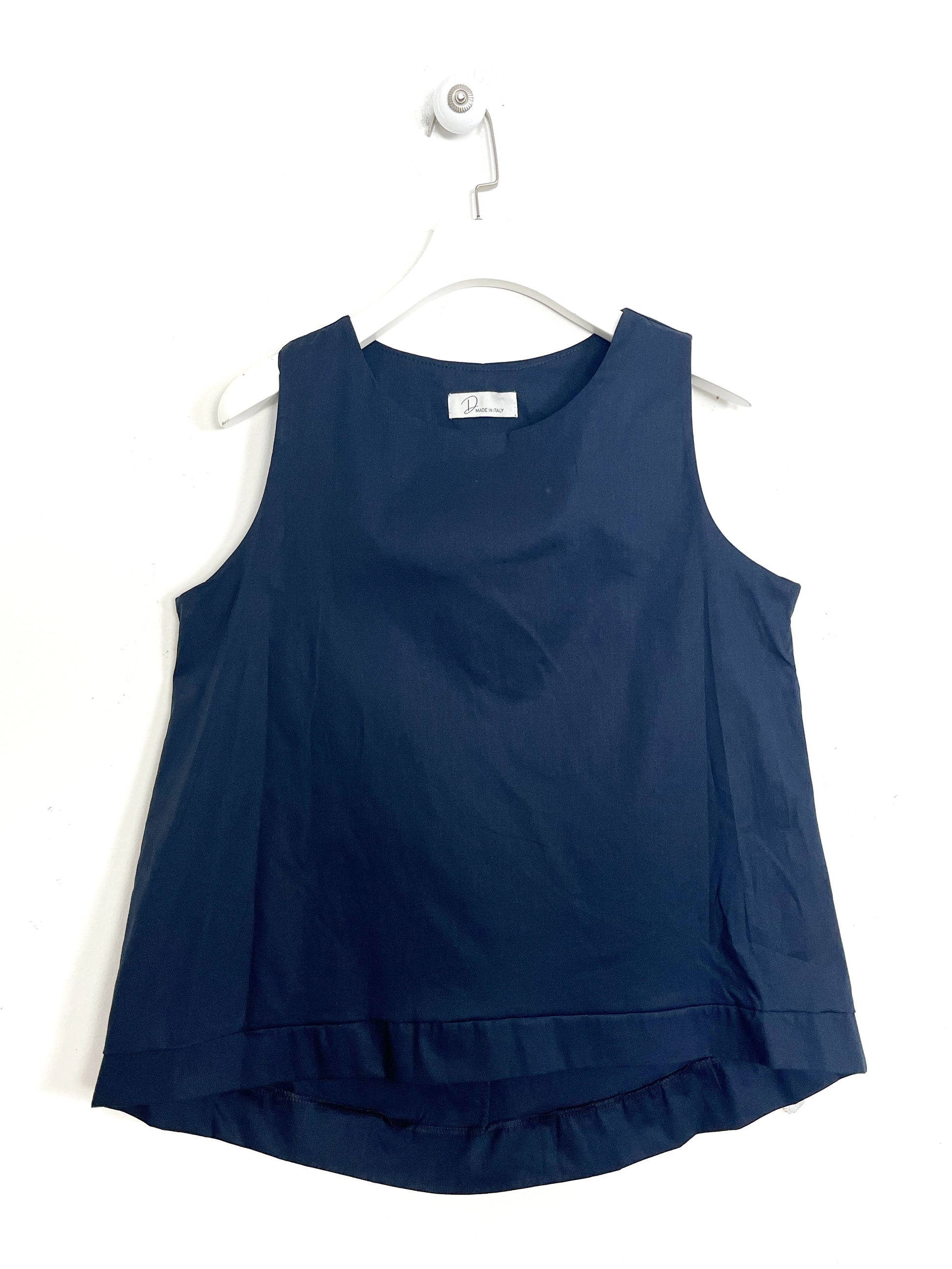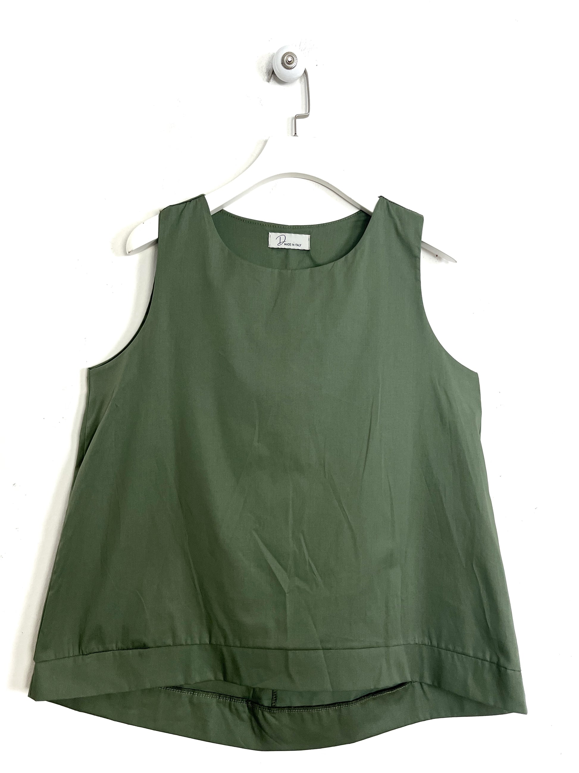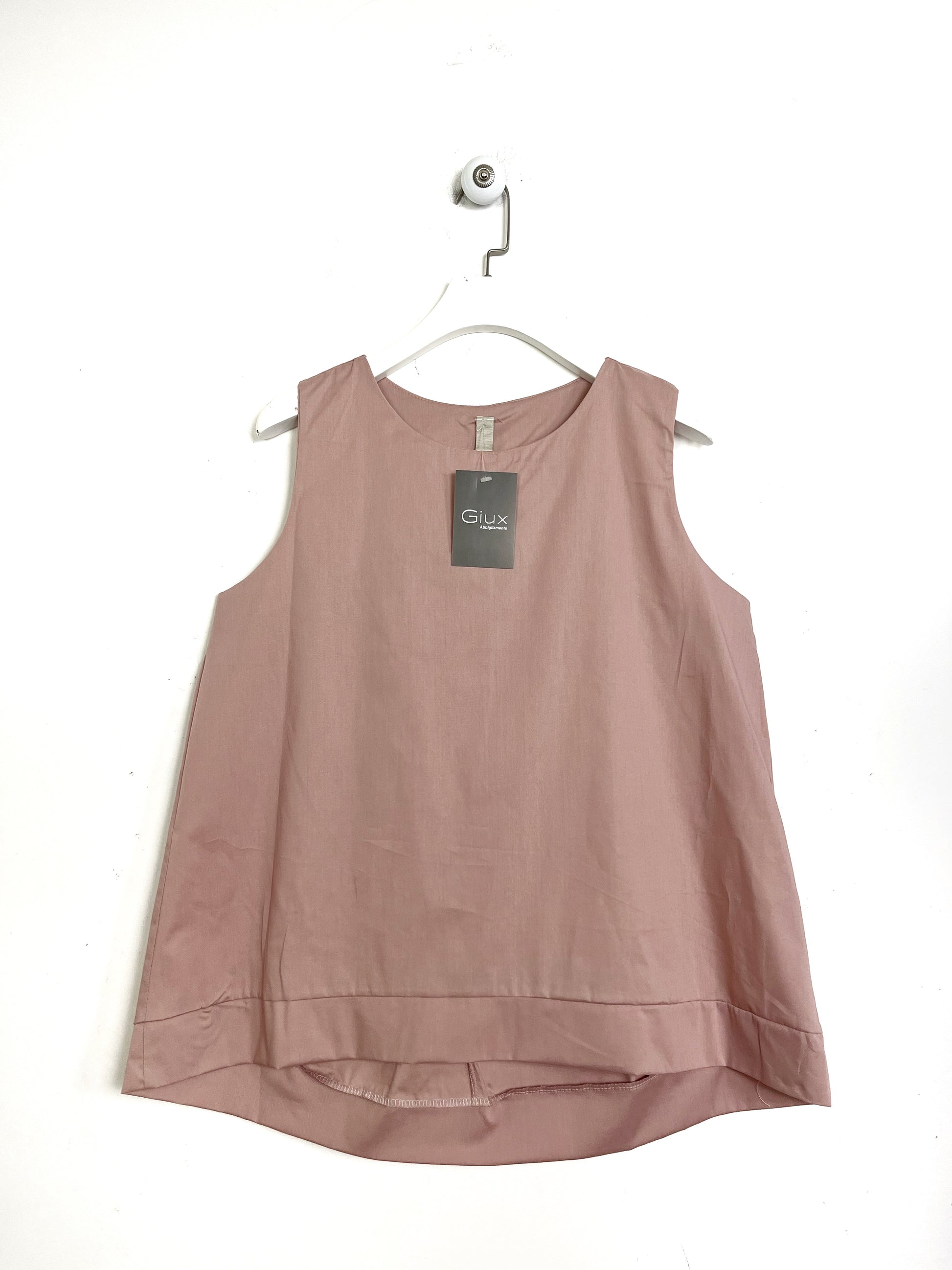 Canotta in cotone girocollo. Corta davanti, più lunga dietro. Svasata e Stondata sul fondo dietro.