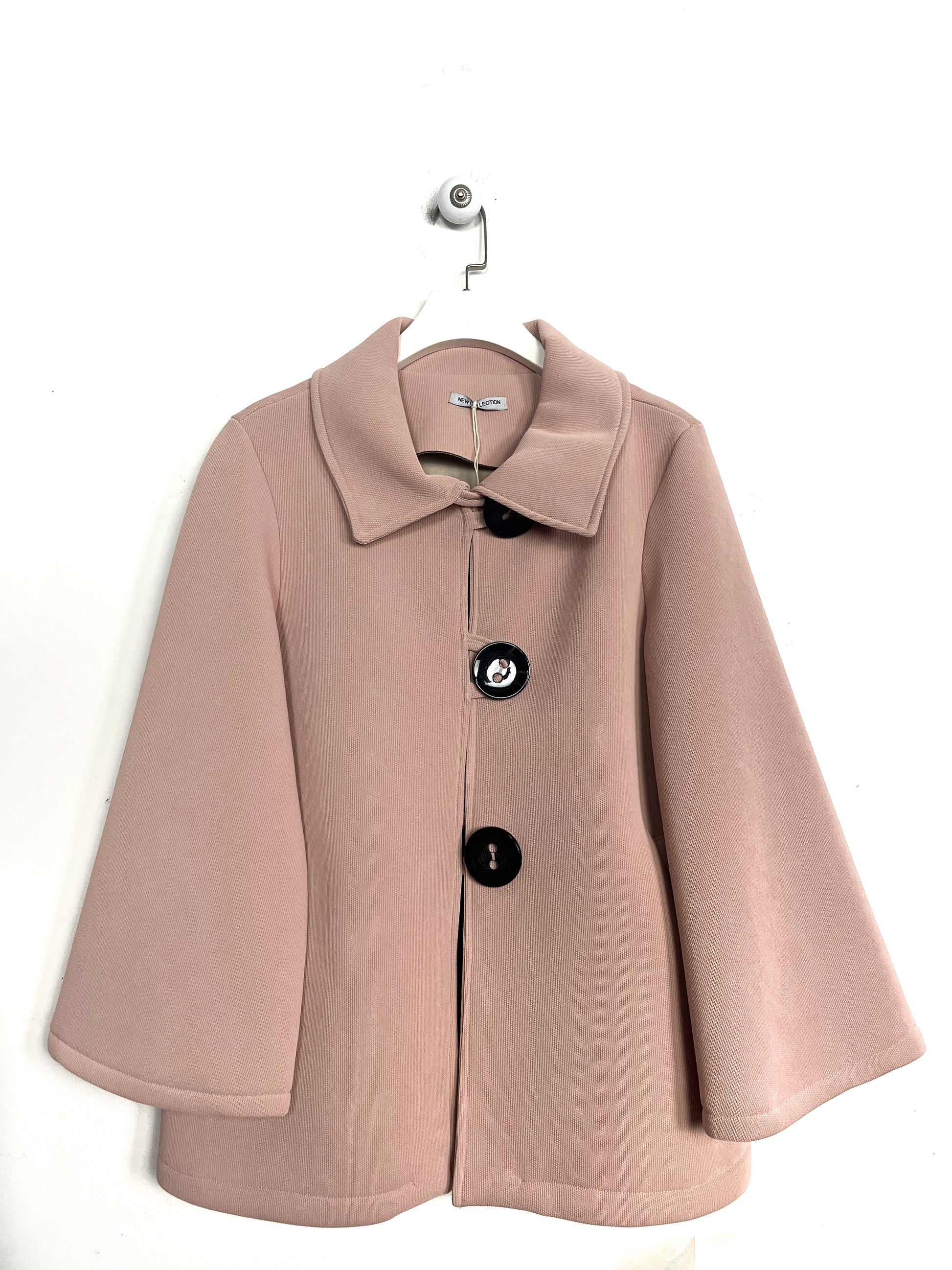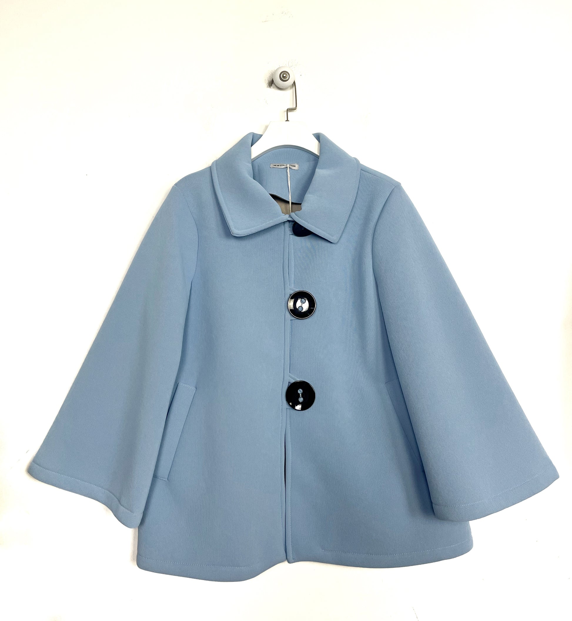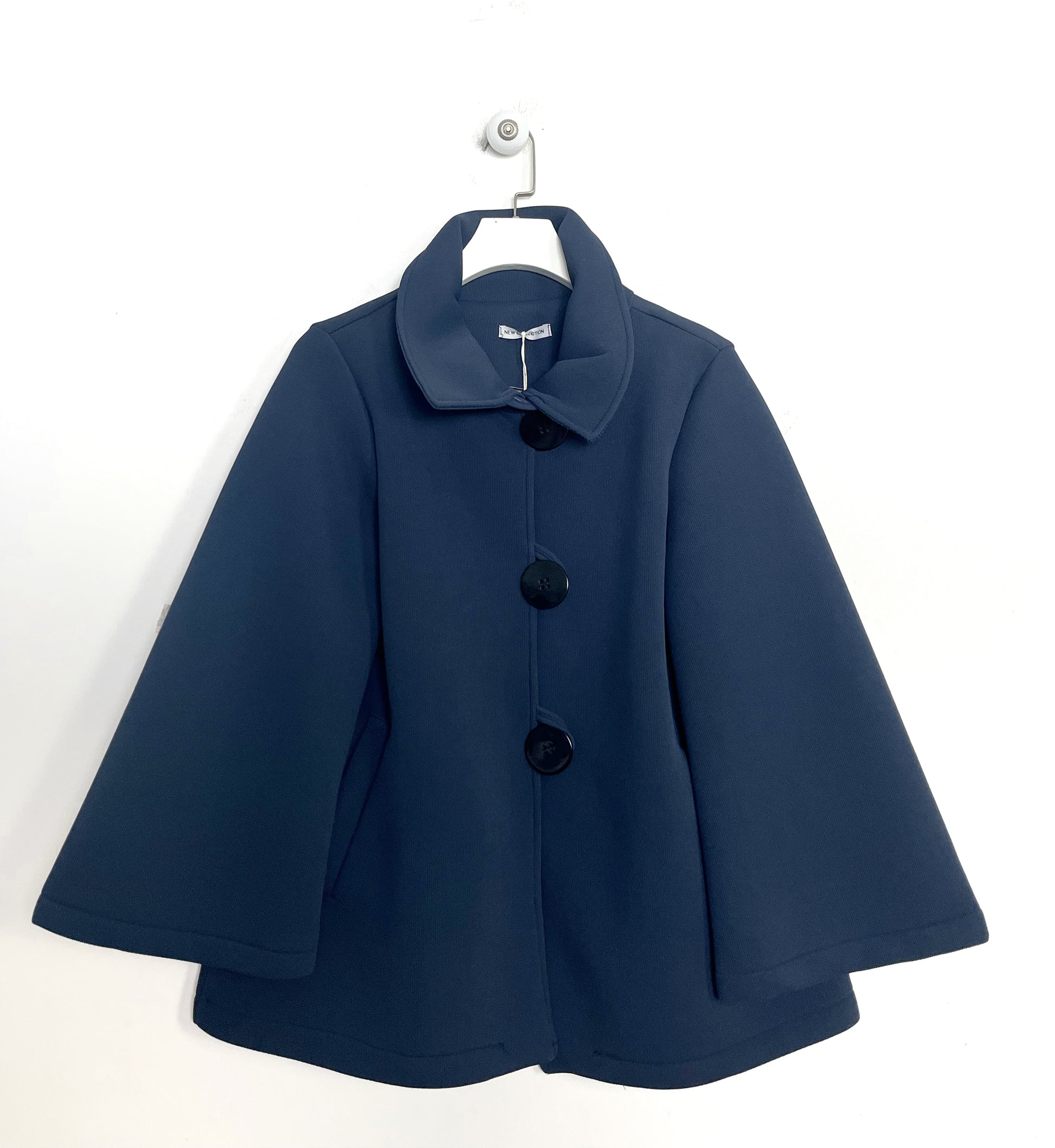 Cappa in neoprene, taglio a scatoletta. Collettone, chiusa da 3 bottoni con asola. Manica tre quarti scampanata, sfoderata.