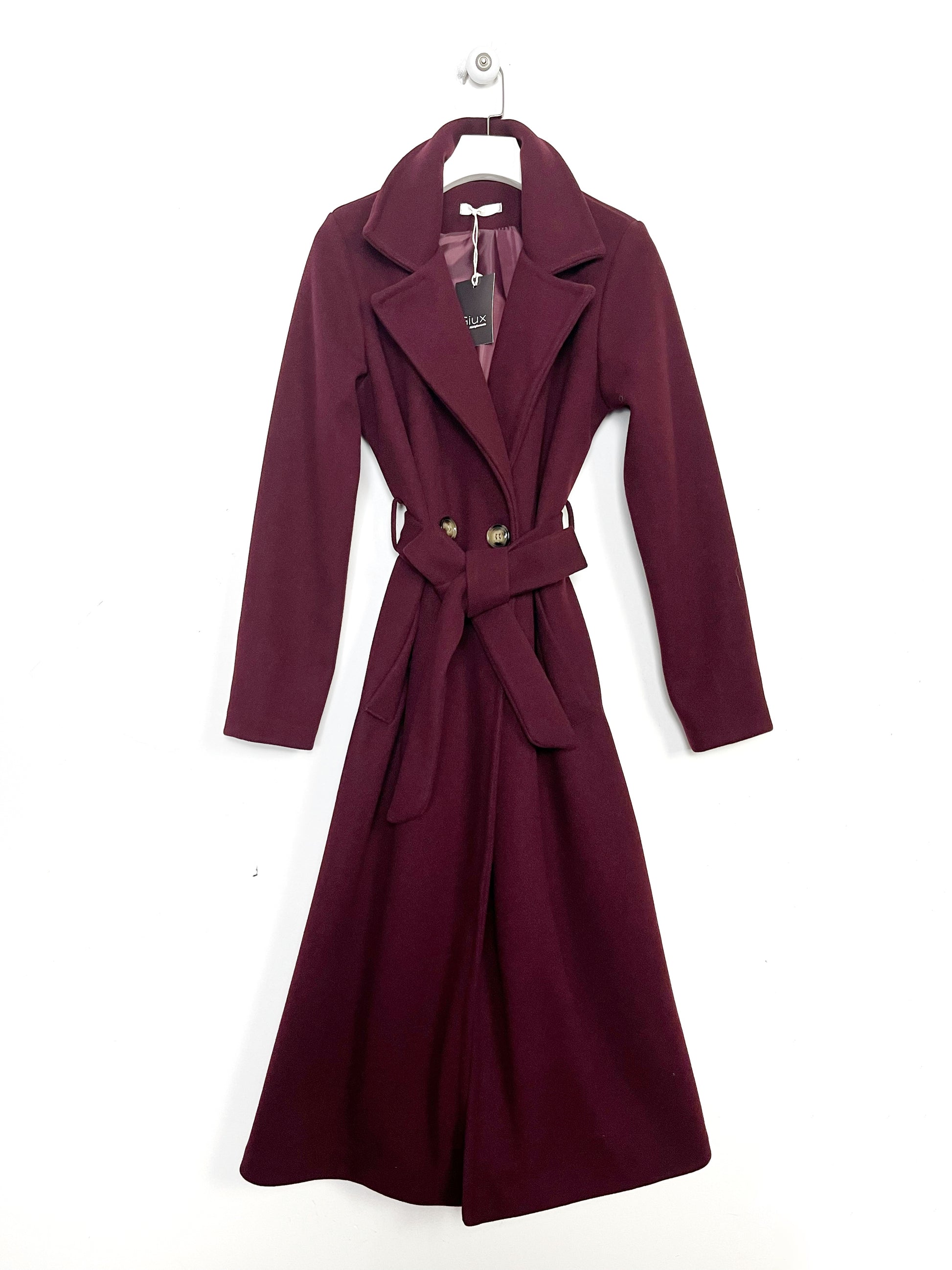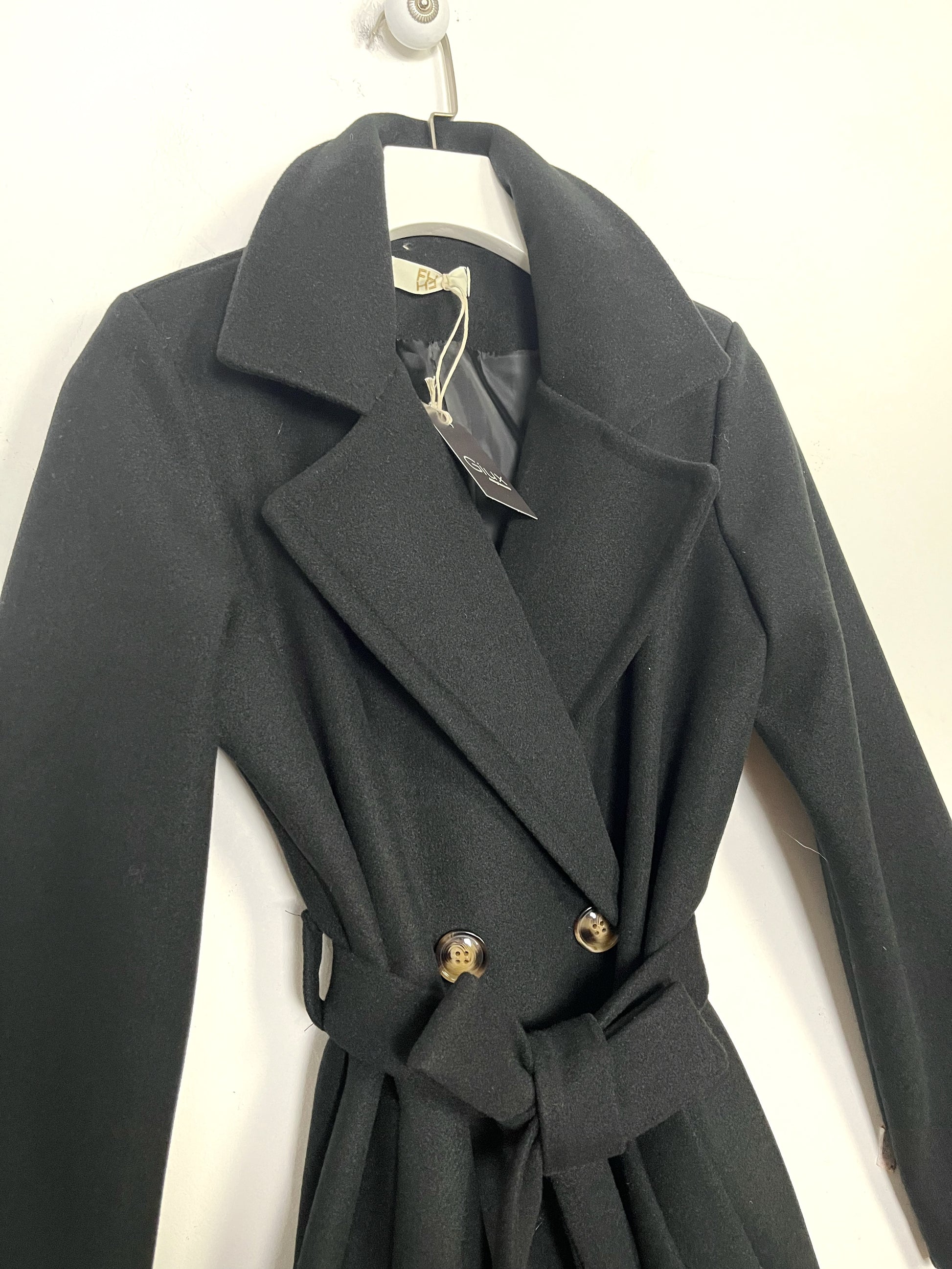 Cappotto lungo in caldissimo panno. Passanti con cintura dello stesso tessuto. Tasche laterali a scomparsa. Conto doppio petto, chiusura con Un bottone con asola. Manica lunga, foderato.