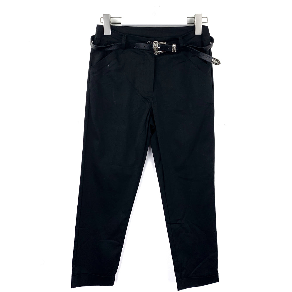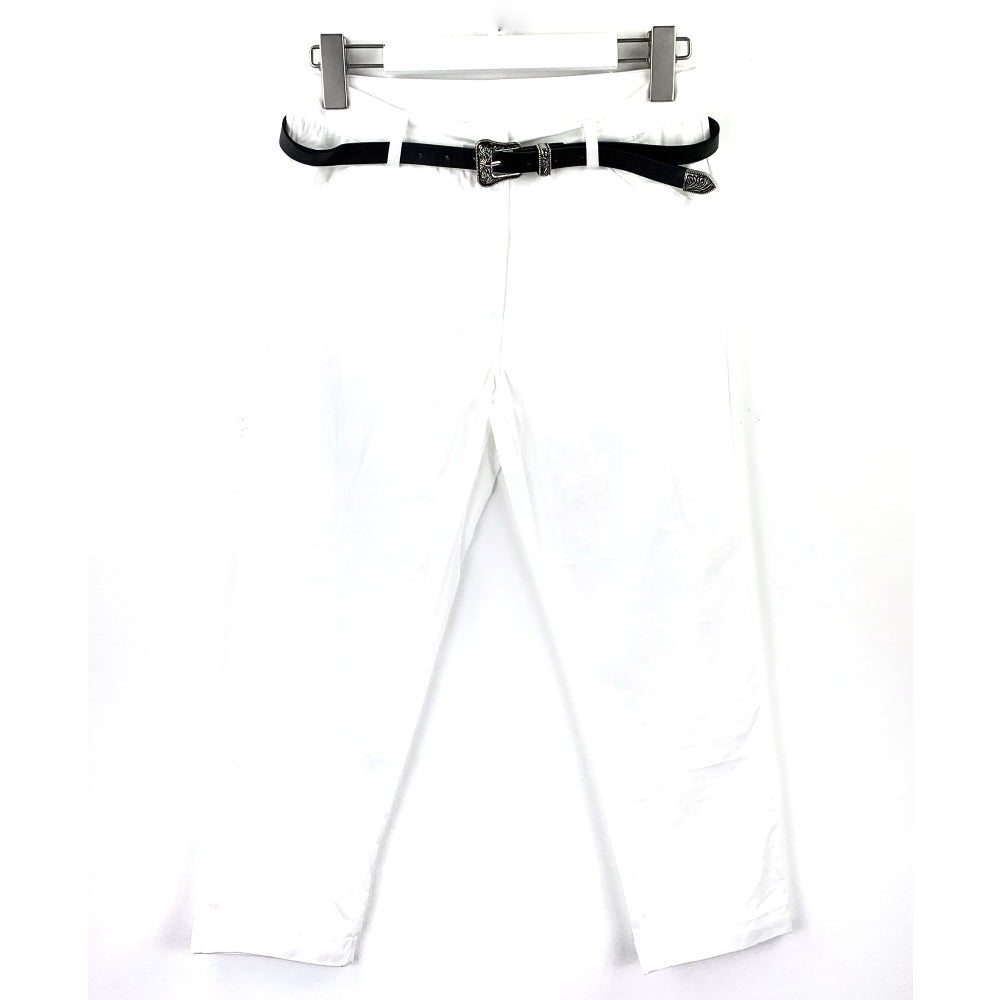 Pantalone in cotone leggero elasticizzato, lunghezza sopra alla caviglia. Vita alta con bottone e cerniera, passanti con cintura. 2 tasche oblique laterali, una tasca dietro finta a scomparsa. Con risvoltino.