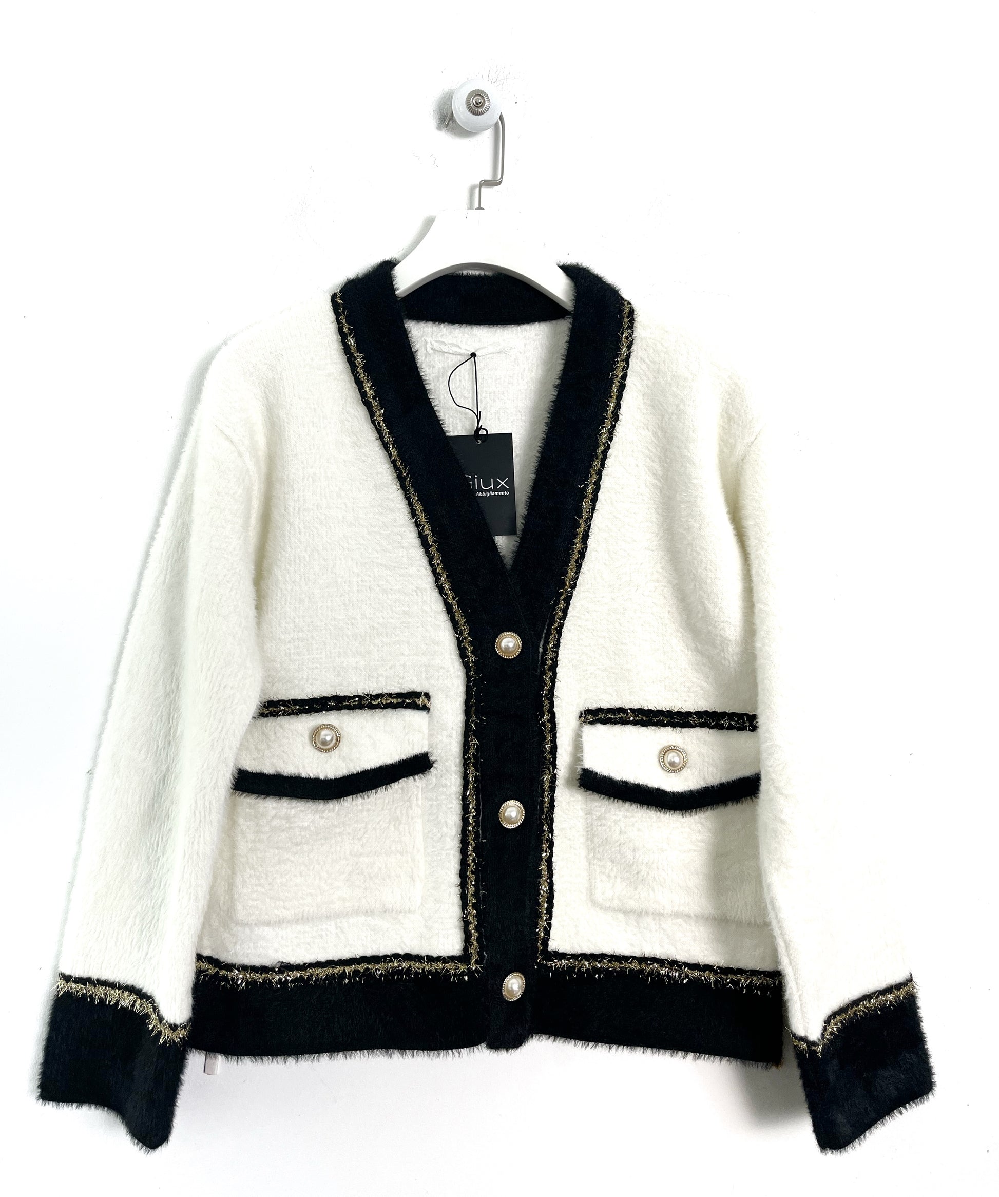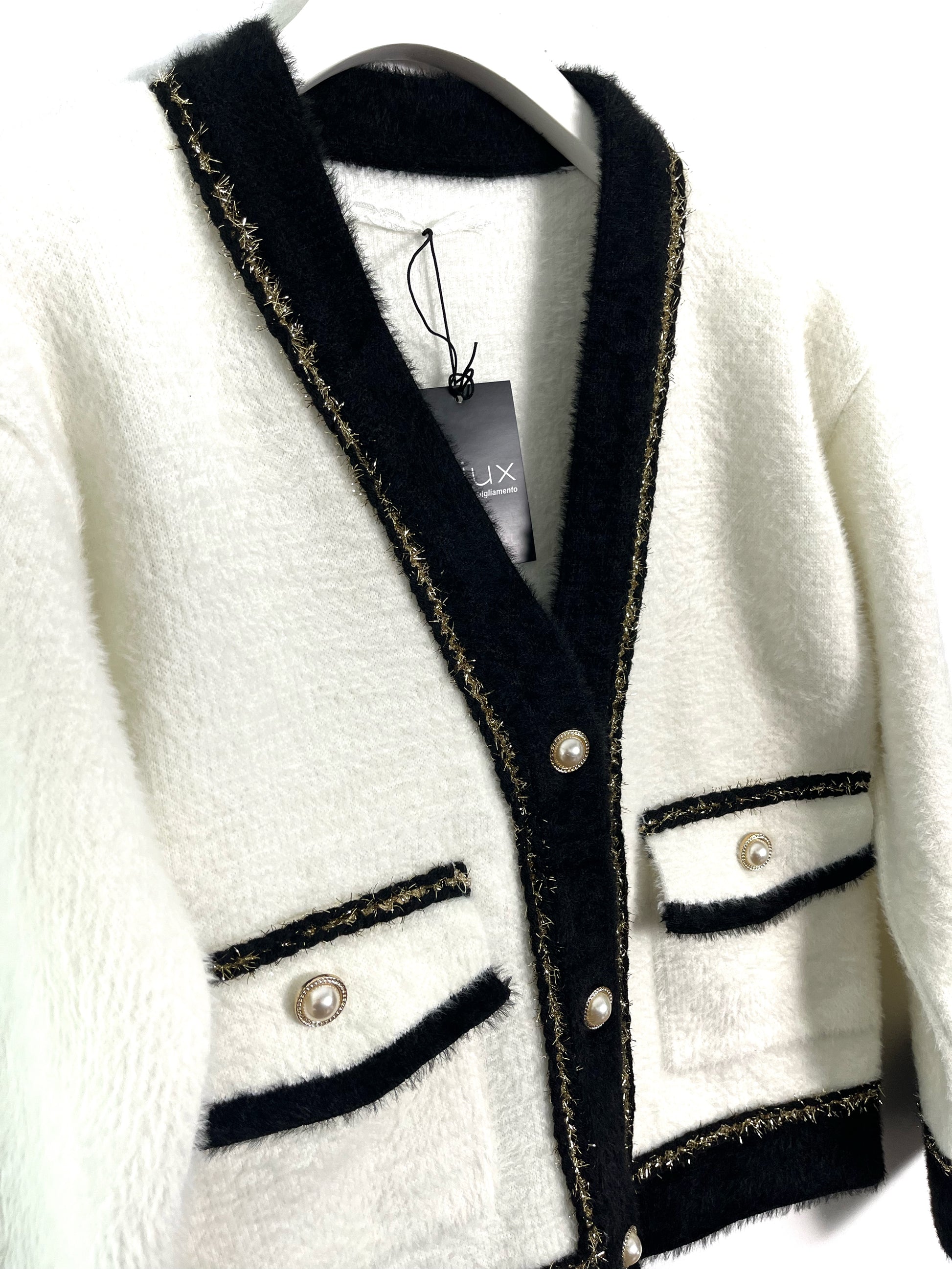 Cardigan abbottonato sul davanti. Con tasche. Dettagli in contrasto sui bordi e nelle maniche. Calda viscosa effetto peloso