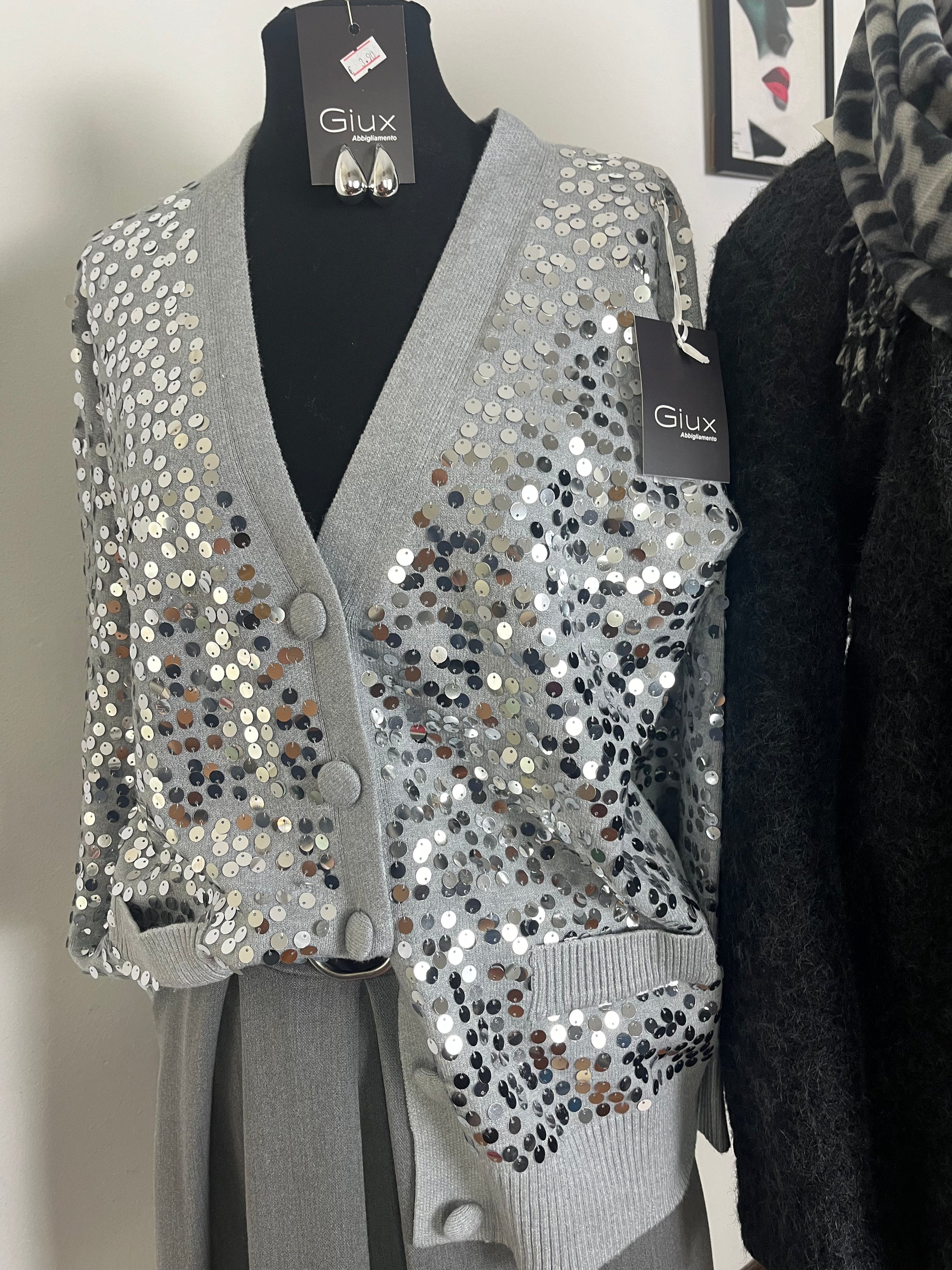 Cardigan in morbido viscosa con paillettes cucite sul davanti. Bottoni ricoperti. Tasche finte davanti. Vestibilità morbida.