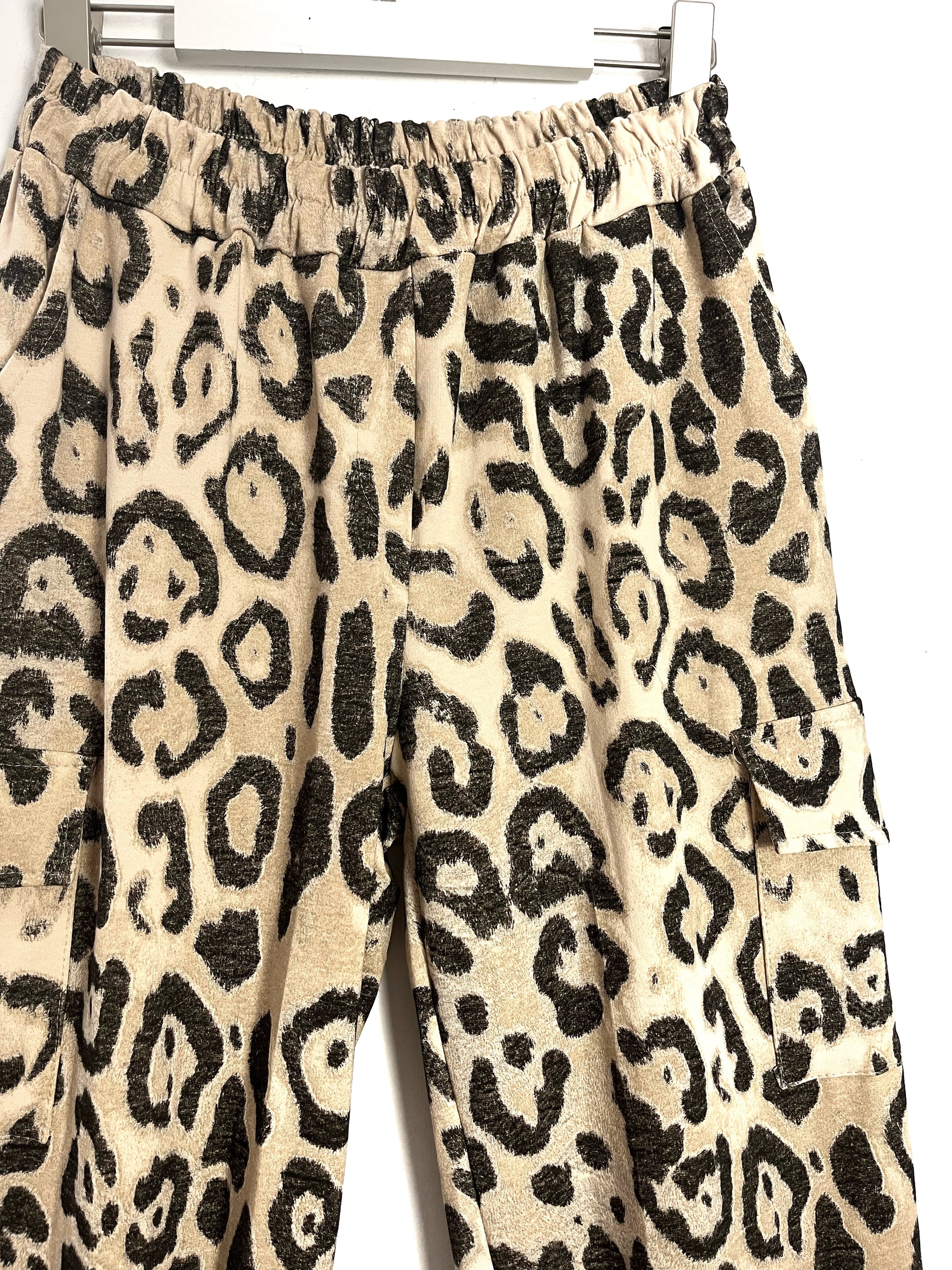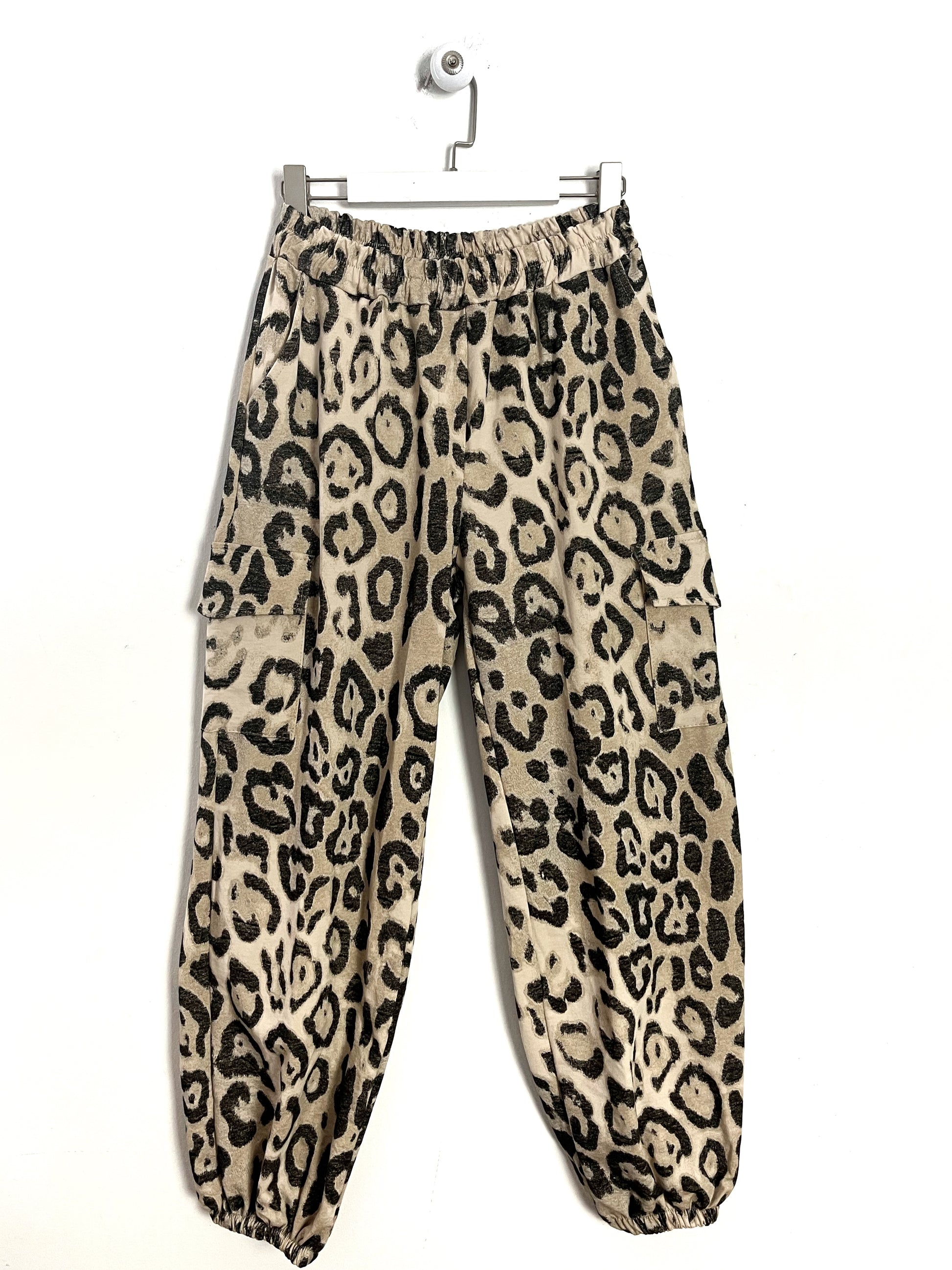 Cargo in morbida felpa di cotone garzato. Vita alta con elastico, tasche laterali, 2 taschini con patta sulla gamba. Chiusura sul fondo con elastico.