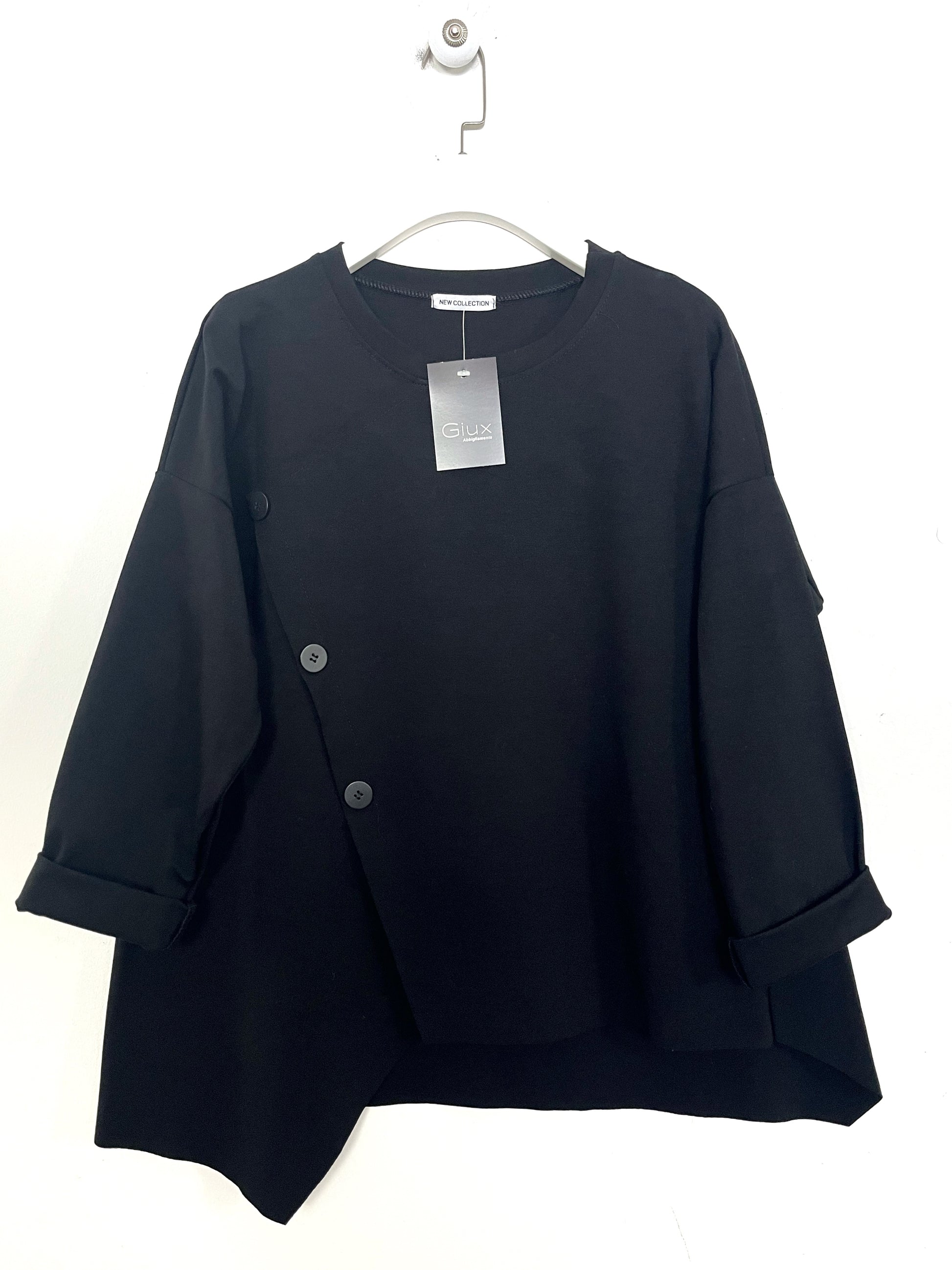 Casacca girocollo in punto milano di cotone. Morbida,manica lunga, svasata sul fondo. Corta davanti, più lunga dietro. Asimmetrica. Bottoni applicati sul davanti