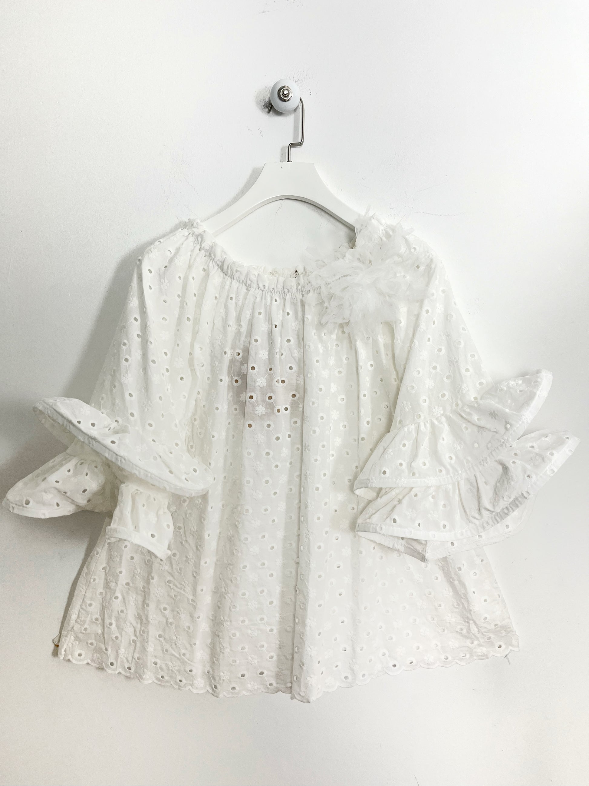 Casacca in puro cotone tutta ricamata, scollatura a barchetta con elastico. Manica tre quarti con doppia rouge , svasata sul fondo. Spilla in tulle applicata