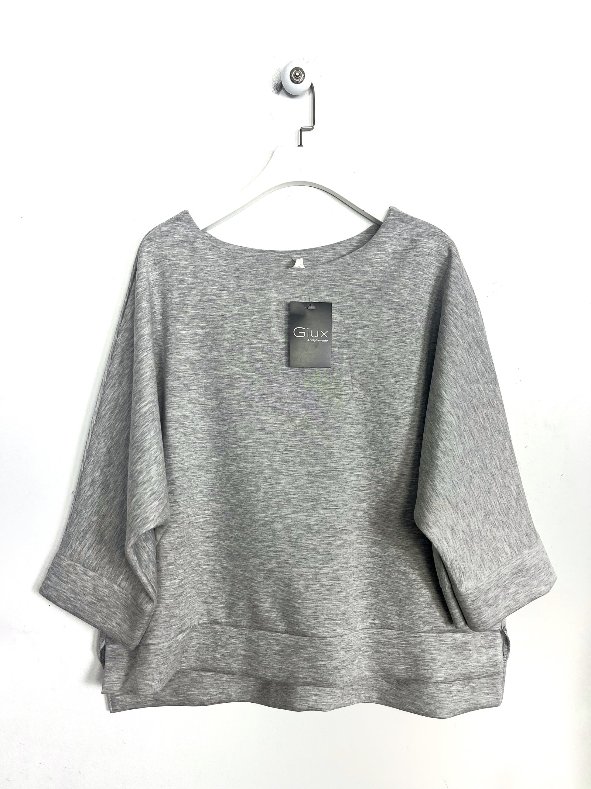 Felpa girocollo in leggerissimo neoprene. Spalla ribassata manica tre quarti. Spacchi laterali, corta davanti più lunga dietro