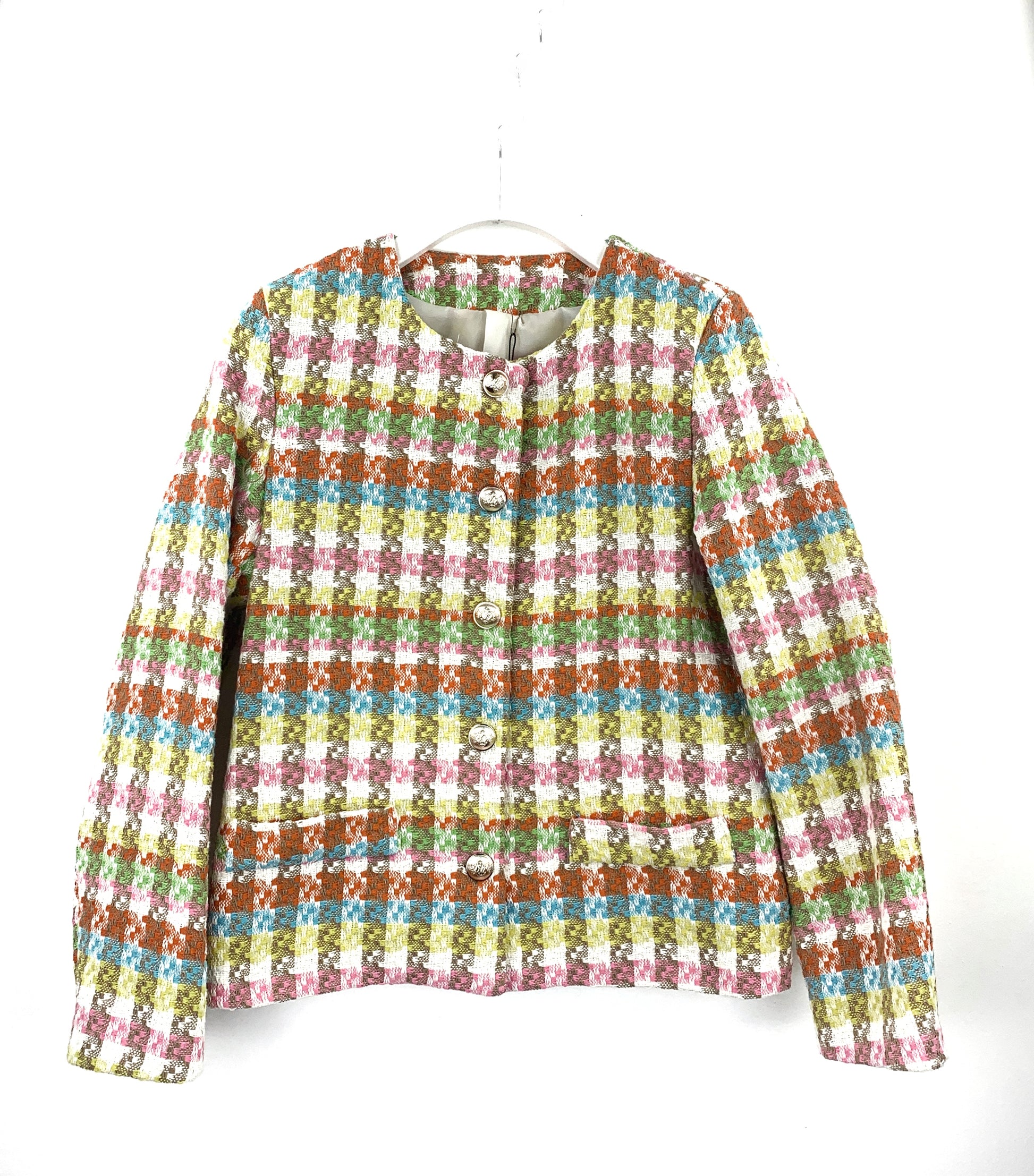 Giacca girocollo in bouclé di cotone. Scollatura girocollo, bottoni dorati sul davanti. Manica lunga, foderata.