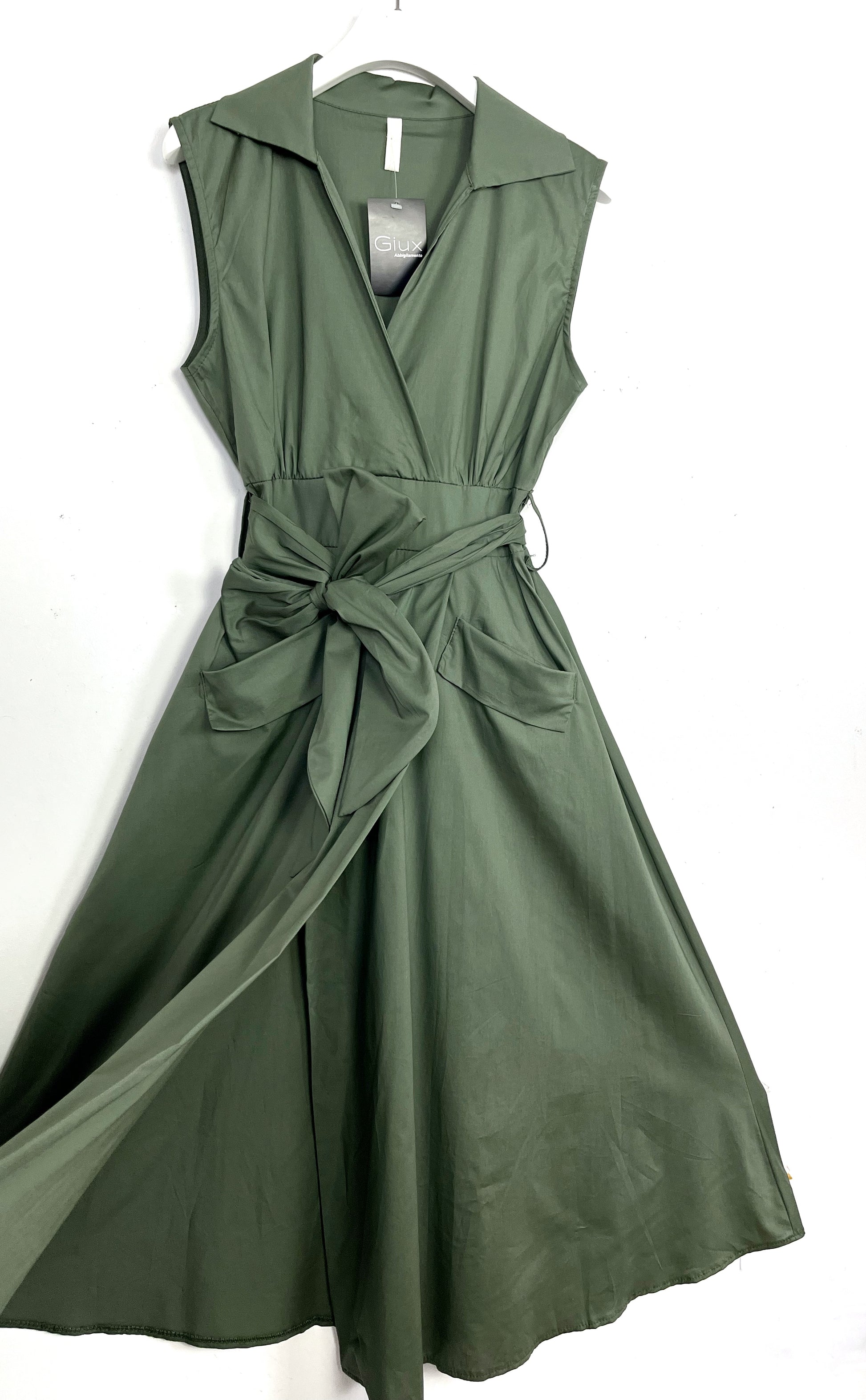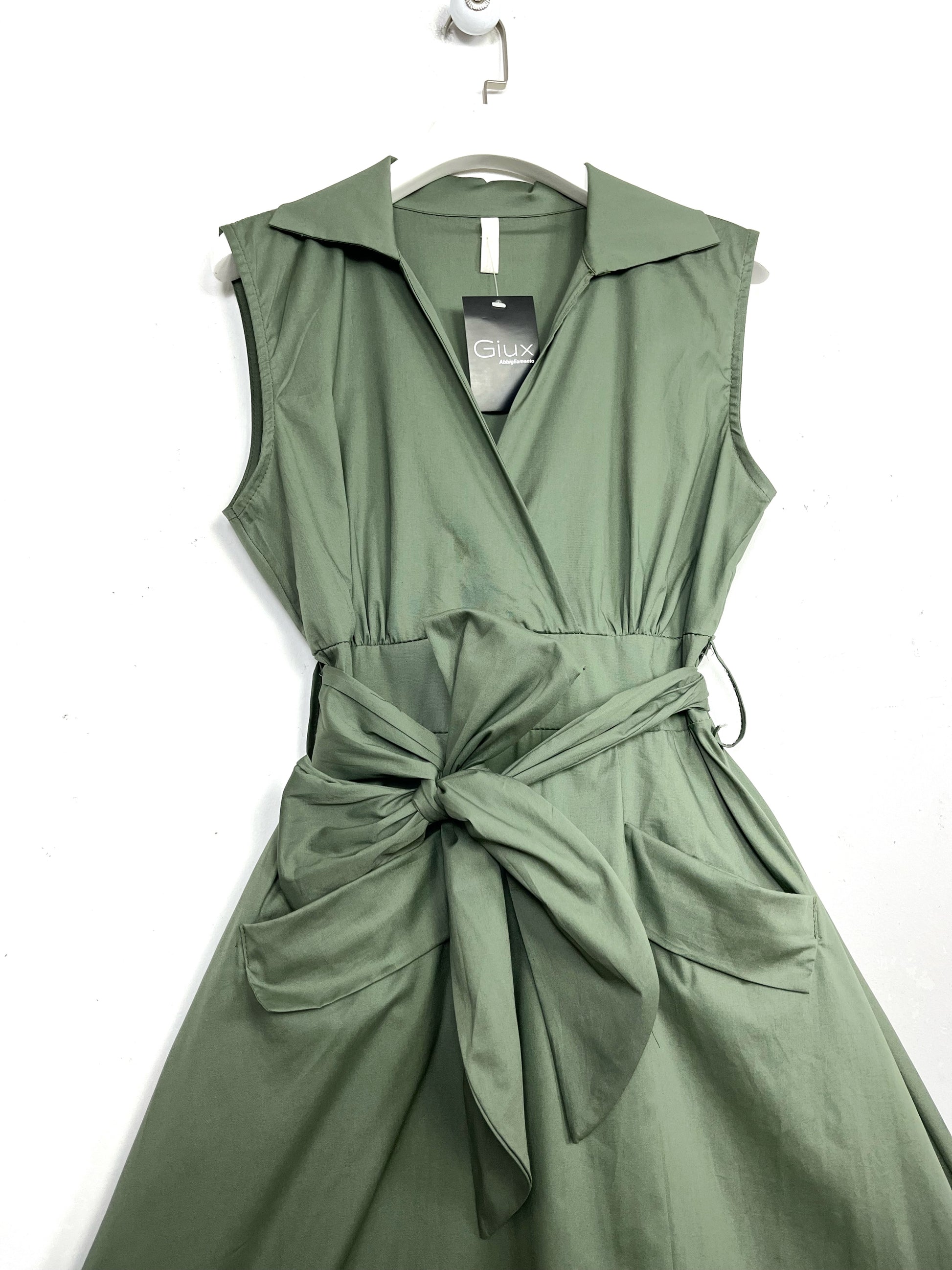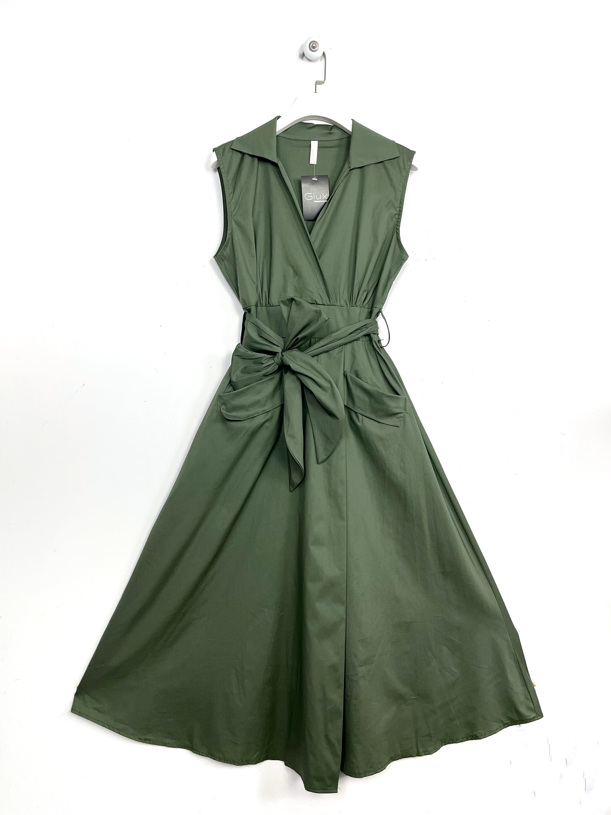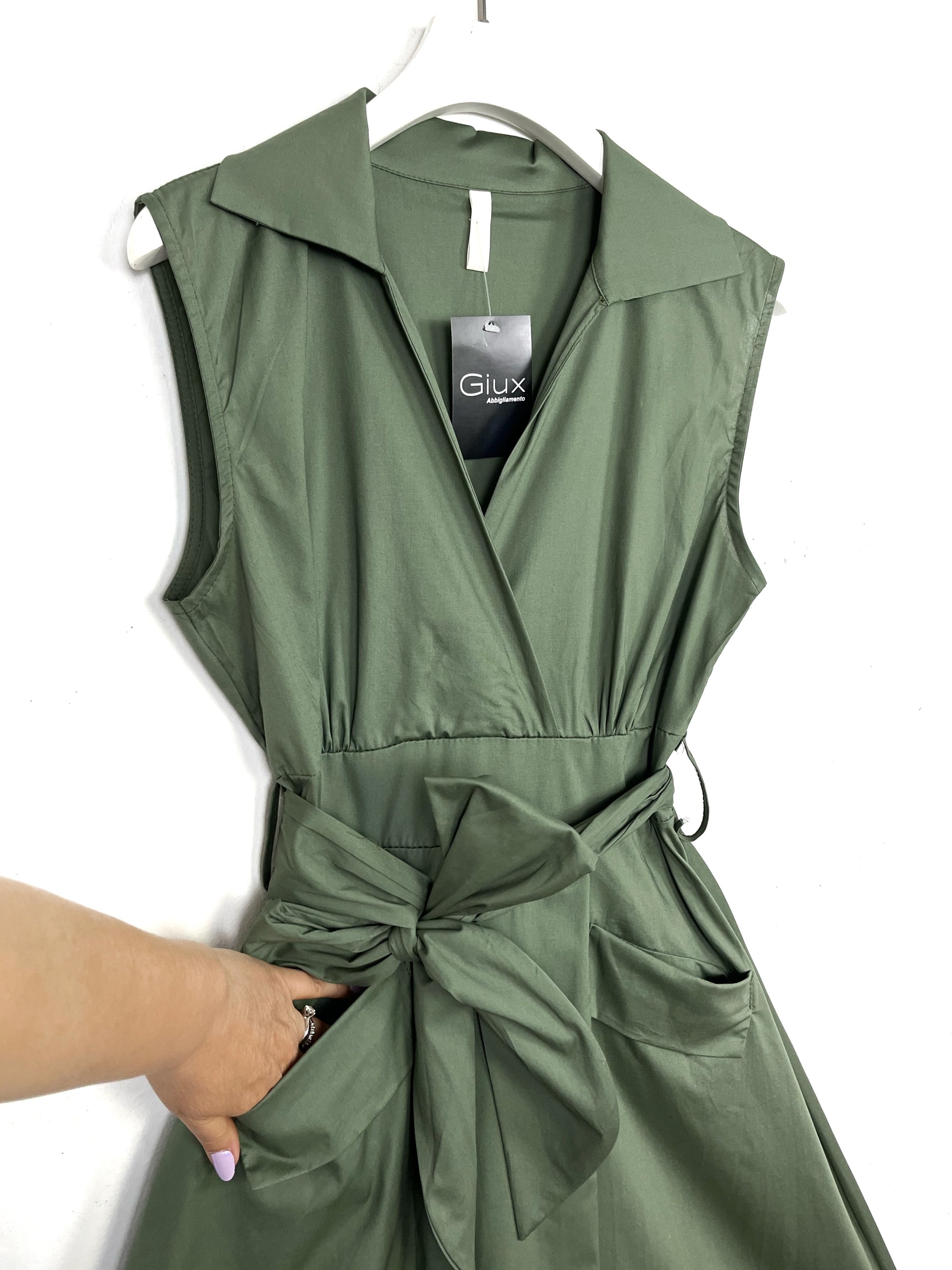 Abito in leggerissimo cotone con colletto, scollatura incrociata, smanicato. Tagliato in vita, con passanti e cintura in tessuto. Gonna a portafoglio con tasche applicate sul davanti, lunghezza alla caviglia svasato.