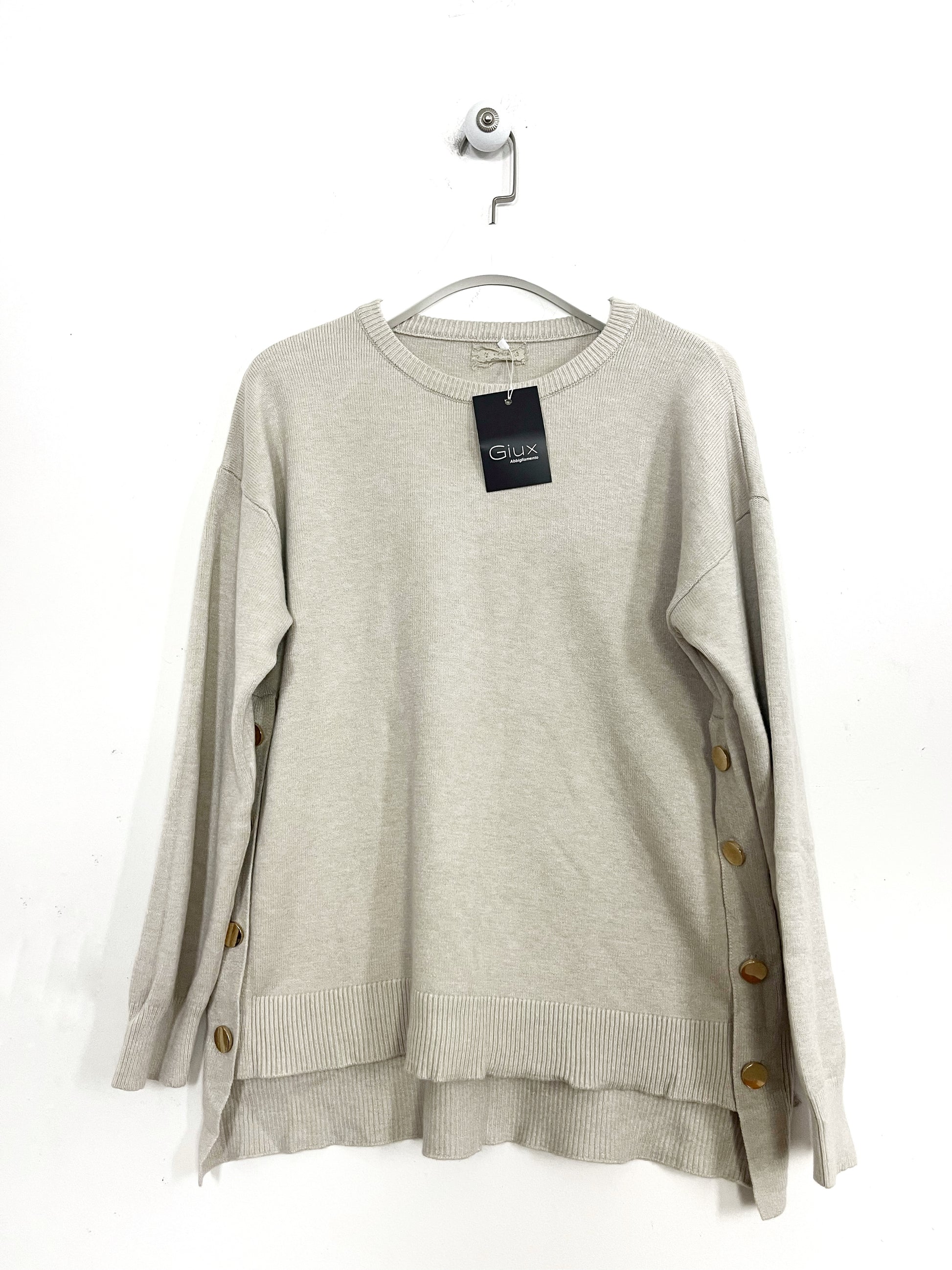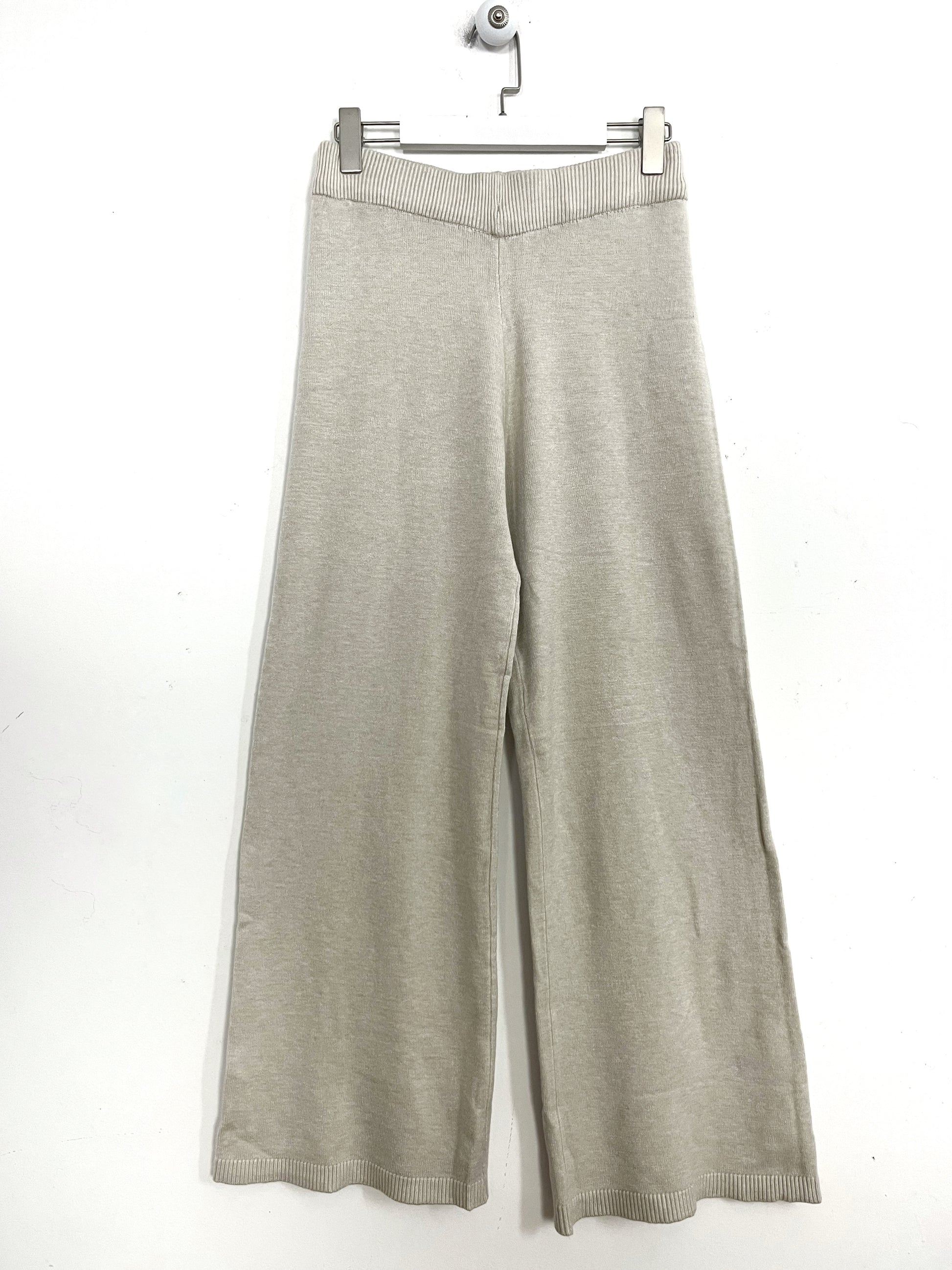 Completo in calda viscosa. Maglia girocollo, corta davanti più lunga dietro. Bottoni con asole laterali.Pantalone a palazzo vita alta con elastico.