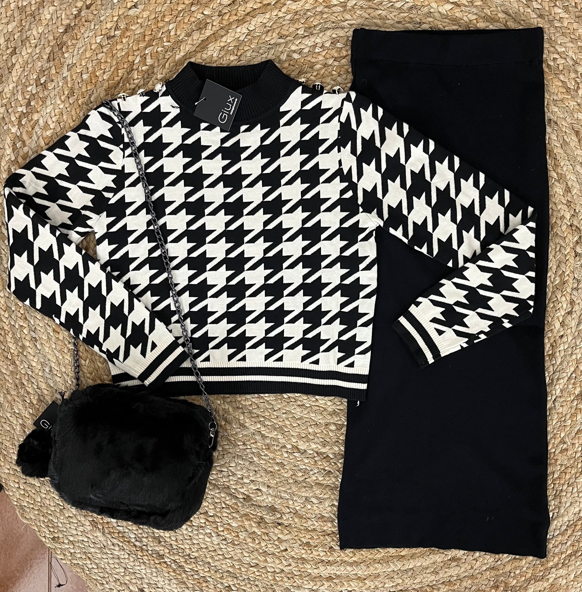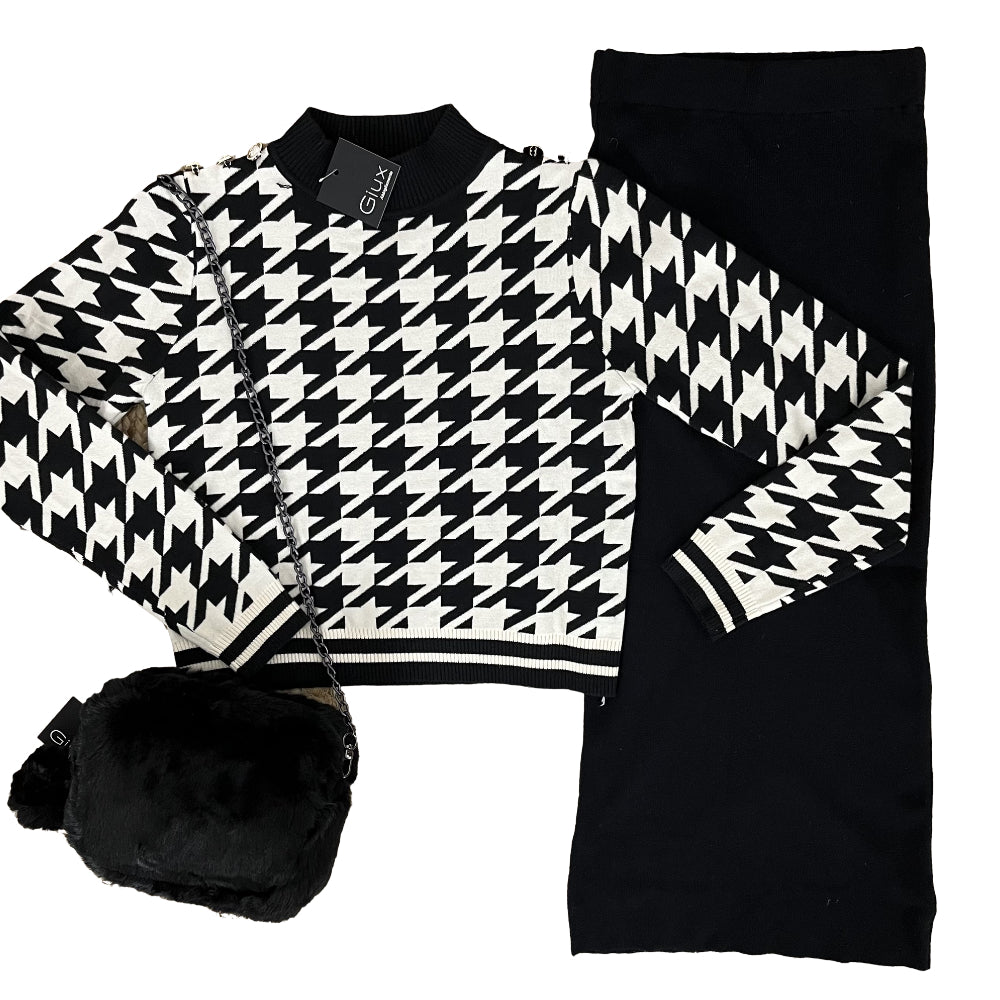 Completo in calda viscosa, gonna a tubino a costine vita alta con elastico. Lupetto fantasia pied de poule, cropped con bottoncini argenti sulle spalle.