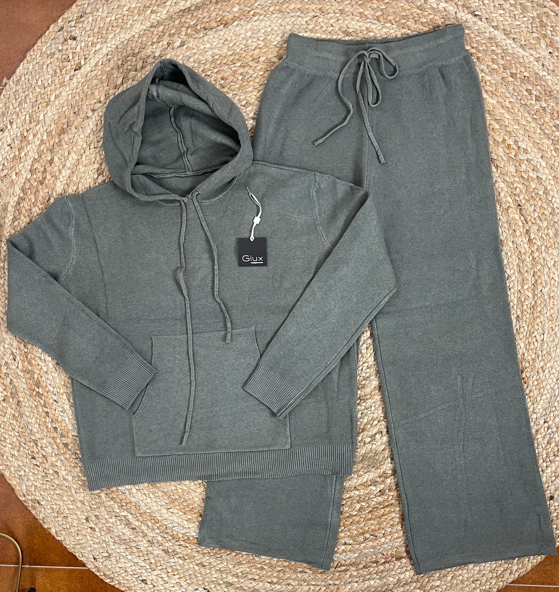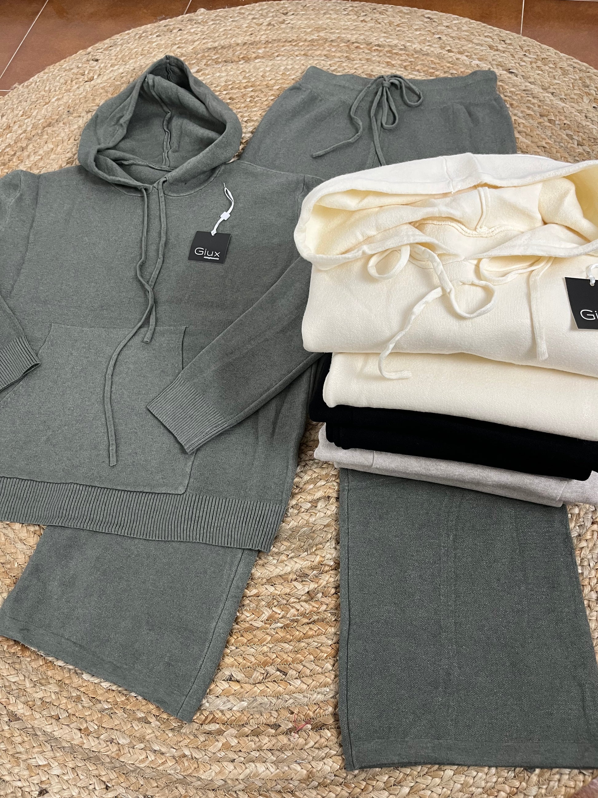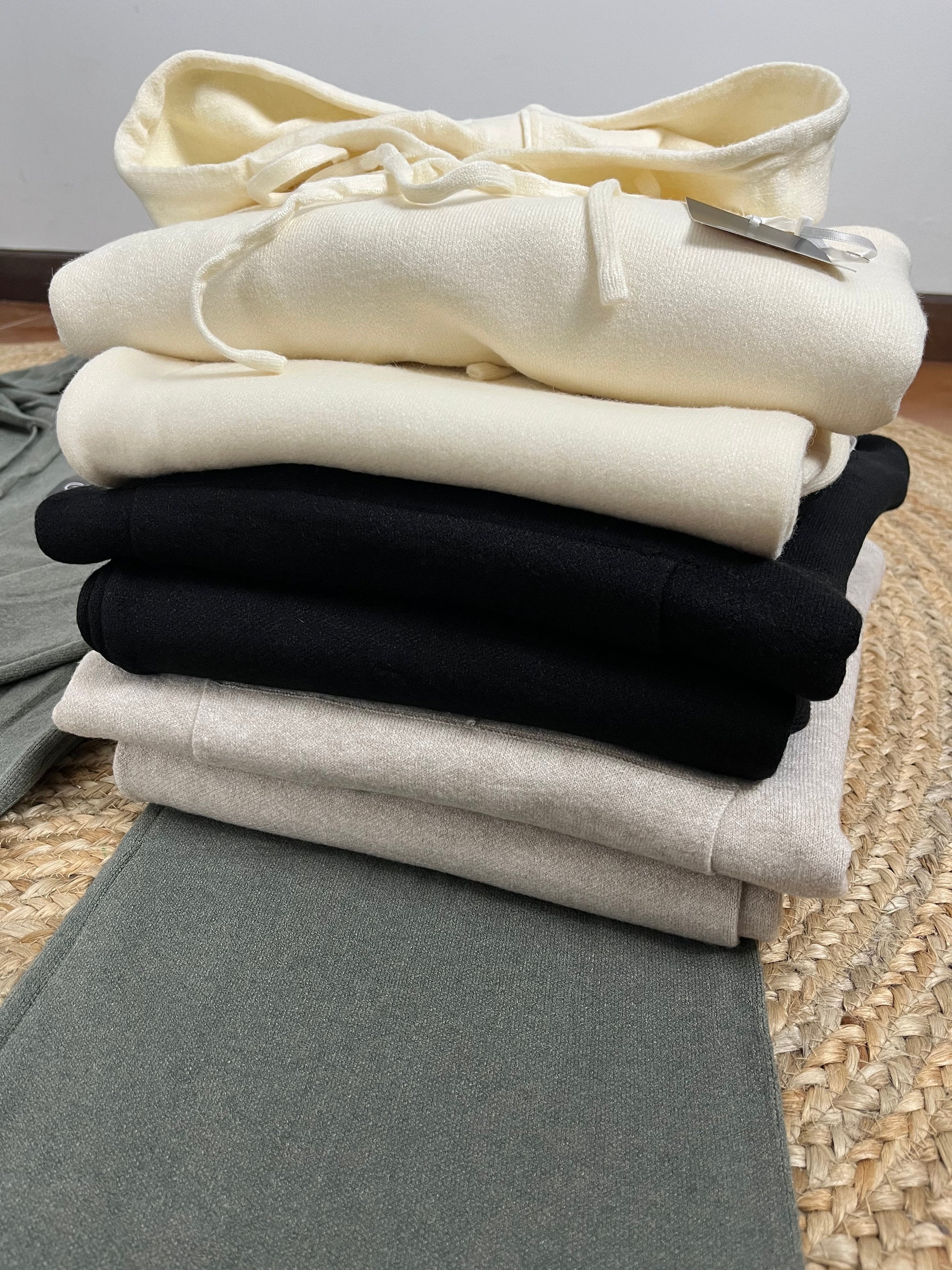 Completo in calda viscosa. Pantalone a palazzo vita alta con elastico e coulisse. Maglia con cappuccio, spalle ribassata. Tascone sul davanti.
