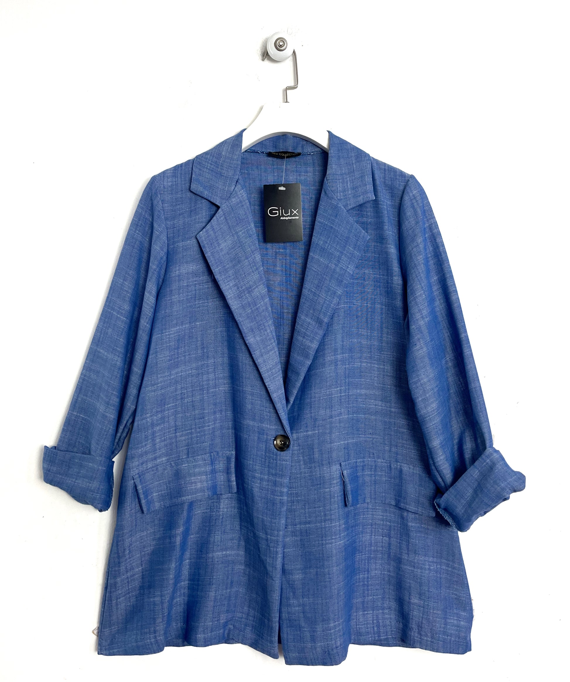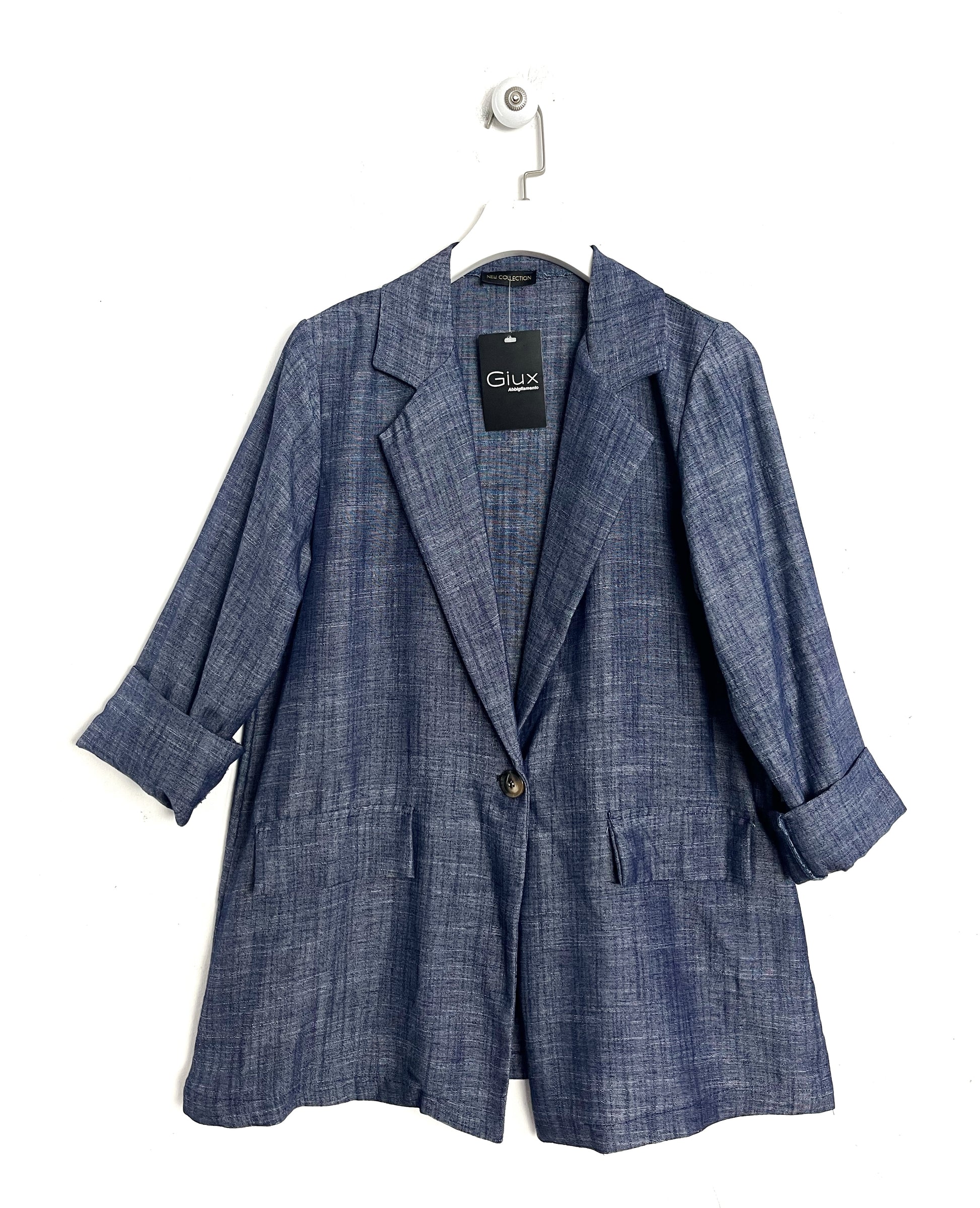 Il blazer è chiuso da 1 bottoncini, tasche finte con patta