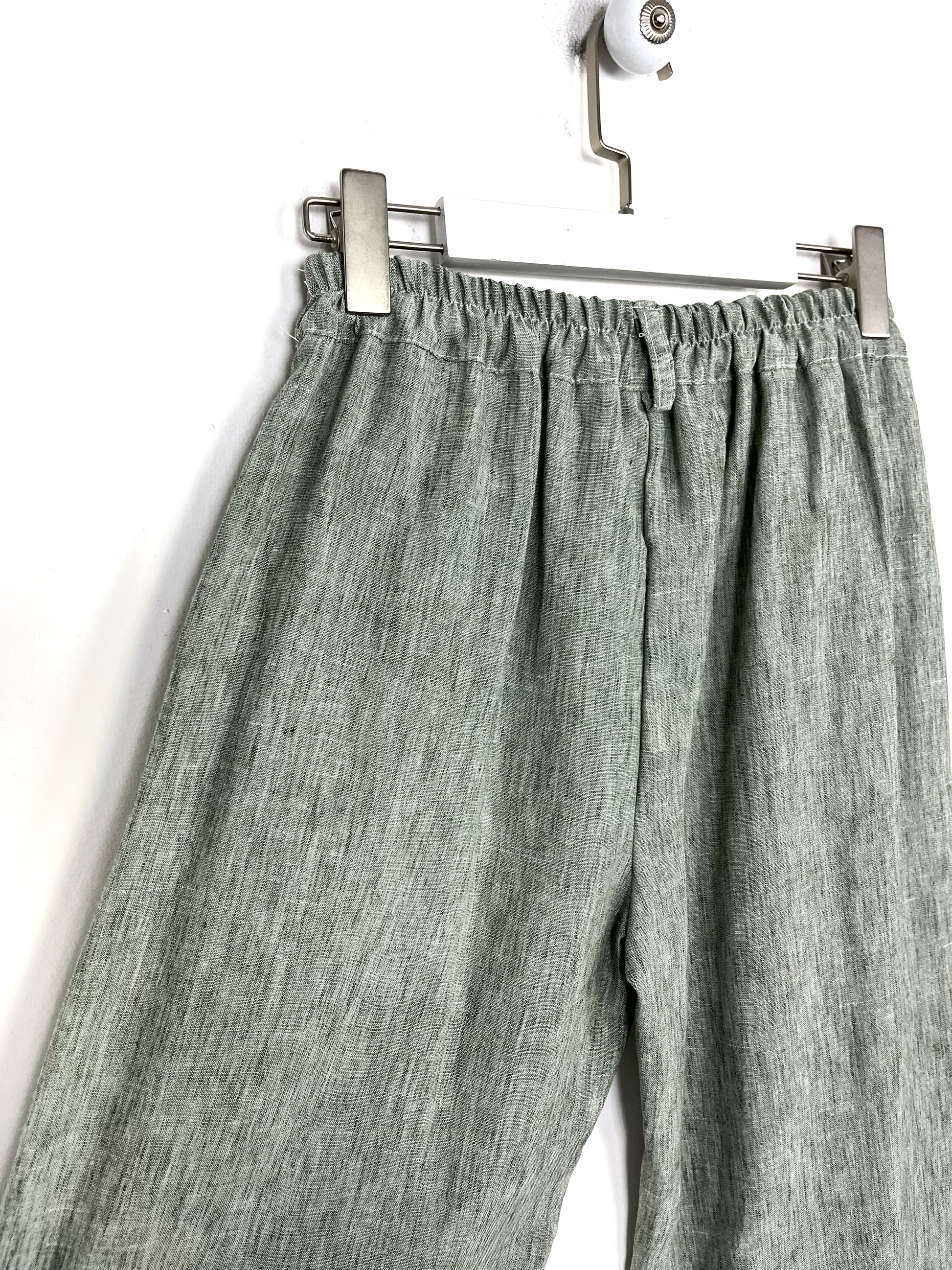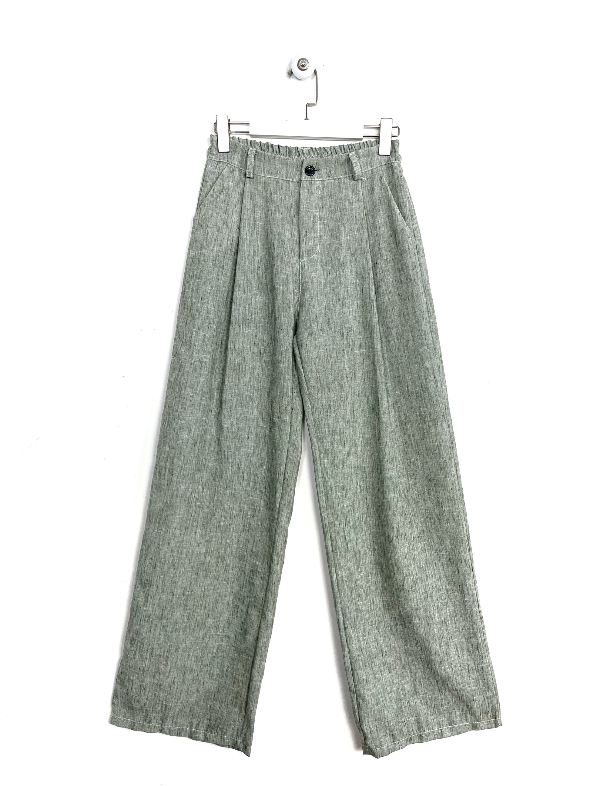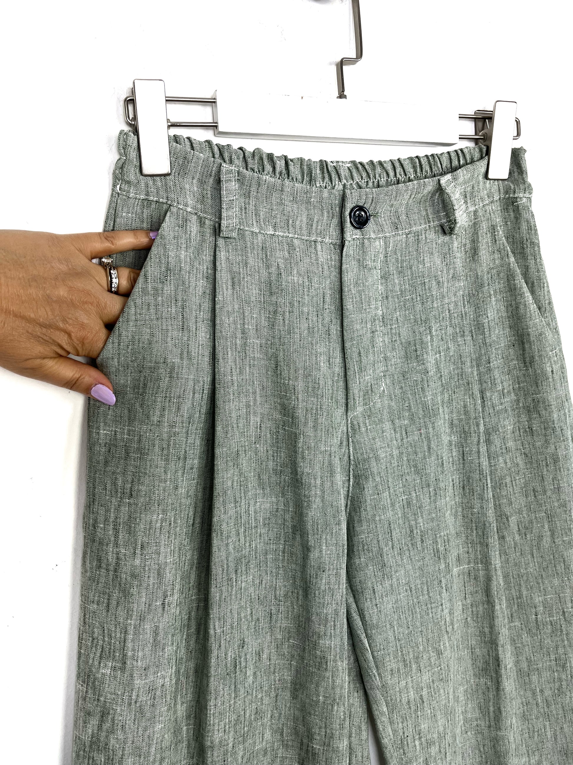 Il pantalone è chiuso da un bottone con cerniera, vita alta con elastico dietro. Pence. Tasche laterali.
