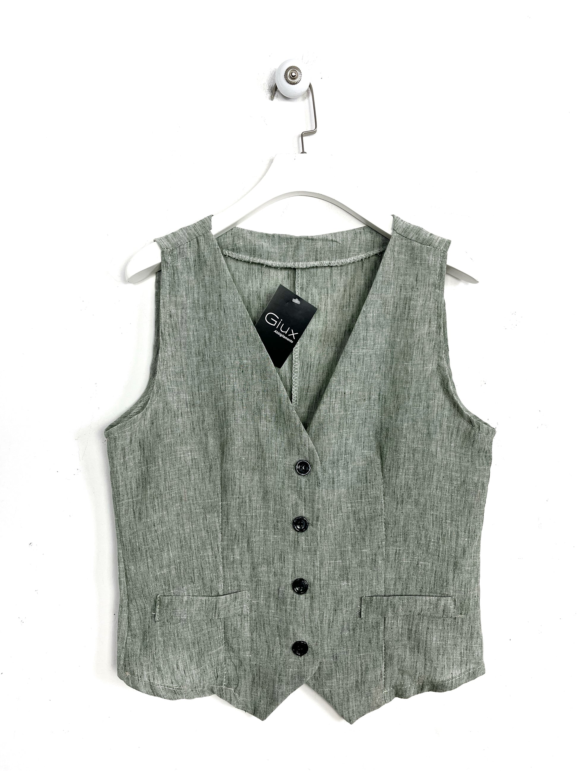 Il gilet è chiuso da 4 bottoncini, Taschine finte a veletta.